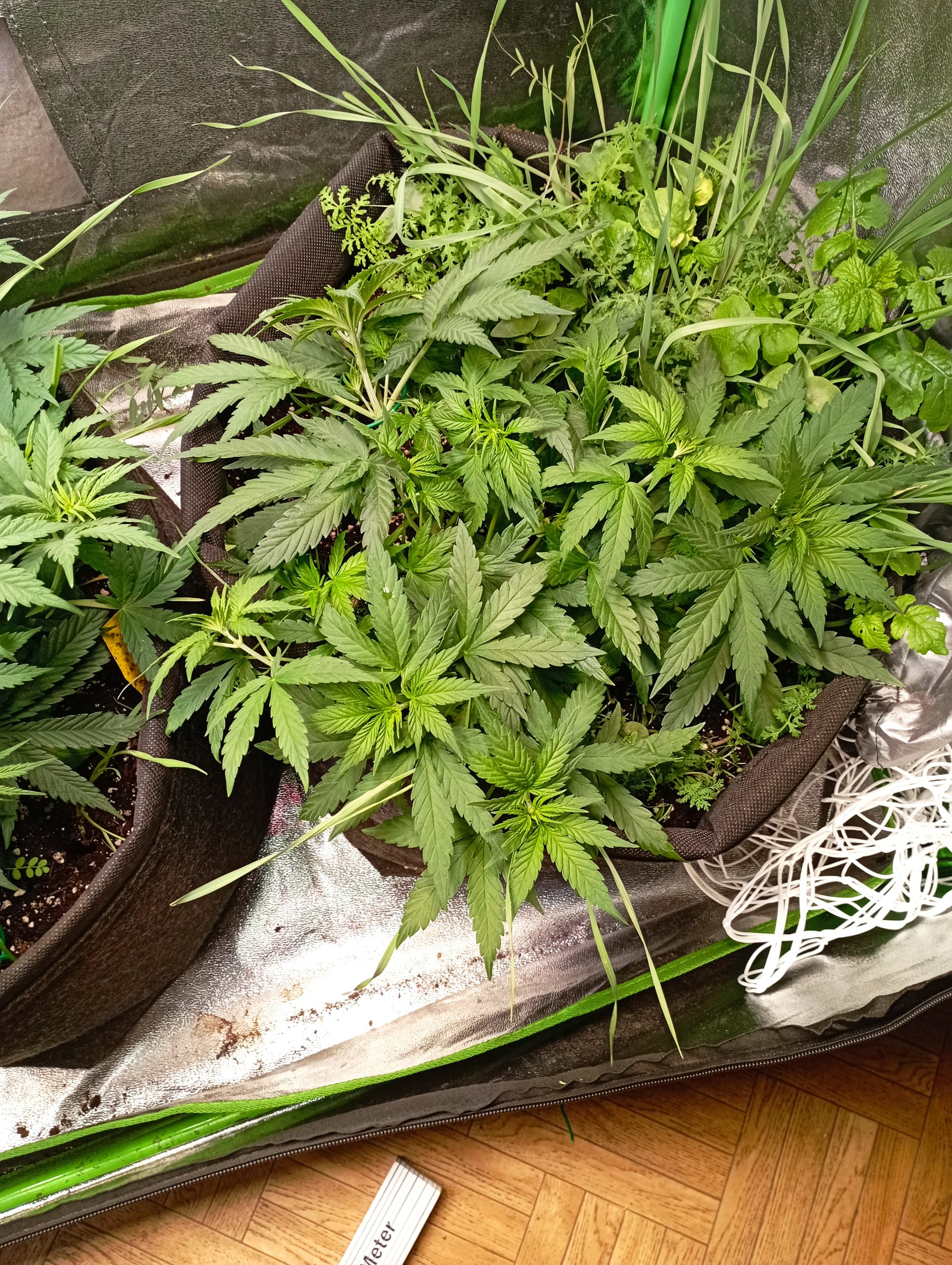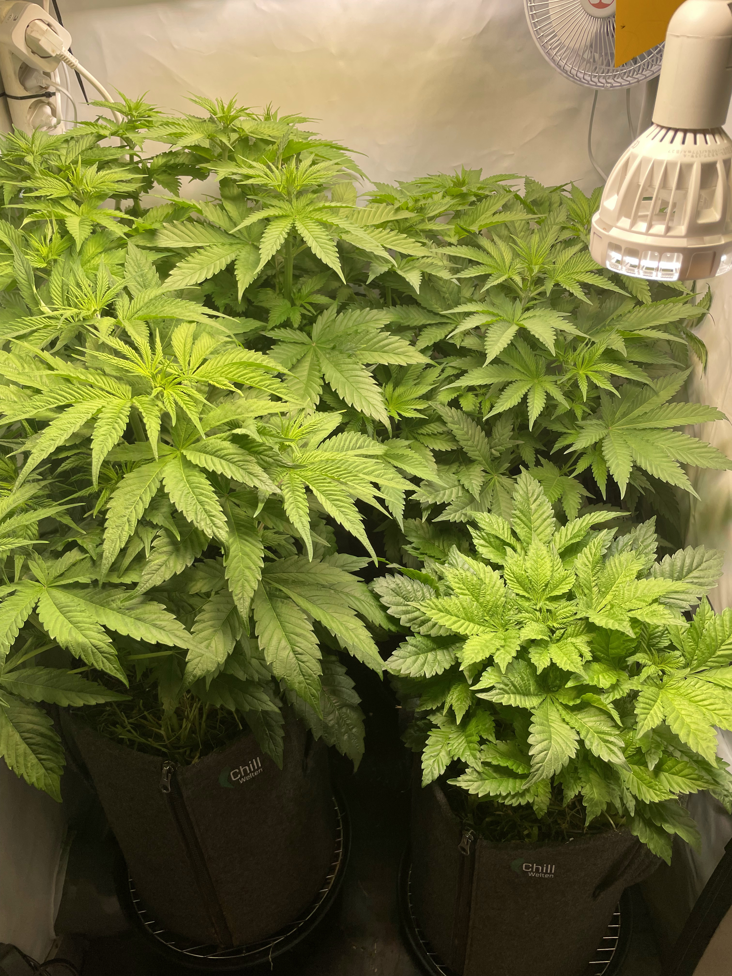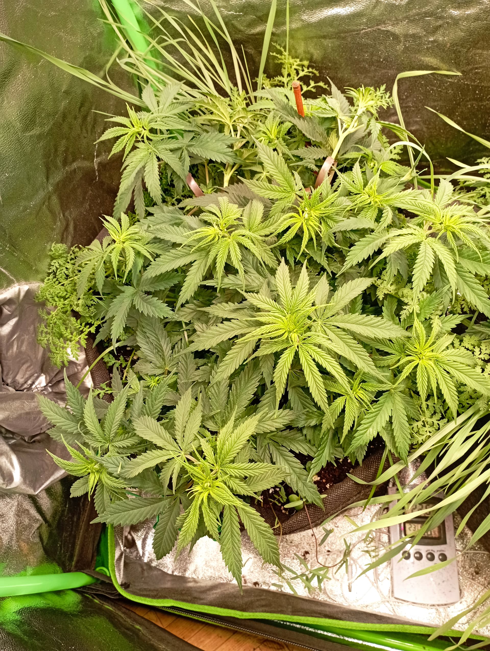 Heute also Blütetag 19 habe ich nochmal drei von 3,5L auf 9L umgetopft. Diese hatten jetzt schon deutliche Mangelerscheinungen. Zu wenig N und Cal/Mag Probleme. Ich bin mir bereits jetzt sicher das die brav weiter Blühen werden und ind den nächsten Tagen die Farbe wieder deutlich besser werden wird. Im Gruppenbild links.