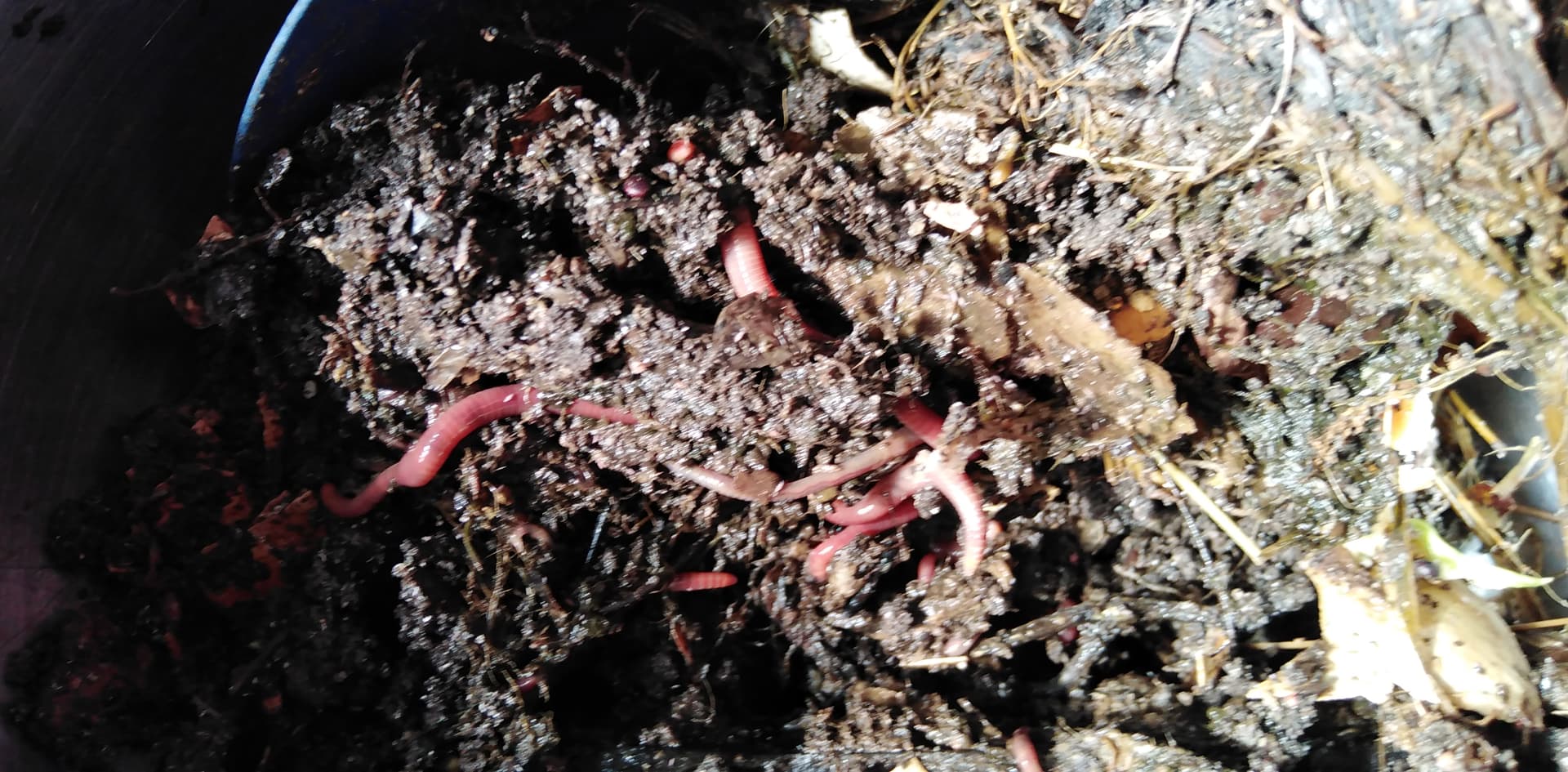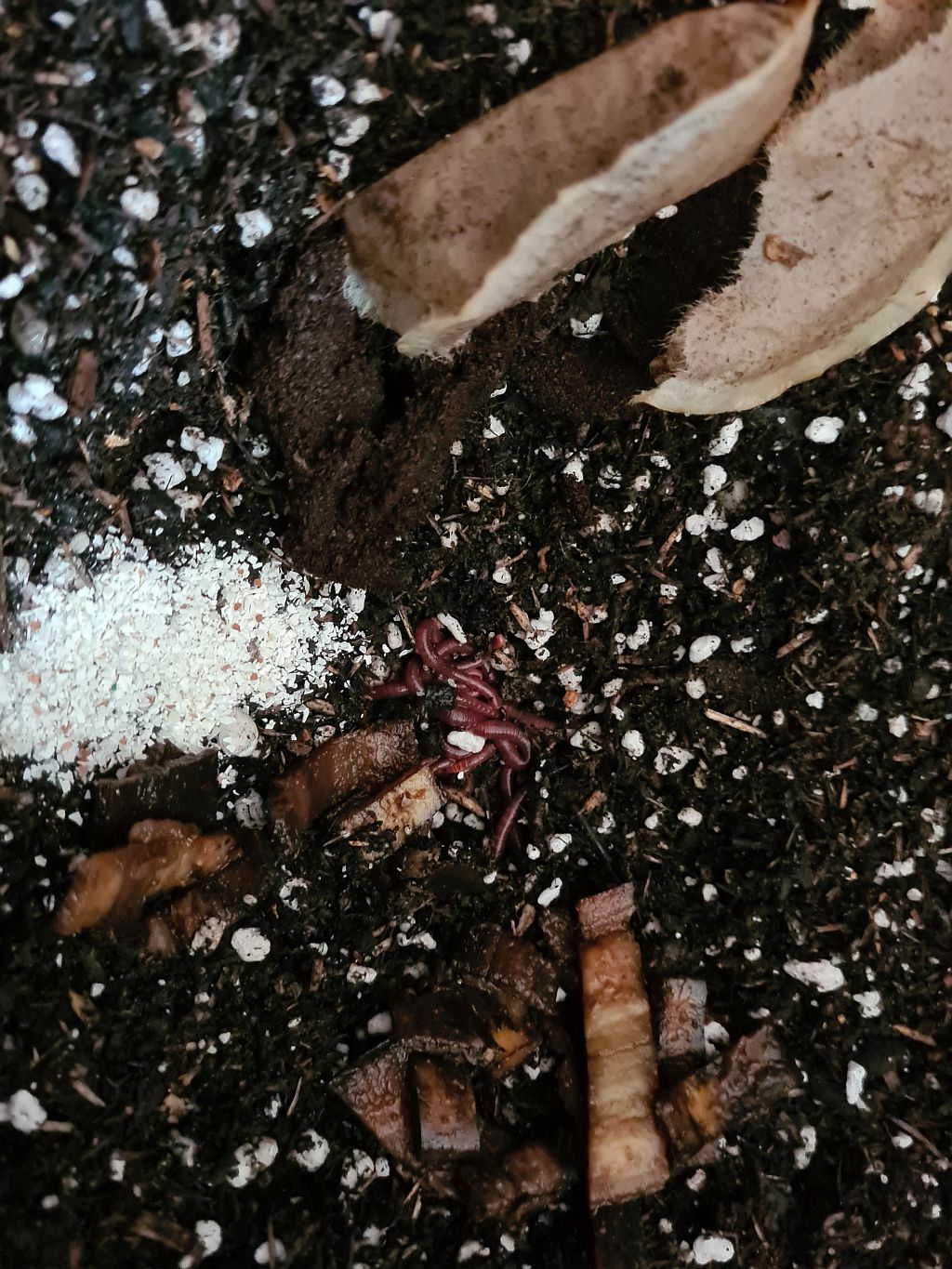 In jeden Teil habe ich einen Schwung Würmli gesetzt und Futter gegeben: Kaffeesatz, Eierschalen und vorfermentierte Bananenschale. Banane lieben die, da ist in der Wurmbox immer Party.