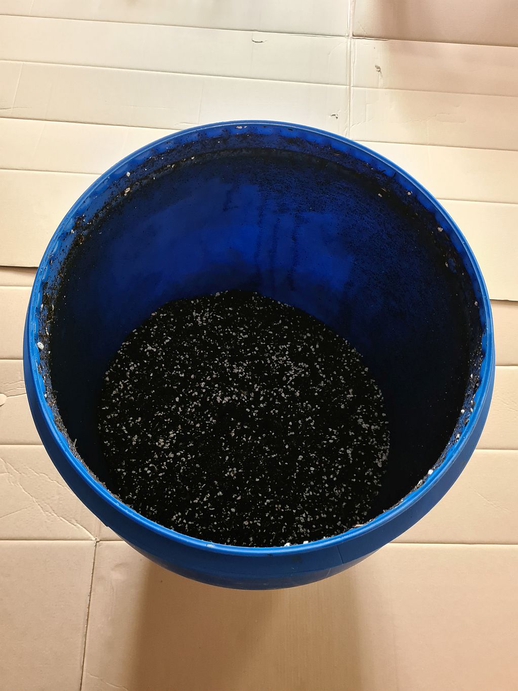 Waren erstmal 50 l. Aber selbst da merkt man: Gar nicht so einfach mit dem Mischen. Da der 60 l Maurerkübel damit zu voll war, habe ich ein 100 l Fass genommen, was ich glücklicherweise noch über hatte.