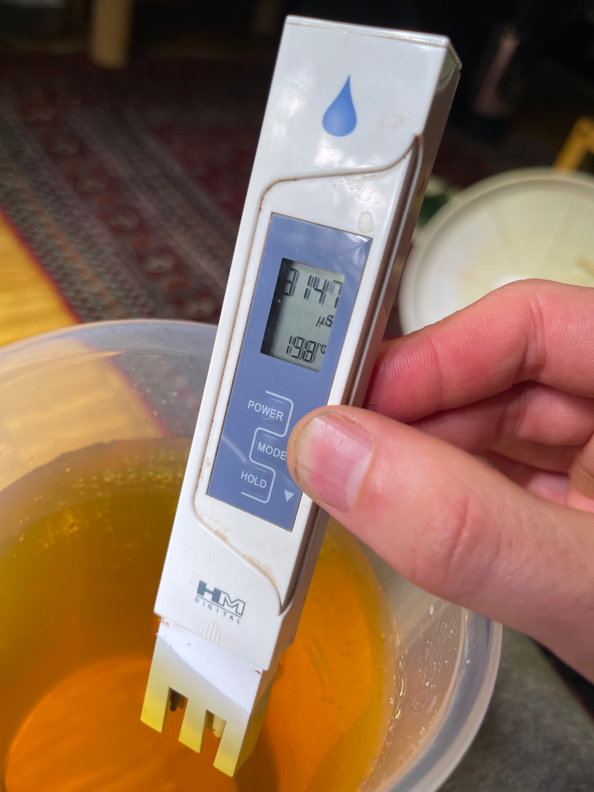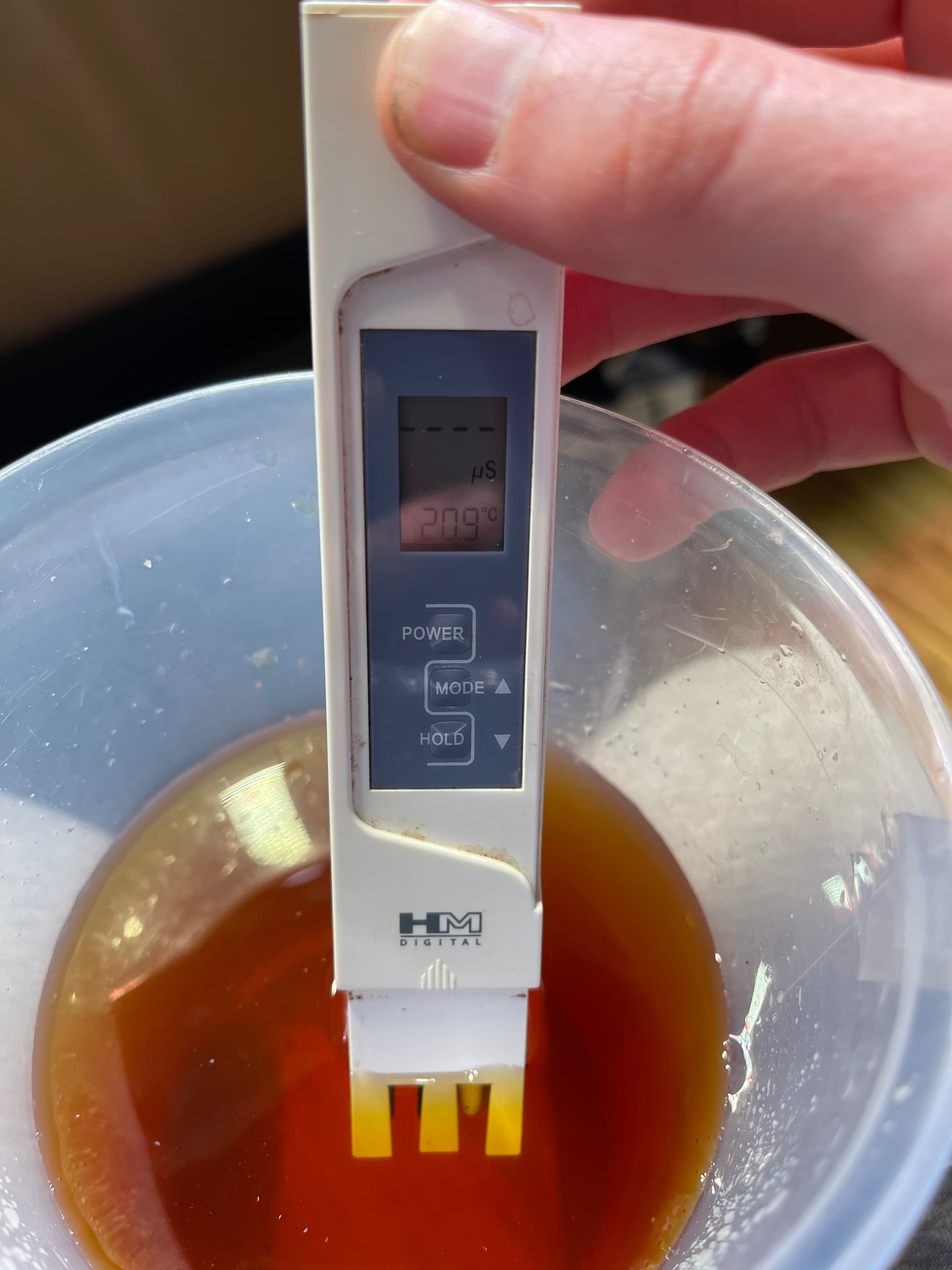 Mein Drain aus der Box hat exakt die selbe Farbe. Ich saug Wasser mit einer Pumpe auf und mische das zum Tomatengiesswasser. Den EC Wert habe ich gar nie versucht zu ermitteln, man sagt ja das der beim organischen Dünger nicht herbeigezogen werden kann. Ich messe bei der Gelegenheit aber den pH Wert. Ist immer bei 6.4-6.8.
