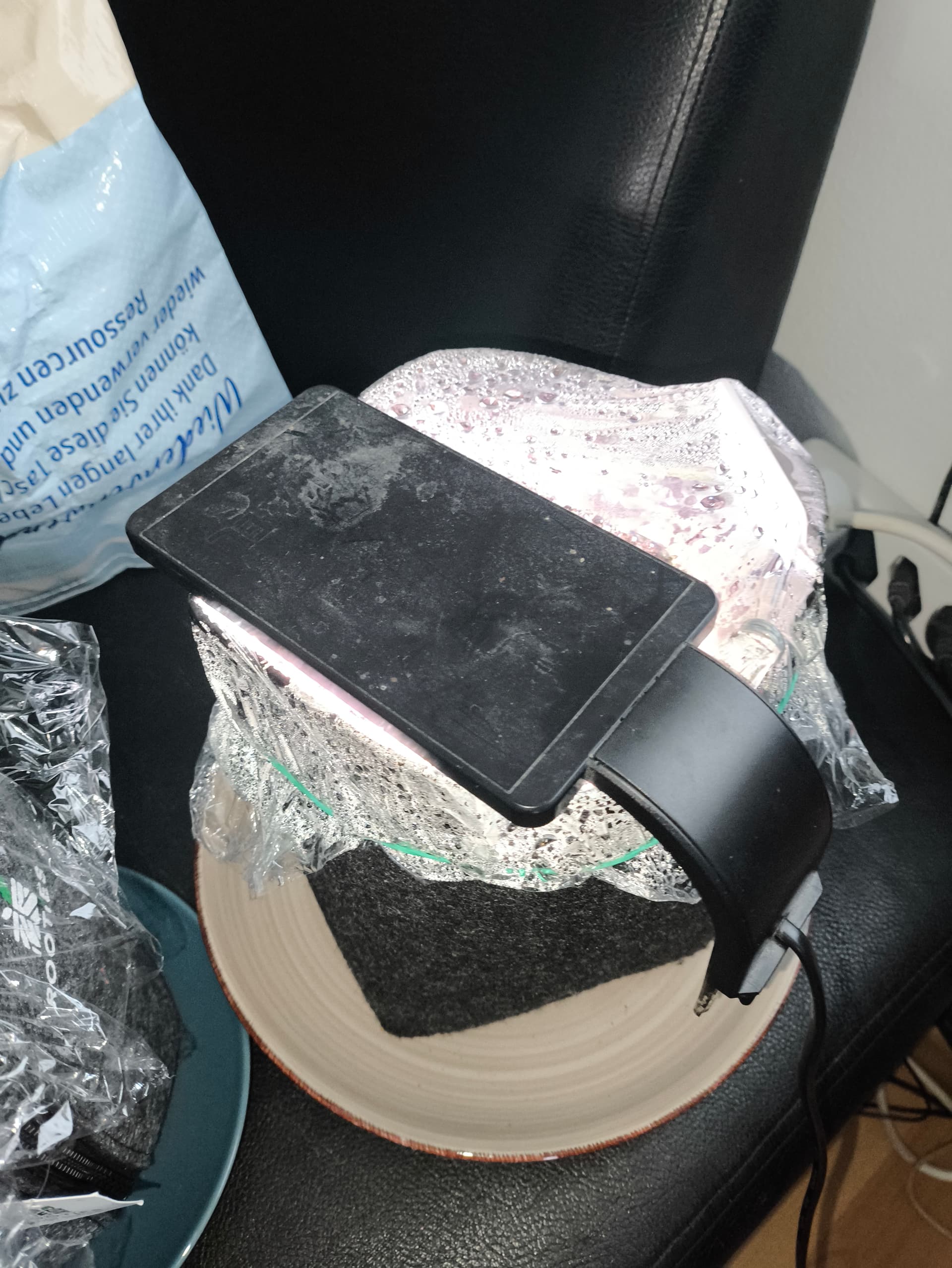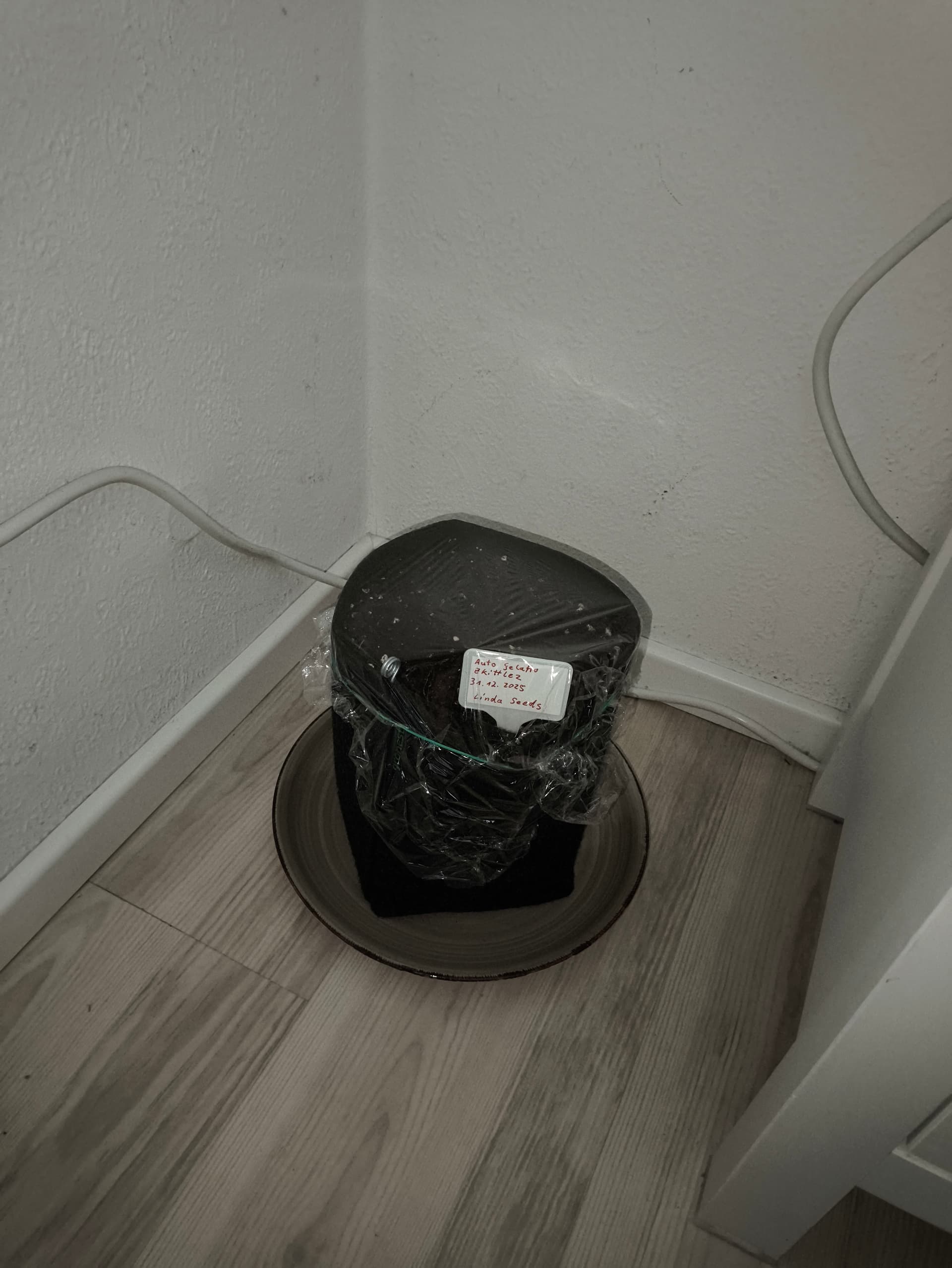 Los ging es heute morgen, Zimmerecke gereinigt Topf fast voll mit dem Light Mix gemacht und mit Ph angepassten Wasser angegossen. In der Mitte des Topfes kleines Loch mitm Finger reingemacht, den Samen rein und mit ca. 1cm Substrat abgedeckt. Alles nochmal gescheit gewässert und mit Frischhaltefolie abgedeckt. Die Lampe läuft noch nicht, wird positioniert und eingeschalten sobald was zu sehen ist. Ich habe vor so regelmäßig wie möglich Updates zu machen. Vielleicht findet ja @GumBud ja den link zur Lampe noch, ich hab die mit Coupon für 13 Taler geschossen.