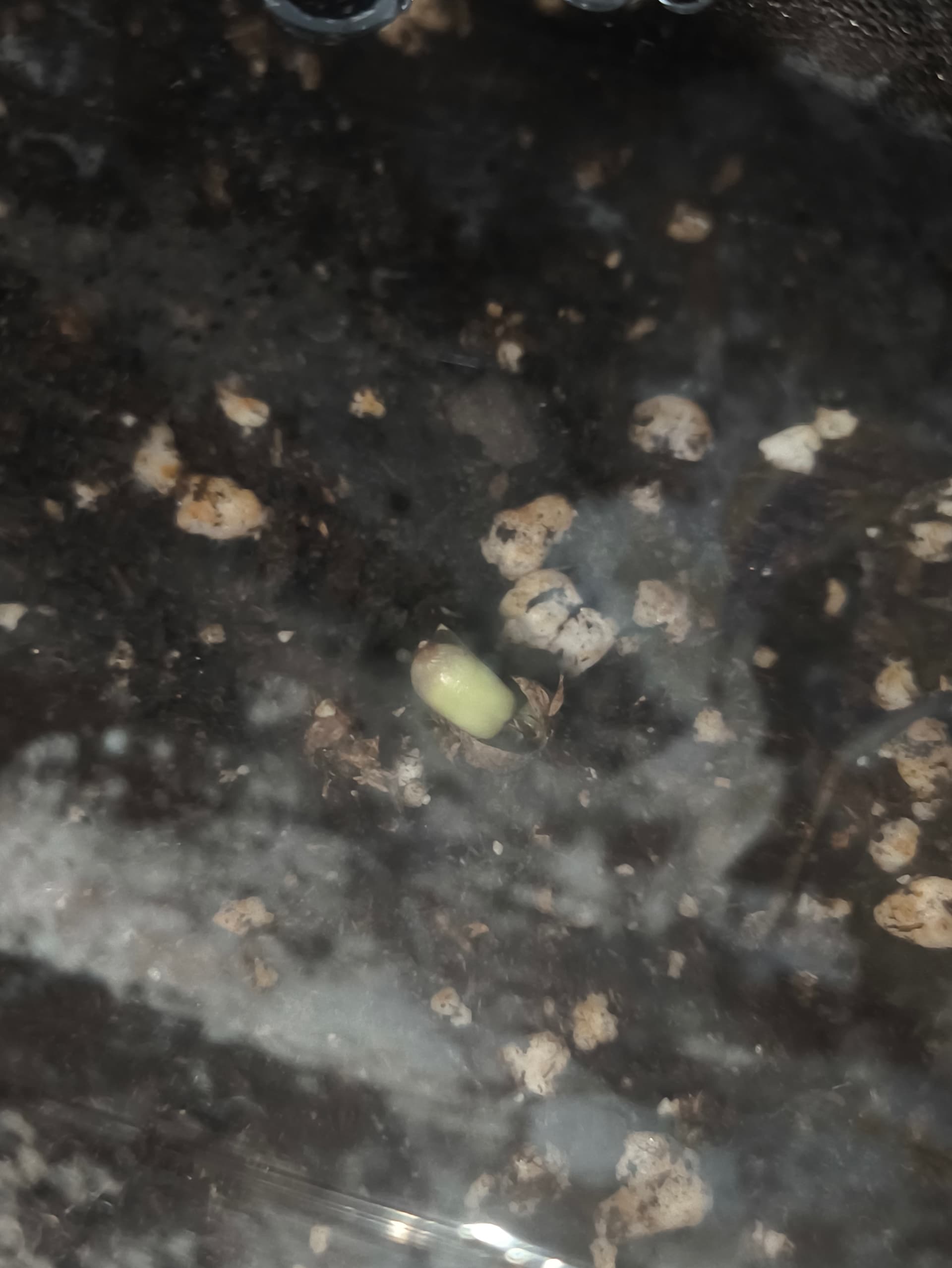 Da sind es so um die 22 Grad und ca. 50 bis 55 Prozent Luftfeuchtigkeit. Ich denke das passt schon so. Achja, ich hatte ja 2 Samen nachgelegt nachdem es die erste umgehauen hat. Da sind natürlich beide gekeimt und den anderen Samen habe ich in einen 3 Liter Topf gebracht quasi als Reserve falls mit der anderen was schief geht.