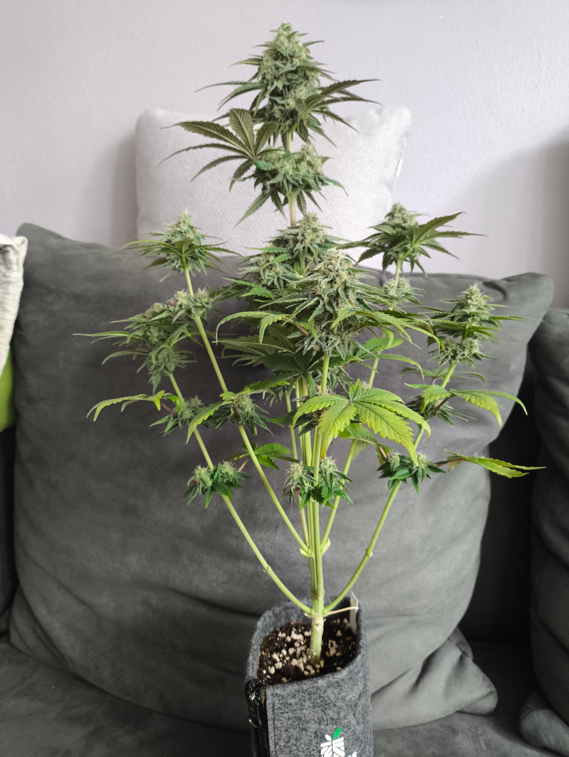 Hey Brudi freut mich sehr das du bei meinem Projekt auch am Start bist . Du hast natürlich völlig recht, hab hier auch top Equipment am Start mit dem ich am growen bin. Das hier soll ja eine Art Spaßprojekt sein bei dem am Ende trotzdem brauchbares weed rauskommen soll. Natürlich zeige ich gerne die eine Pflanze die jetzt gerade im Glas ne Woche am curen ist. Ich hatte einen Grow am laufen in der Blüte Phase auf 12/12. Da habe ich nen 1 Liter Stoffi genommen, einen Seed L.A. Cush cake in Light Mix und mit ins Blütezelt gestellt. Ging dann auch auf und am Anfang ist die relativ langsam gewachsen was auch ein wenig logisch ist bei nur 12h Licht. Nach so ca. 2 Wochen hat man die Vorblüte gesehen. Zu dem Zeitpunkt ist der eigentliche Grow in die Hose gegangen und ich habe den abgebrochen und das Zelt abgebaut. Die kleine Lady stand dann noch rum aber in ein Zelt durfte die nicht rein weil nicht sicher war ob sie auch Mehltau bekommt. Sterben lassen wollte ich sie auch nicht. Ich habe von Amazon so ganz billige Lampen 2 Stück gehabt GroCruiser EU-Eurostecker Pflanzenlampe Schreibtisch LED Vollspektrum, 2000 Lumen UV-IR Vollspektrum Pflanzenlicht für Zimmerpflanzen, Wachstumslampe für Pflanzen, Daisy Chain Funktion : Amazon.de: Garten da hab ich die in ne Ecke gestellt mit den Lampen. Hier und da mal mit Hesi gedüngt ohne wirklich zu wissen was ich da mache, war bisher nur organisch unterwegs. Der Duft hat mich gar nicht gestört, im Gegenteil. Die roch richtig geil . Und meiner Meinung nach ist sie für so ein Schicksal ein kleines ca 35cm hohes Mädel geworden von der ich genau 25 Gramm trocken geerntet habe.