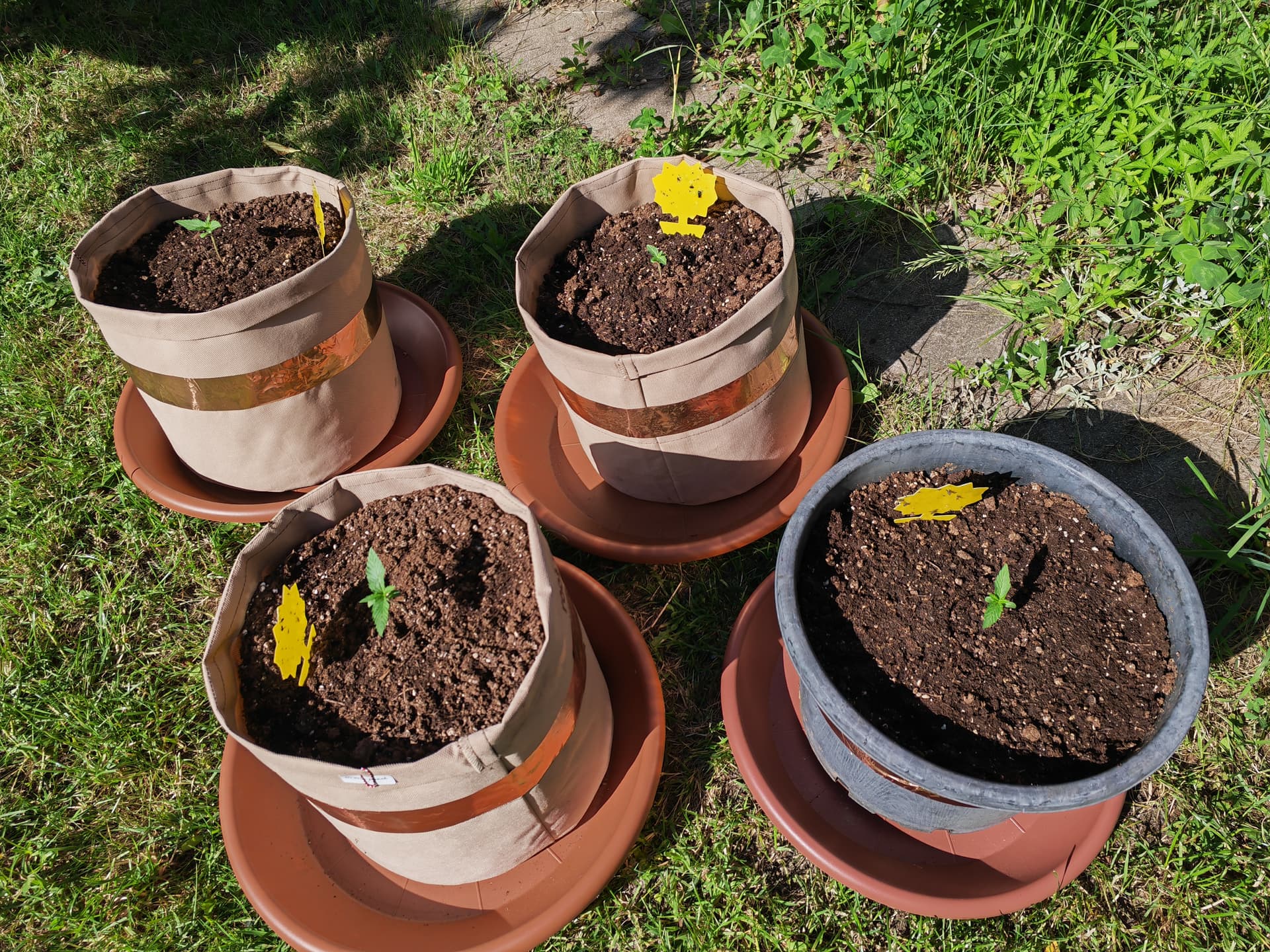 Ich habe jetzt die Stofftöpfe etwas umgekrempelt, hier hab ich mir etwas Spiel gelassen um evtl. noch aufzufüllen. Im Moment ist das Wetter echt bescheiden und ich nehme die 4 Ladys nachts noch rein. Tags lasse ich sie auch noch unter einer Lampe. Diese ist zwar zu schwach für die vier, aber besser als dieses aktuelle Wetter…denke ich zumindest.
