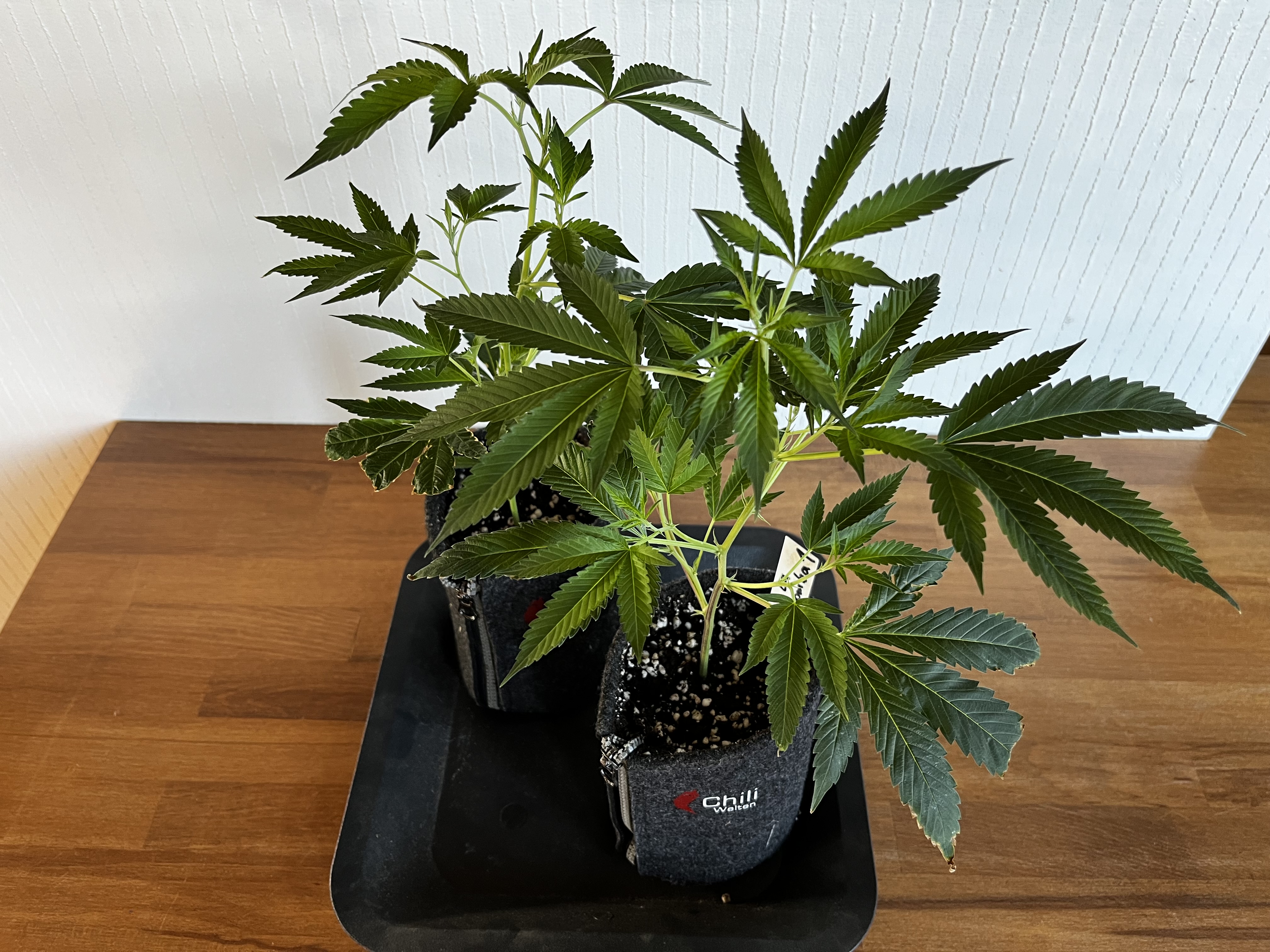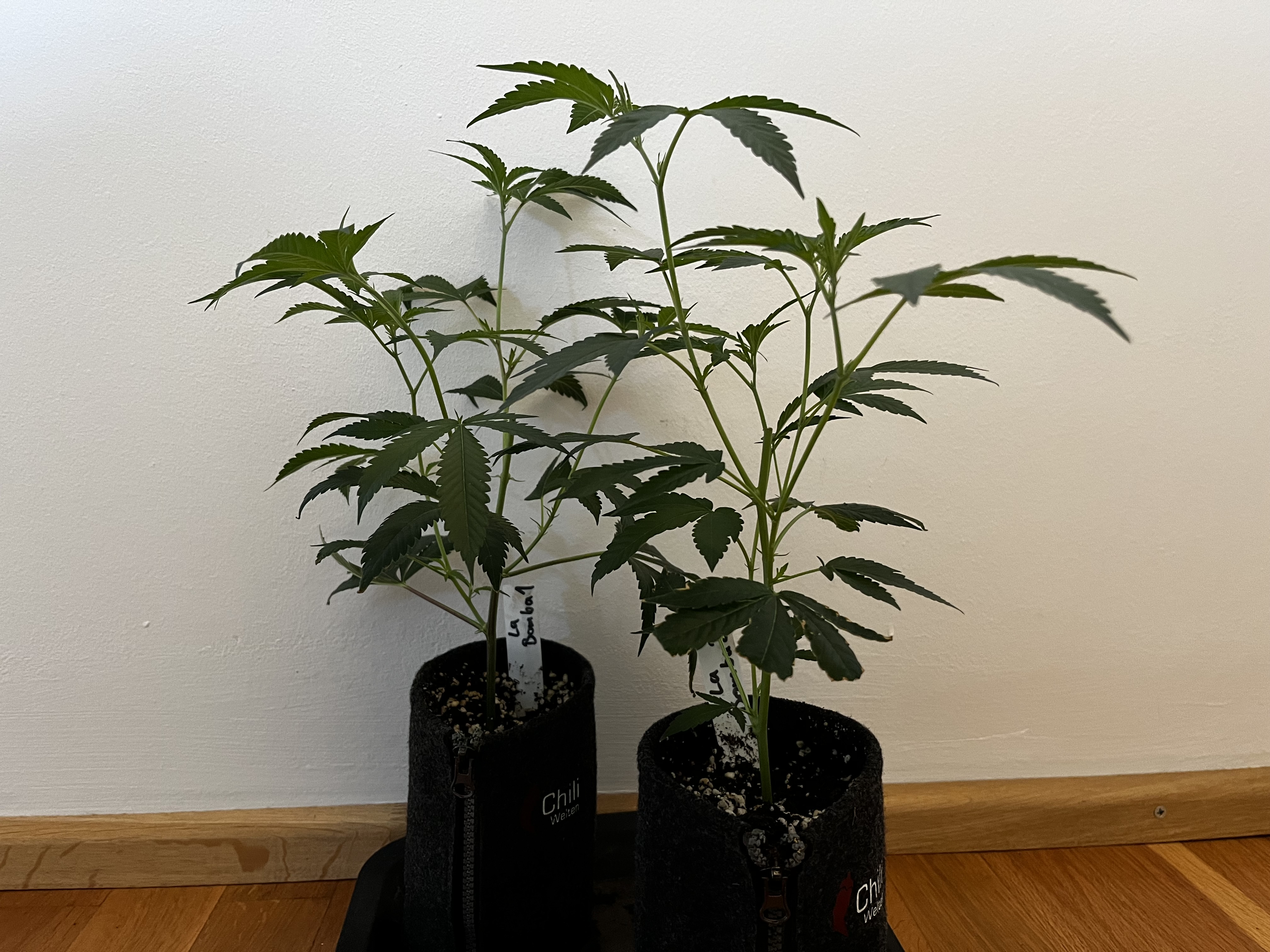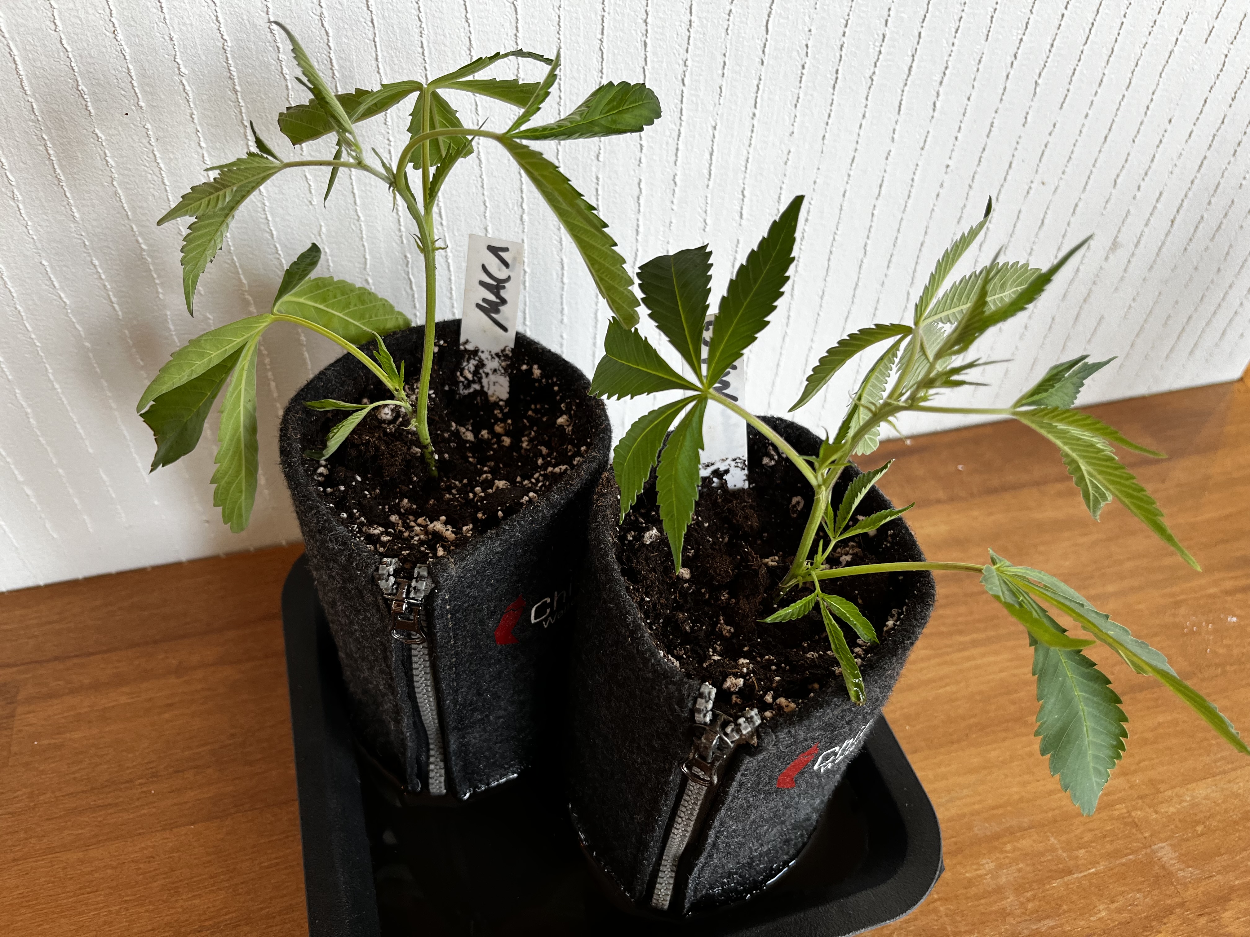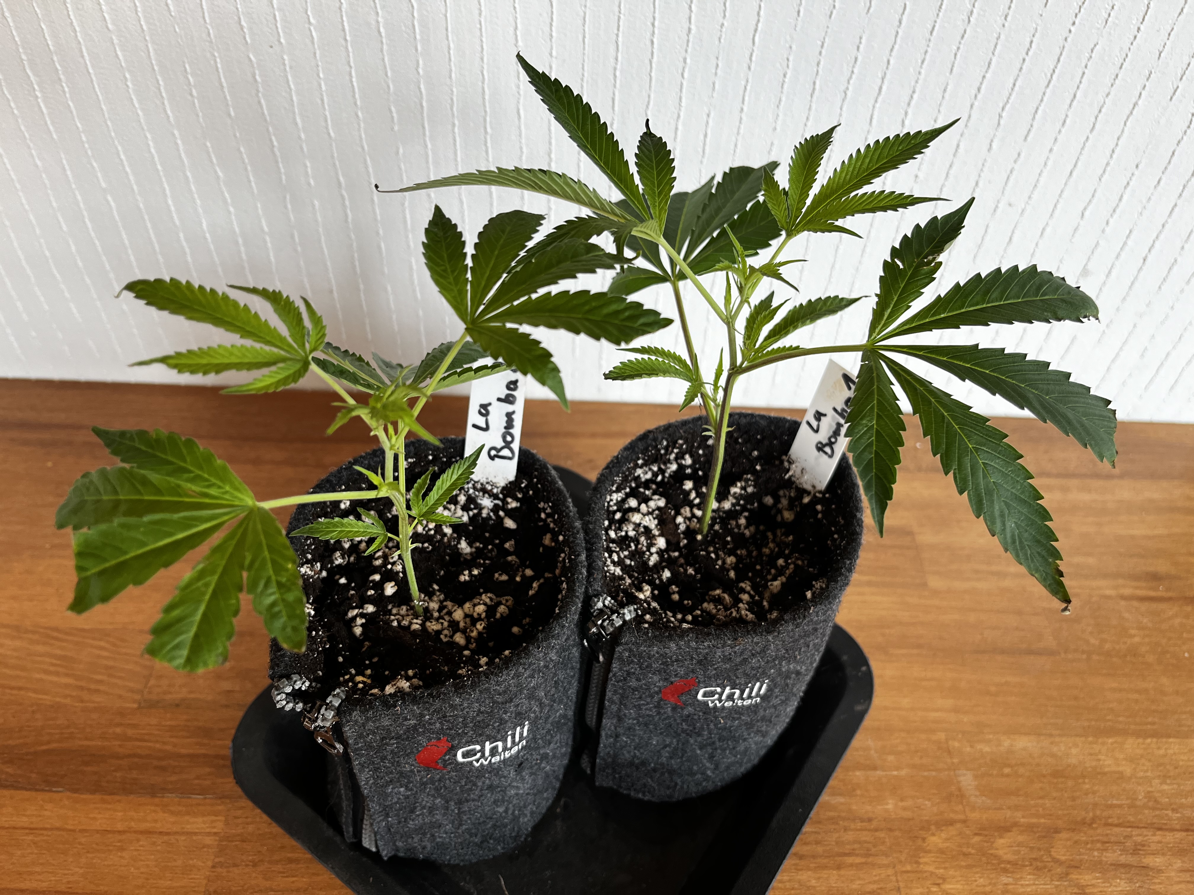 Die kleinen wurden mal in 1L Stofftöpfe eingetopft und werden gehalten bis der erste Testjoint von beiden Sorten brennt.