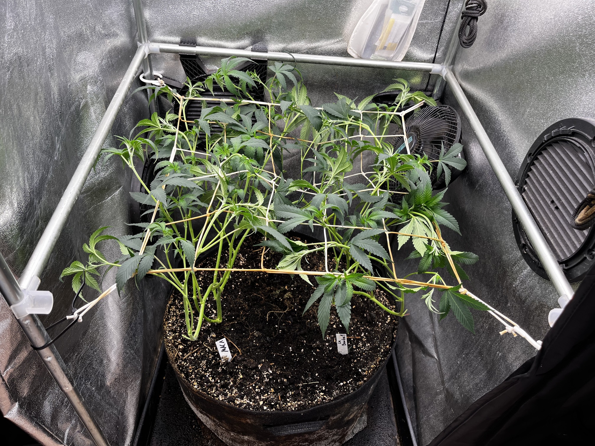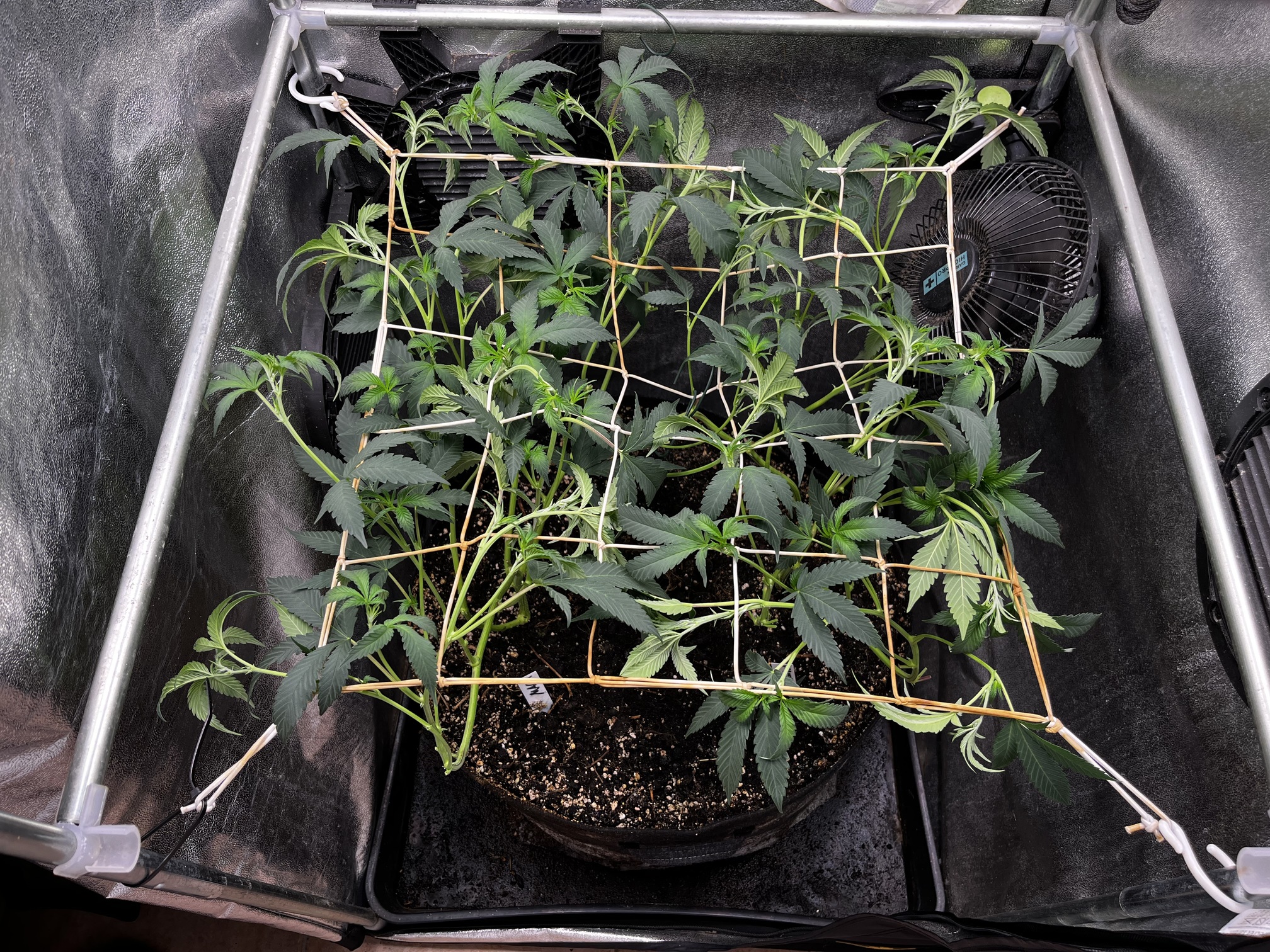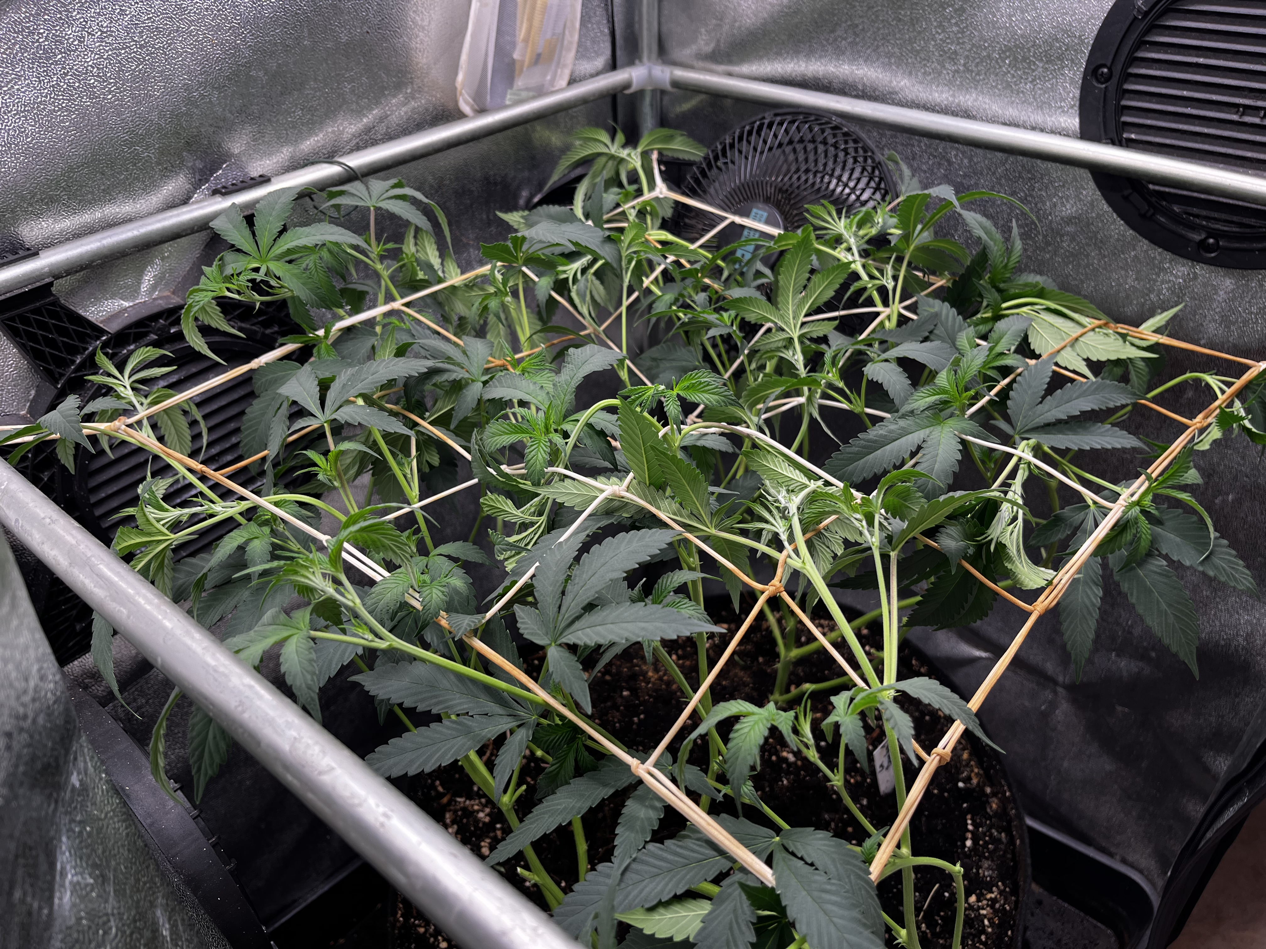 Die erste Lage Netz wurde mal installiert, die Pflanzen hinein verteilt und untenrum ein wenig die kleinsten Triebe weggenommen. Gefällt mir gut! Die beiden Strains scheinen auch relativ ähnlich zu wachsen und beginnen schön langsam umzustellen. Dann schauen wir uns mal die Blüten an!