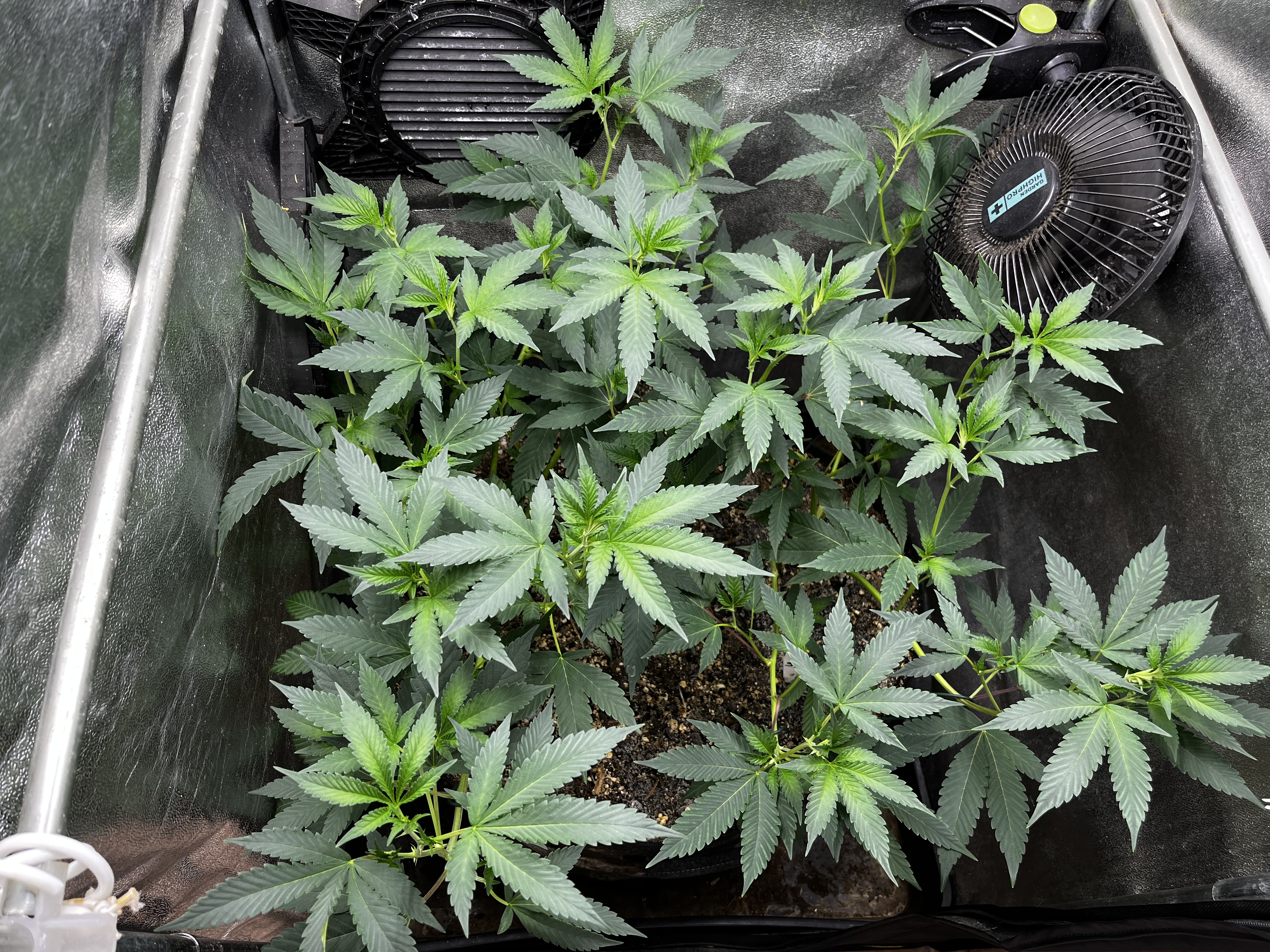 Von allen vier Pflanzen wurden vor ein paar Tagen Stecklinge genommen und dürfen aktuell anwurzeln. Sichtbare Wurzeln gibt’s noch nicht, aber die machen einen recht guten Eindruck. Gelassen wurden ihnen jeweils 4 Triebe zum Austreiben. In 3-4 Tagen wird umgetopft und das Gruppenkuscheln in der Anzuchtbox nimmt sein Ende. Sonst wär’s das schon wieder, Nährstoffe können sie gut ab anscheinend, hab extra mal recht hohe N Werte beim Umtopfen getestet.
