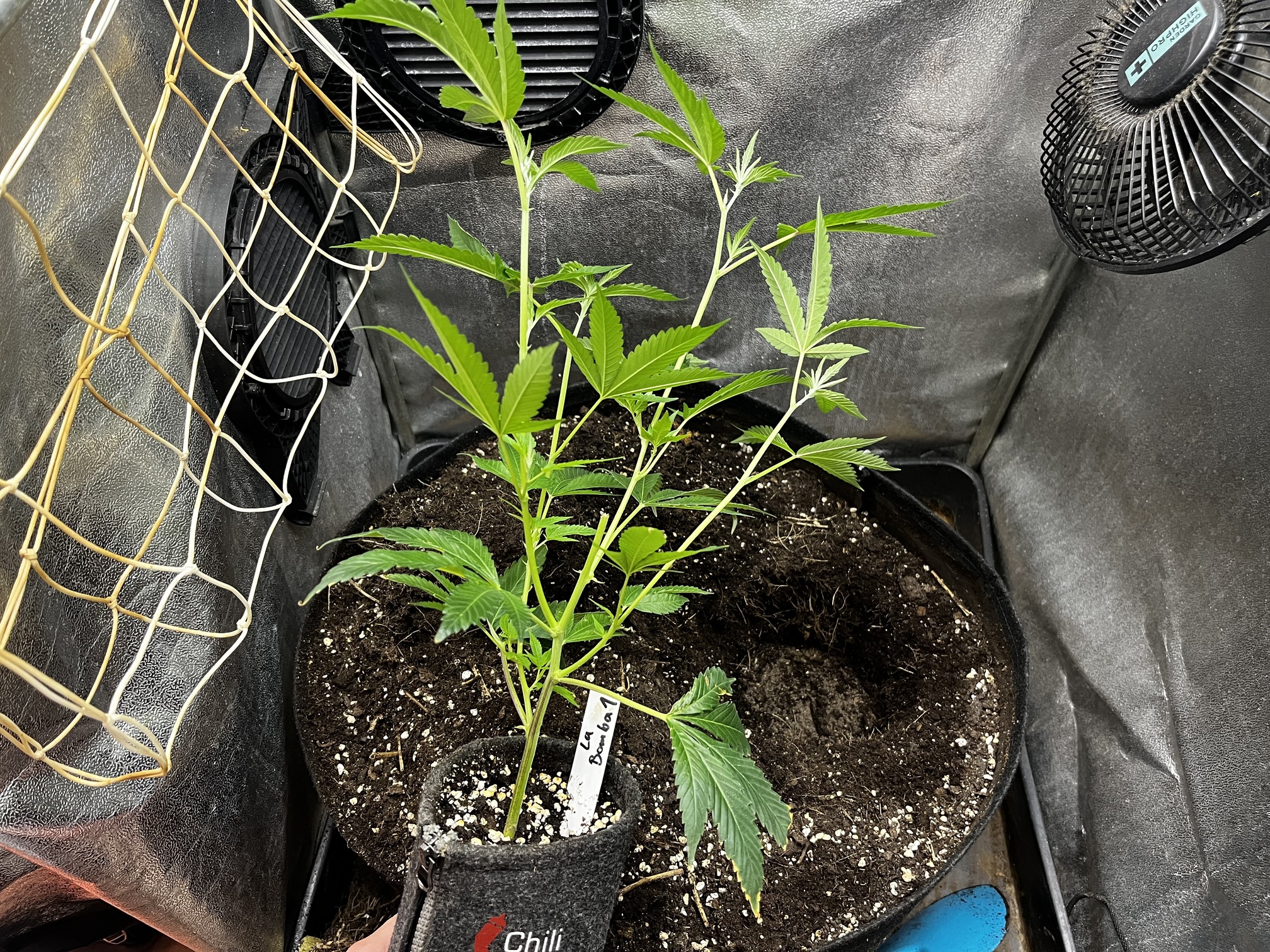 Wenn der Stretch dann beginnt, wird gleich das erste Netzlayer eingefädelt und bei Bedarf oben ein zweites nachgelegt. Nährstoffe knallen immer noch gut und genau richtig erkannt @zerozerodotcom, die Erde ist am Leben und die Oberfläche teils voll Myzel!