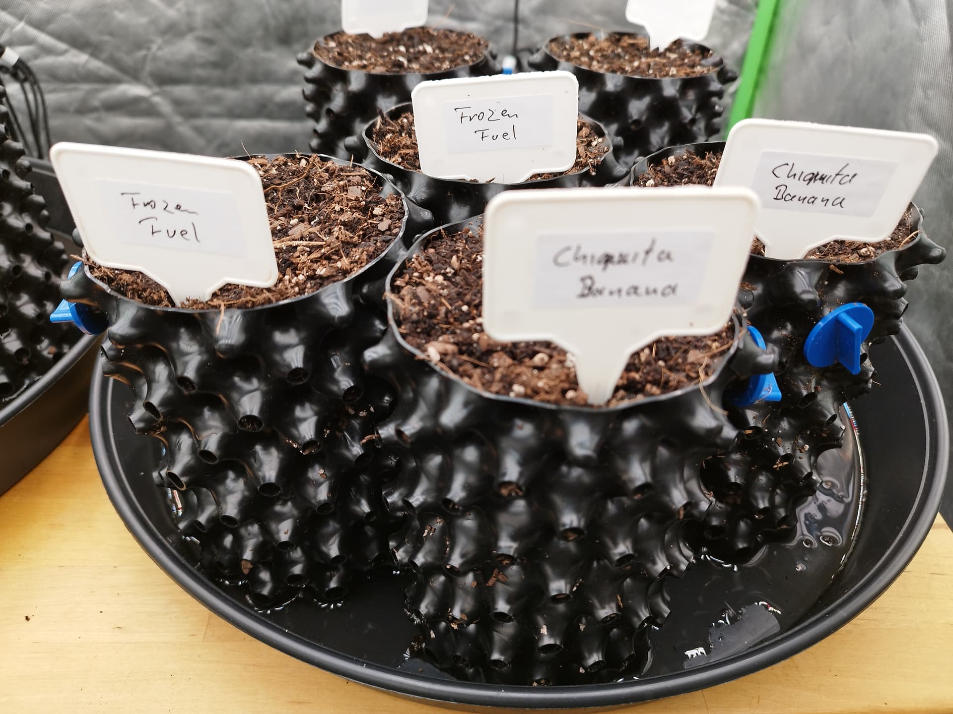 Nach ca. 12-14 Tagen werden sie direkt in ihre 10L Stoffis gesteckt. Geplant ist alle zu toppen und 5/6 Nodien stehen zu lassen mit LST, notdürftig zu entlauben + später lollypoppen.