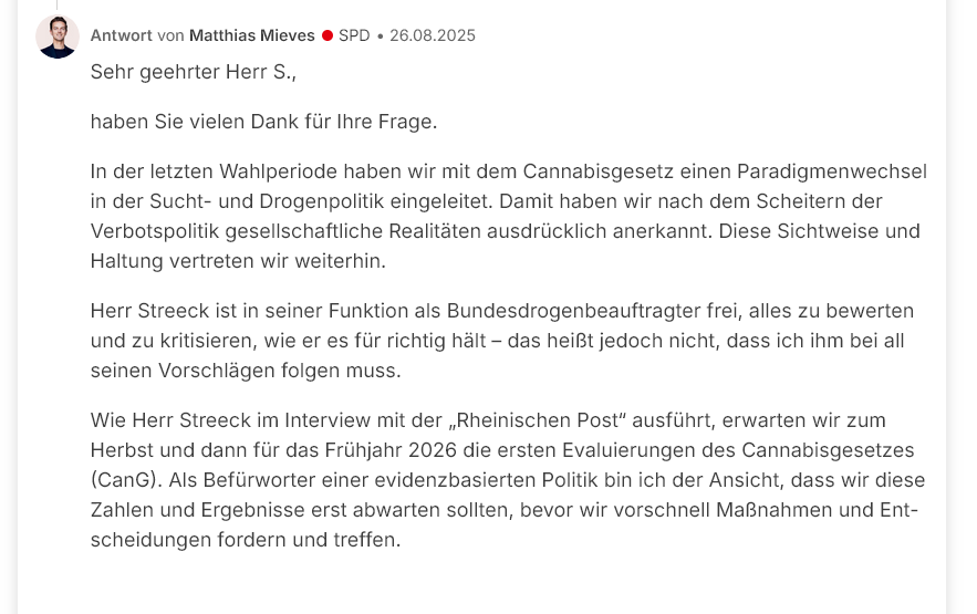 Das ist eine ziemliche Wischiwaschi Antwort und deutet darauf hin, dass die SPD nicht mehr hinter dem CanG steht, so wie es beschlossen wurde.