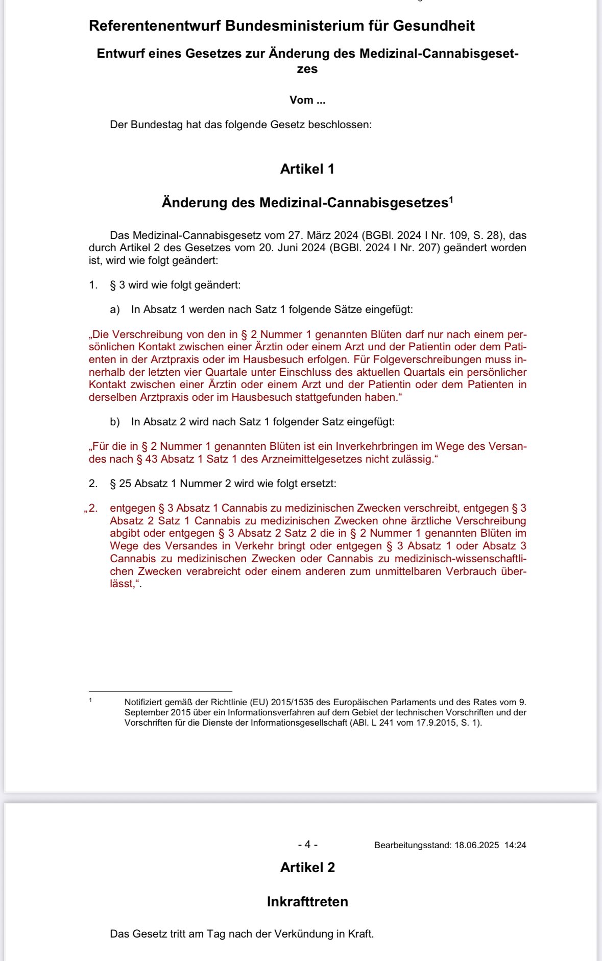 das Bundesgesundhei5sministerium möchte Telemedizin einschränken bzw. Verschreibung nur nach persönlichen Kontakt und Kein Versand mehr. Quelle: https://www.lto.de/recht/hintergruende/h/bmg-gesetzentwurf-medizinal-cannabis-verschreibung-arztbesucht.