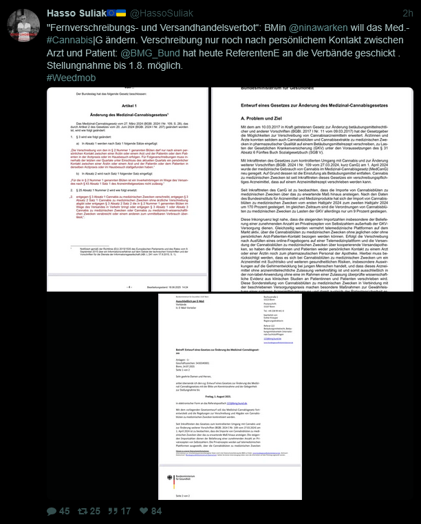 Das Gesundheitsministerium unter der neuen Unions-Ministerin Warken hat nun einen Gesetzentwurf vorgelegt, der auf den Anstieg der Importe von medizinischem Cannabis reagieren soll. Laut dem BMG sei dieser vor allem auf die verstärkte Nutzung von Privatverschreibungen für Selbstzahler über Onlineplattformen, ohne dass es einen Arzt-Patienten-Kontakt gegeben hätte, zurückzuführen. Deshalb wird von einem Missbrauch von Medizinal-Cannabis ausgegangen. Das Ministerium hat erklärt, dass es aus PatientInnenschutz Beratung vor der Einnahme sicherstellen und deshalb den Online-Handel einschränken will.