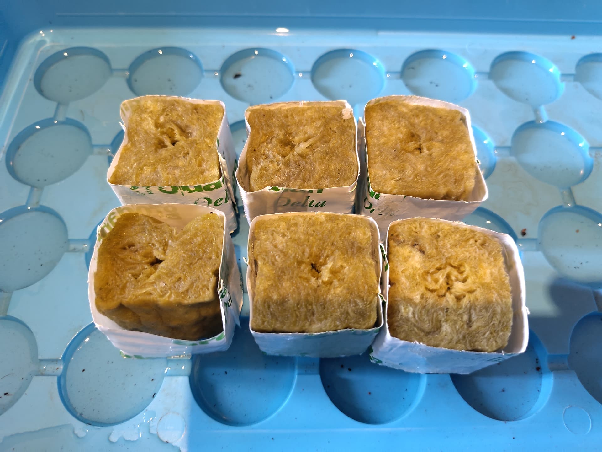 Heute geht es endlich weiter. Ich habe mich bei der Anzucht noch spontan umentschieden und nehme anstatt der Kokostabs kleine Steinwollewürfel. Dann bin ich beim Substrat 100% mineralisch.