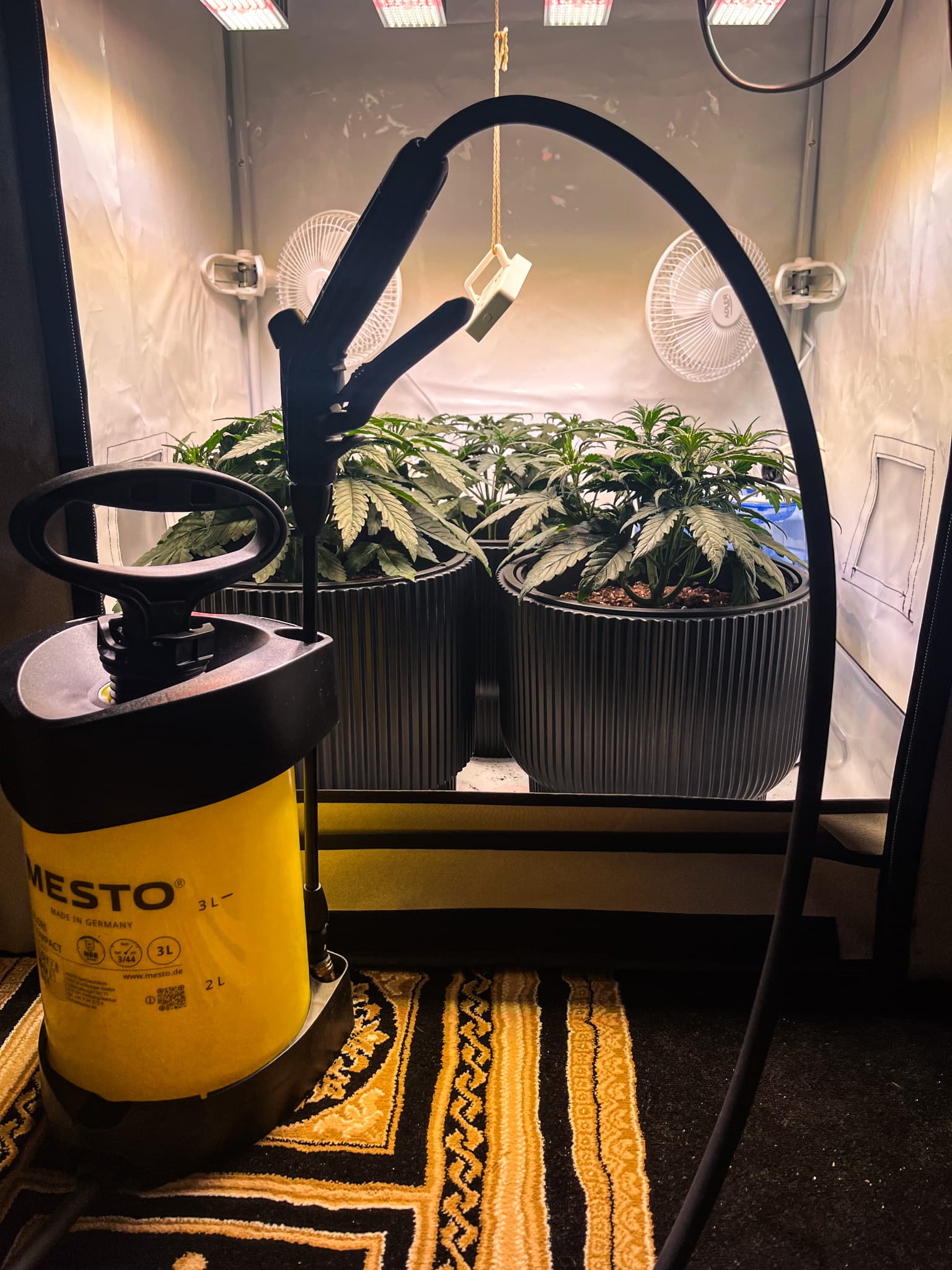 Location: Indoor, GrowPro 3.0 - 80 x 80 x 180cm Beleuchtung: SanLight EVO 4/80 (265 Watt), mit Magnetdimmer (40 / 60 / 80 / 100%) Belüftung: Aygrochy 100mm Intelligent Rohrventilator mit Temperatur- und Feuchtigkeitsregler + AKF 350m³/h + 2 x Umluft-Clip-Ventilatoren Growmedium: Jiffy und Coco-Erdmischung mit gant bisschen growmix Erde zur Anzucht, danach Floragard GrowMix-Erde zusammen mit ein wenig Coco durchmischt. Anzucht: 600Ml Töpfe, Endtopf : 8 Liter Dünger: BioBizz Grow, Top Max, Bloom, CalMag Bewässerung: Wasserhahn (PH 7.3) nach 1/3 Regel (mit PH Downer)