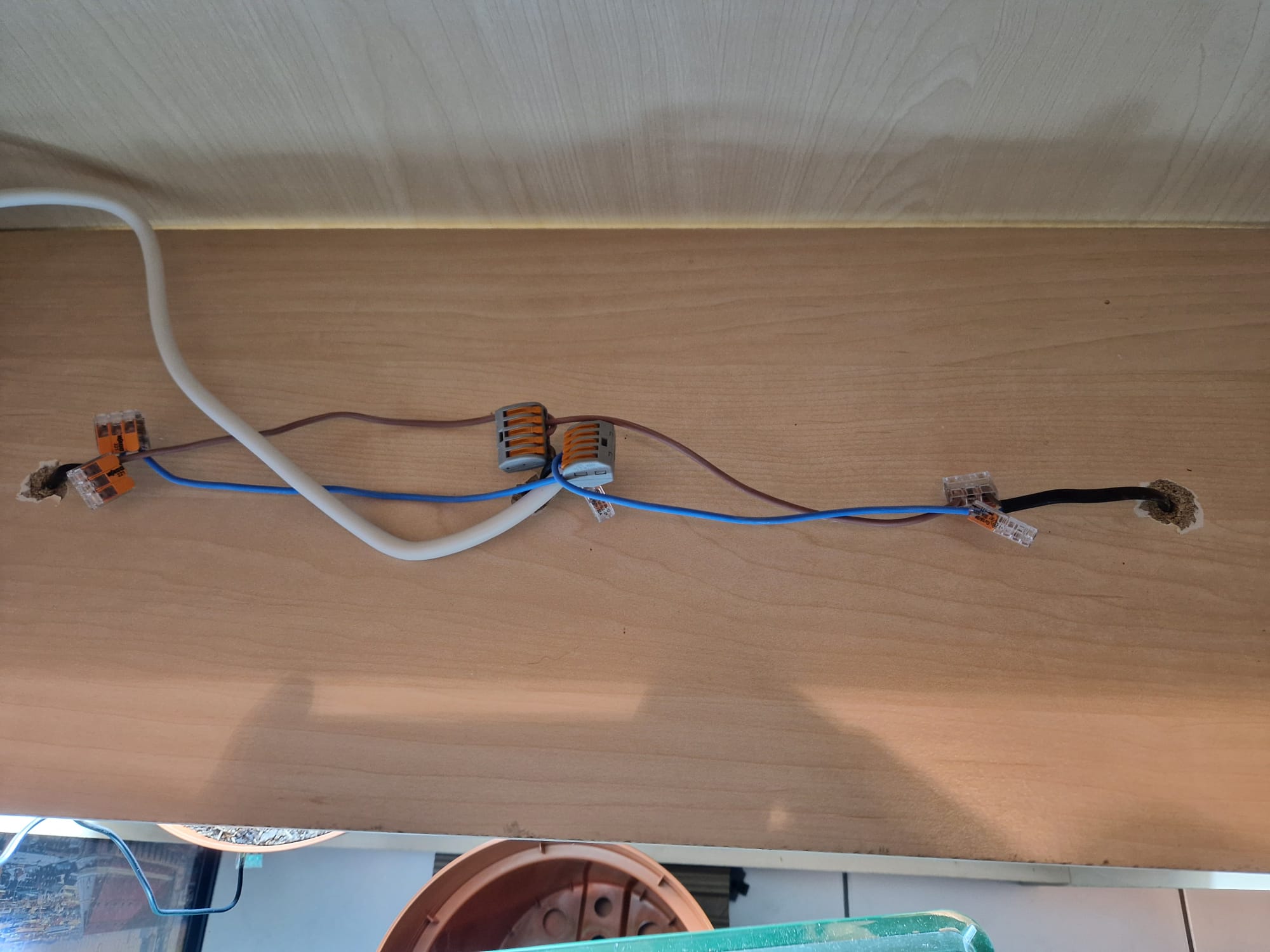 Immerhin mit Wago-Klemmen und nicht mit LĂŒsterdingsbumms verkabelt. Ich wĂŒrde die Verkabelung allerdings lieber in einer kleinen Aufputzdose (ca. 50 Cent im Obi) machen. Einmal ungeschickt mit dem Ărmel am Klemmenhebel hĂ€ngen geblieben und das stromfĂŒhrende Kabel rutscht raus. Solltet ihr keinen FI auf dem Stromkreis haben, dann kann das auch richtig gefĂ€hrlich werden.