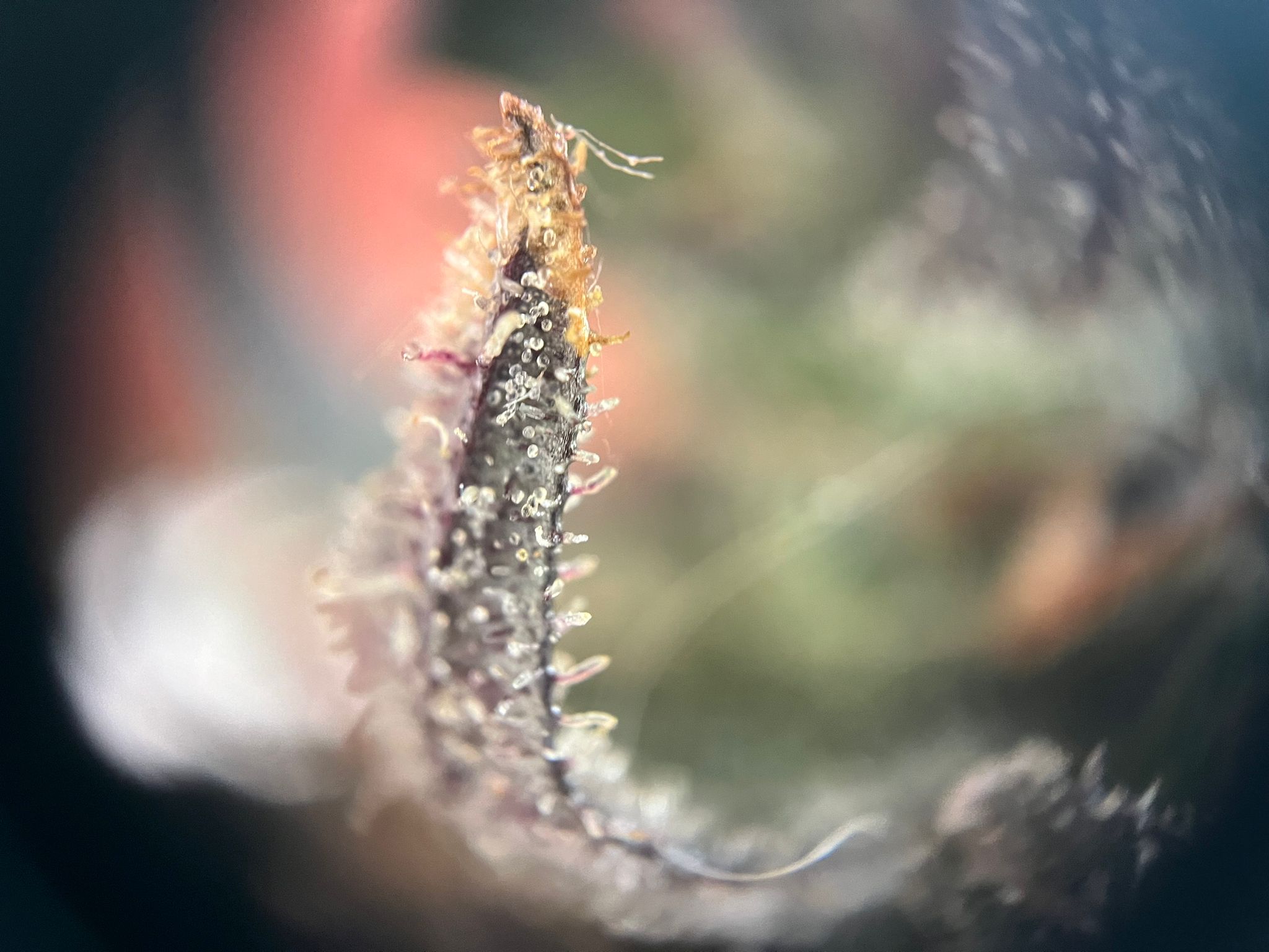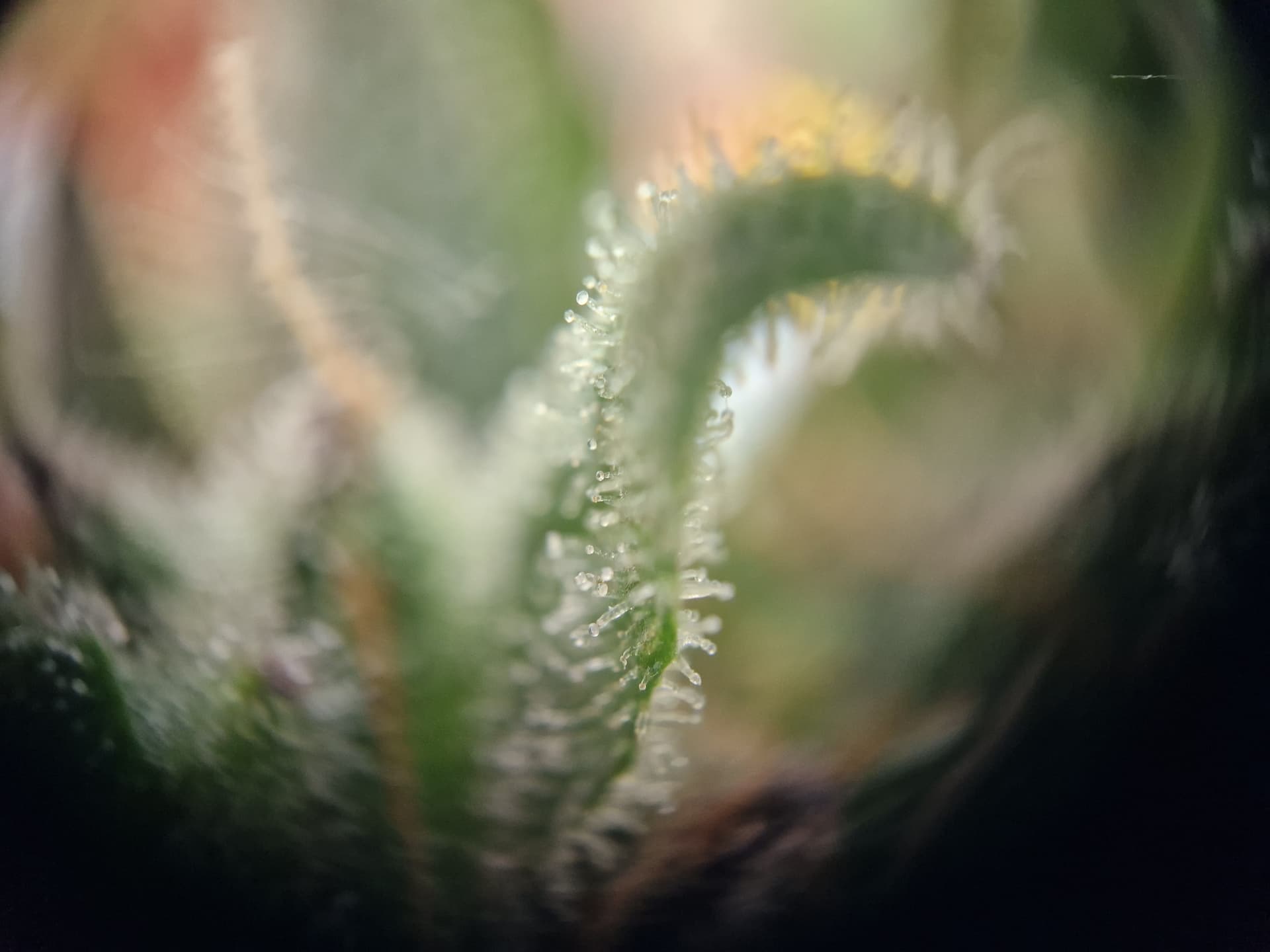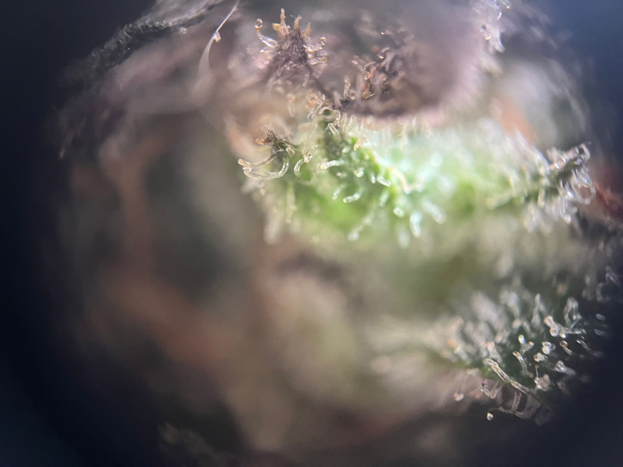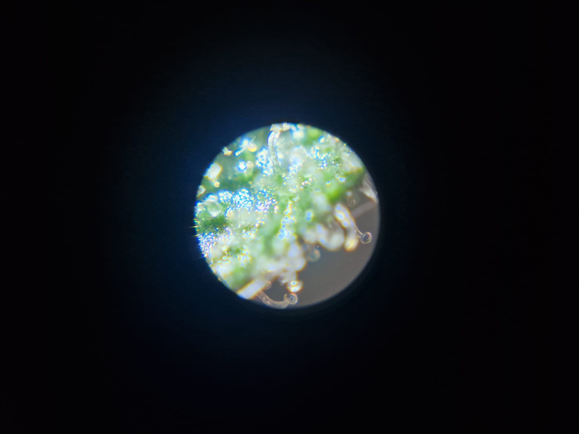 Man konnte es sehr schlecht aufnehmen. Mit dem bloĂen Auge konnte ich schon leicht bernsteinfarbene ca. 10 %, 60 % milchige und einige klare Terpene ca. 30 % sehen.