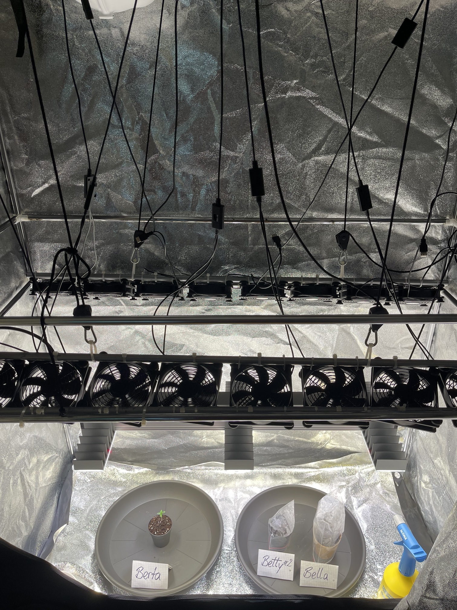 Derzeit laufen 4 Lüfter auf maximum, um die Kleine etwas tänzeln zu lassen und sie bekommt jeden Morgen etwa 6-8 Sprüher Wasser.