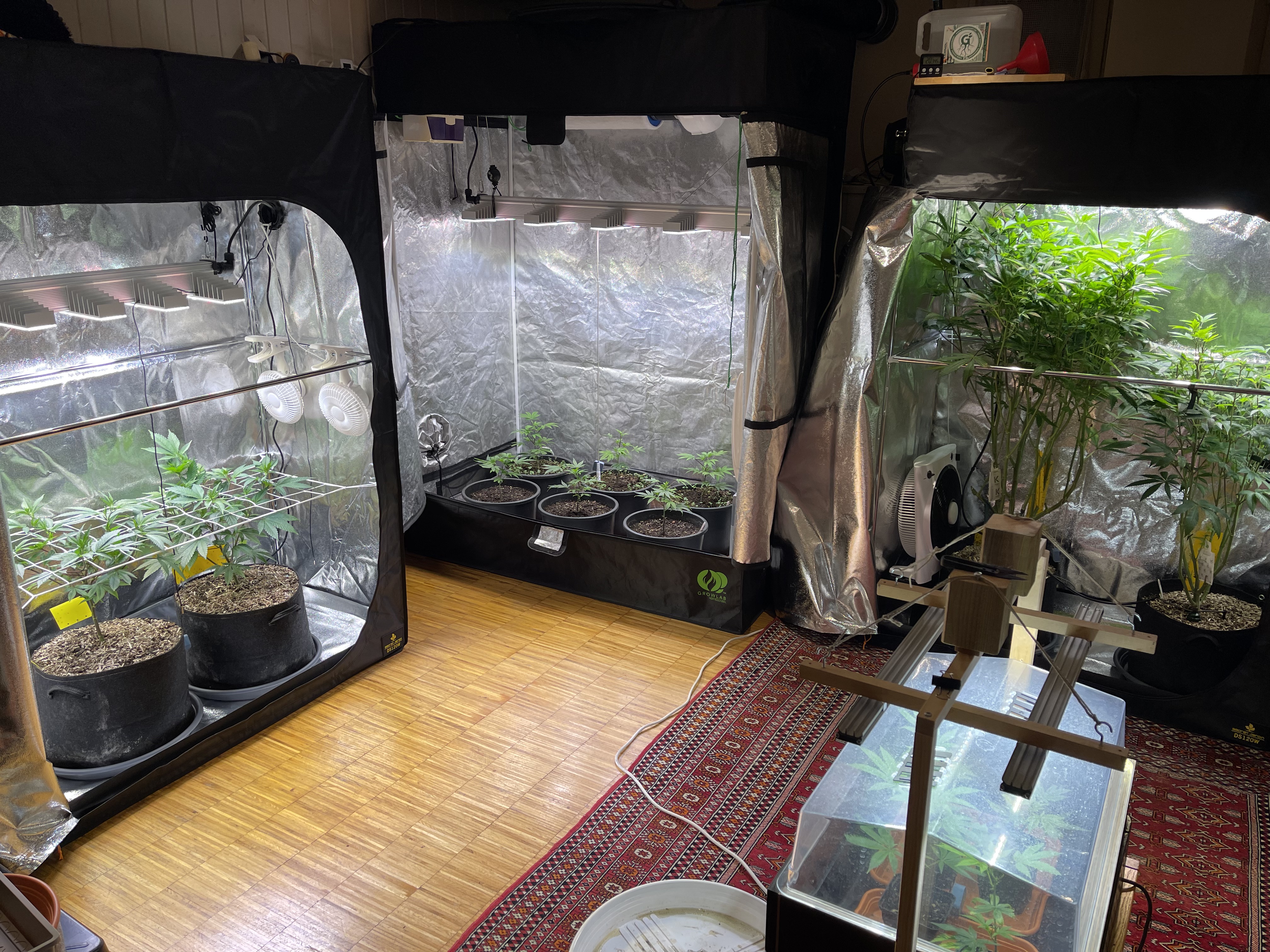 Muttizelt rechts steht aktuell leer. Möchte erstmal nicht mehr als 6 Pflanzen zeitgleich anbauen.. rechtlich und so. Aber sobald die aktuellen grows aufs Ende zu gehen werd ich nebenher 3 neue Muttis auf den Weg bringen.