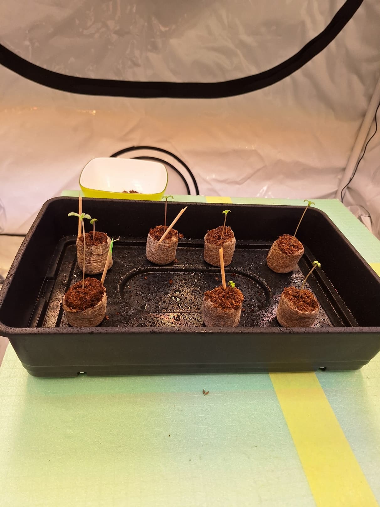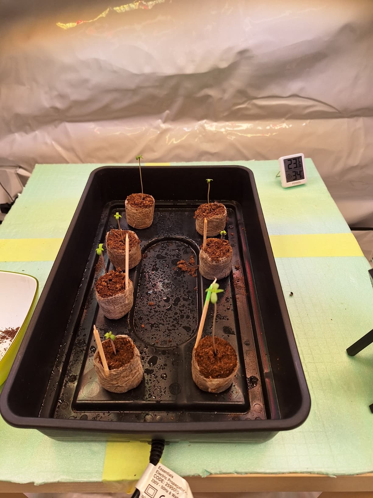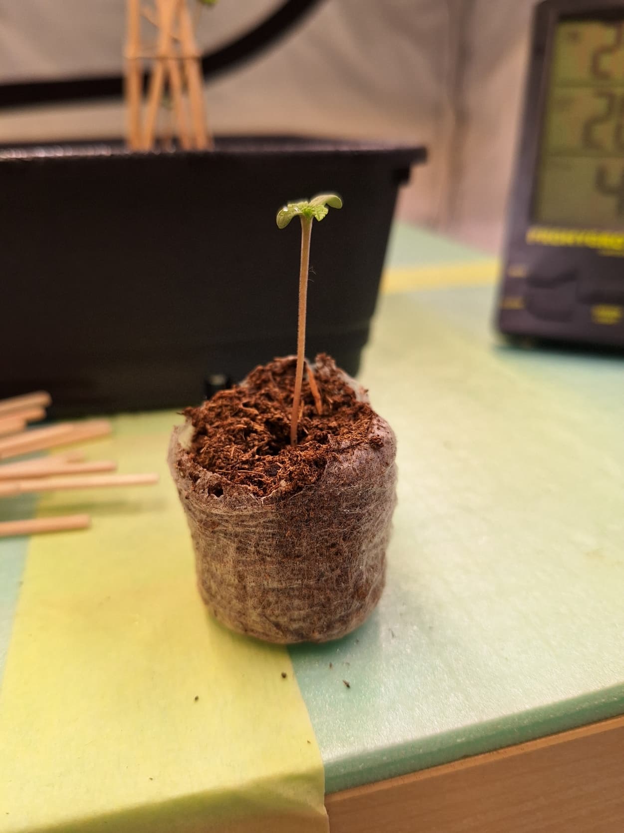 Die hinteren hatte ich zuerst gepflanzt, allerdings etwas zu tief (critical SSH) von Zamnesia. Der Gratis Samen, der größte von allen, ist zuerst gekeimt. Waren wohl alle etwas zu tief eingesetzt, sodass ich die Erden oben drauf was abgestreift habe. Dachte erst die kommen nicht und hab dann nochmal 3 Stück gepflanzt (Royal Runtz) von Royal Queen Seeds, oder so ähnlich. Von denen die Samen sahen auch wesentlich, ich sag mal gesünder aus.