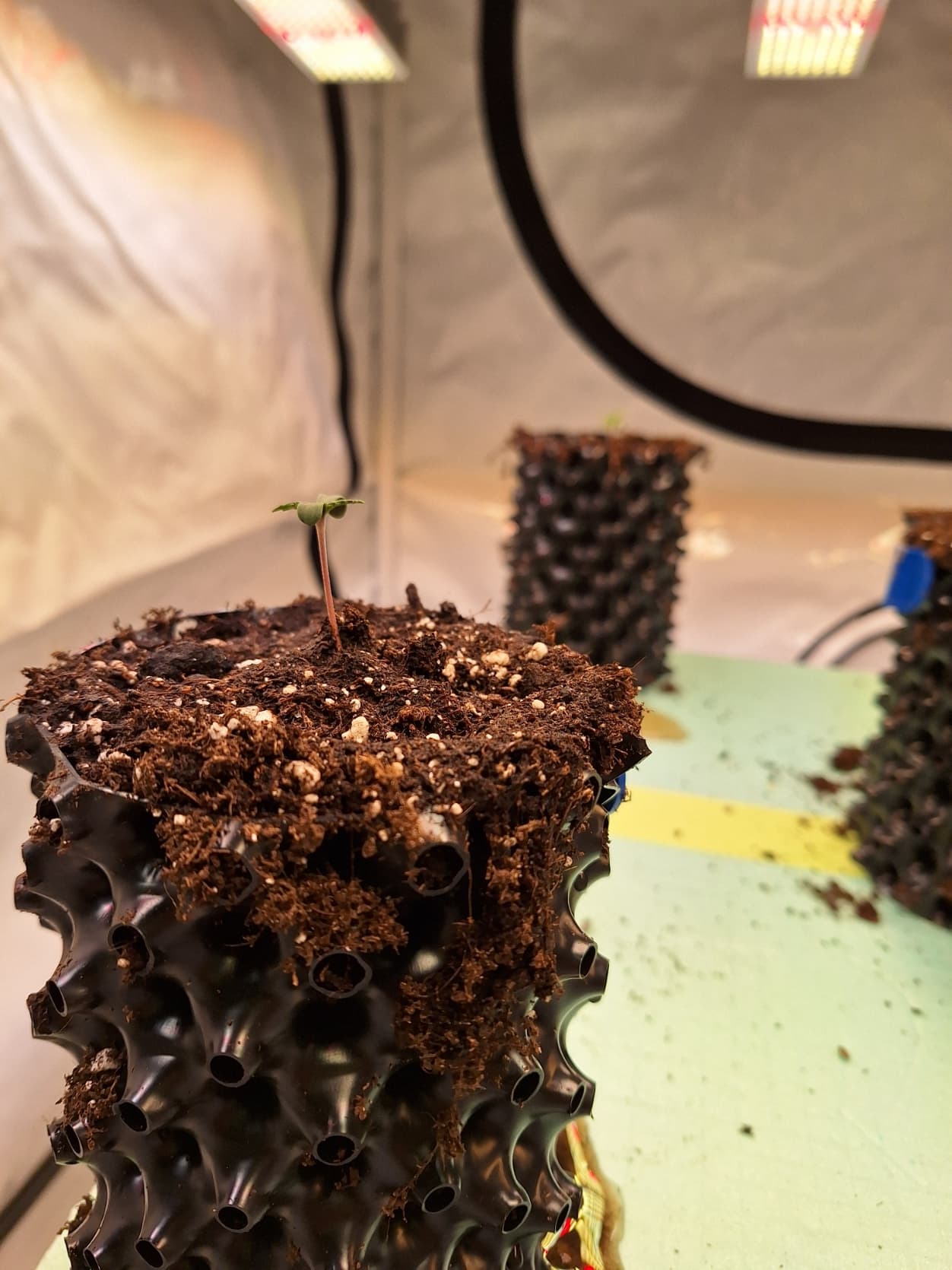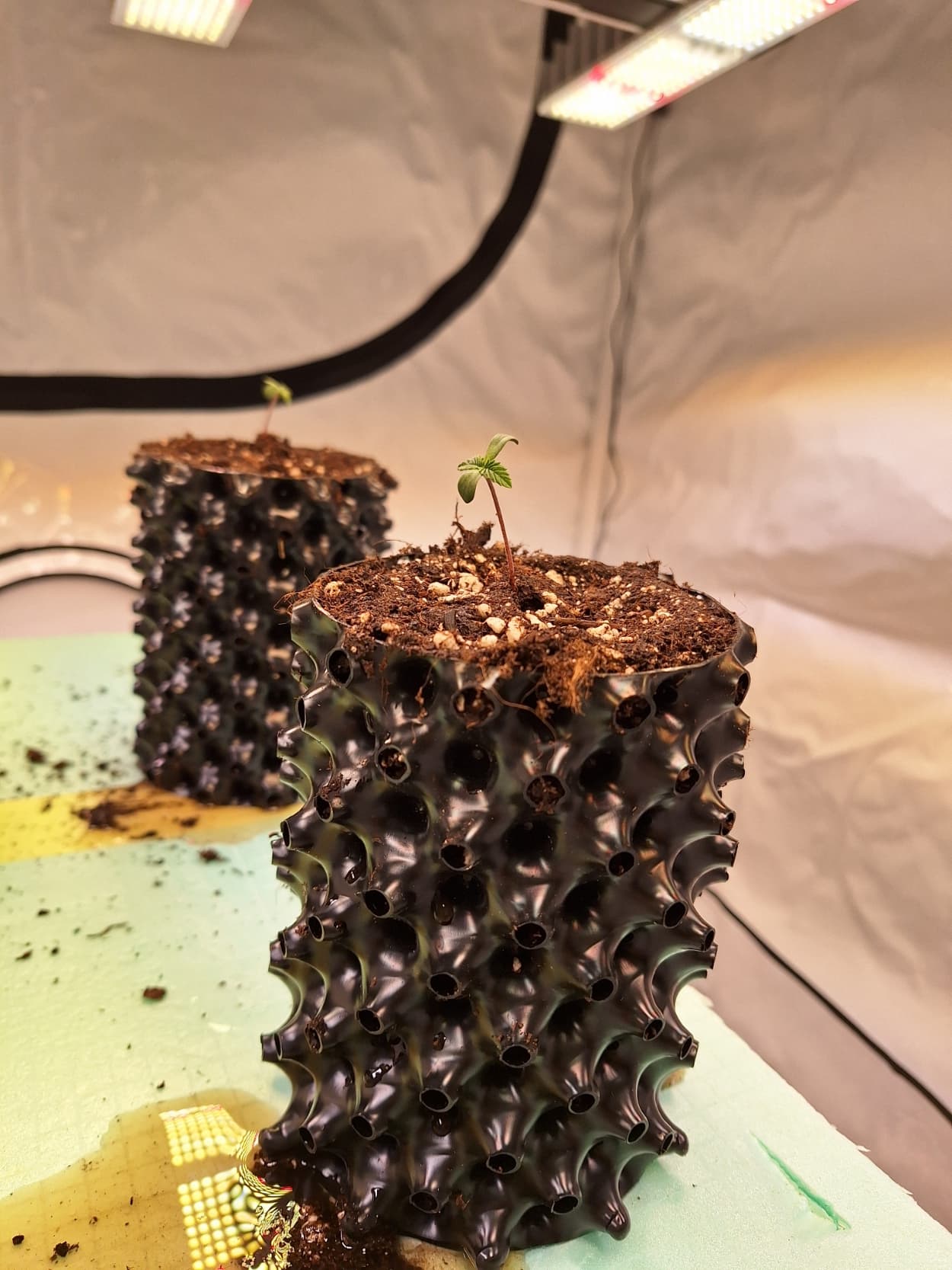 Für den ersten Grow nach 50 Jahren hast du die denkbar ungünstigsten Töpfe gewählt… Airpots sind sehr anspruchsvoll was das giessen betrifft. Was die brauchen ist endlich mal Ruhe kein rumgedüddel! Stelle die Töpfe alle zusammen zentral unter die LED, Sorge einmal dafür das es genug Wasser hat und dann mal ein paar Tage stehen lassen. Das können immer noch mächtige Pflanzen werden, ist nur eine Frage der Zeit und Pflege jetzt.