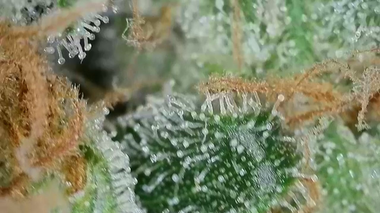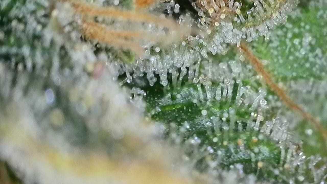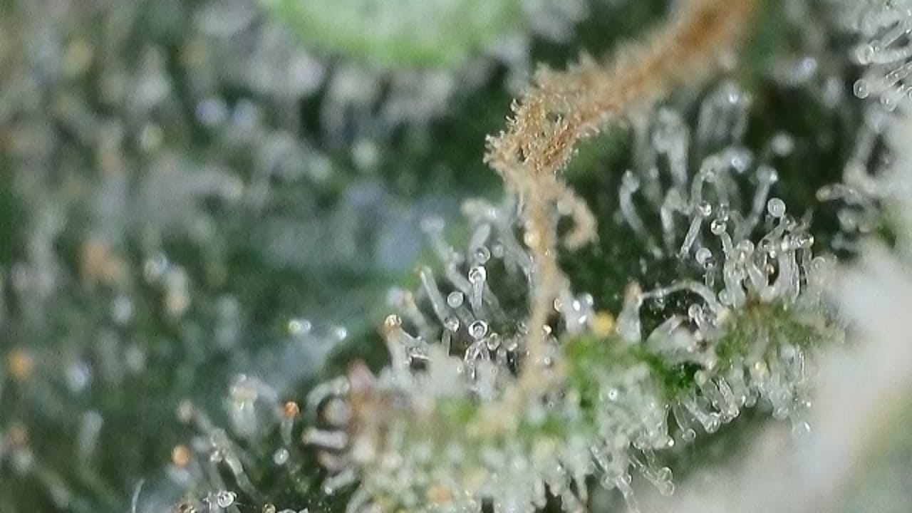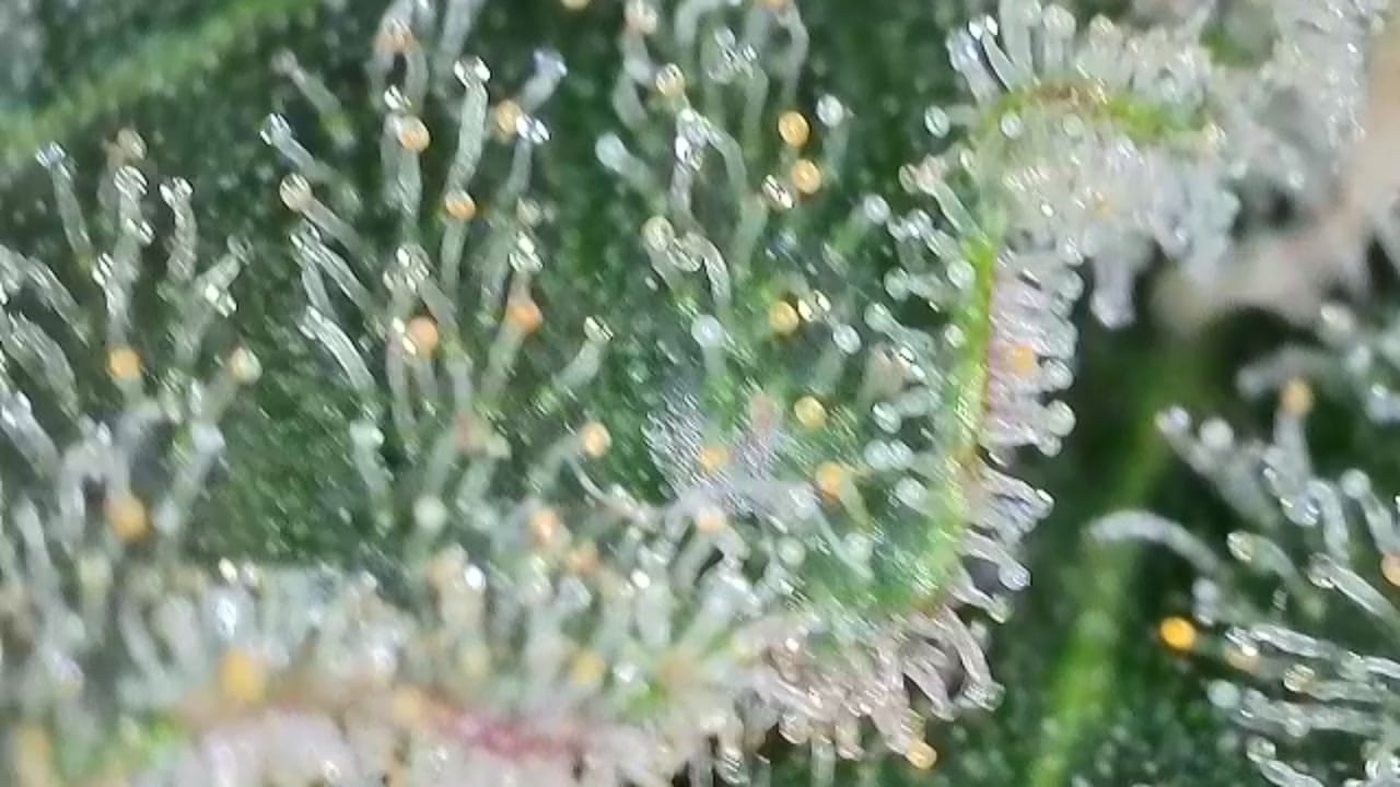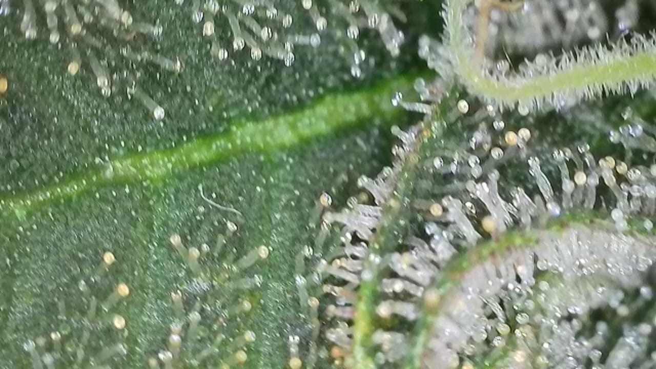 Die Härchen sind zu 90% rot/orange und die Trichome sind Großteils weiß/milchig und 5% bernsteinfarben.