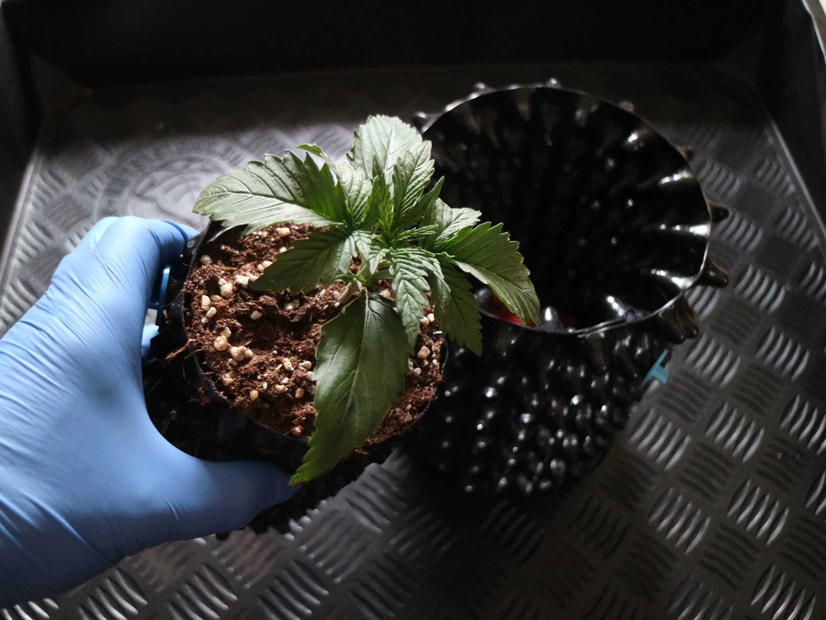 Also bin ich aus dem Bad in die Küche gezogen, hab dort in aller Ruhe umgetopft, gewogen und gegossen. Ganz hinten aus dem Schrank hab ich einen alten 500-ml-Ölausgießer gezogen, den ich ewig nicht benutzt habe und mit dem habe ich (jetzt auf anständiger Arbeitshöhe und nicht knieend über der Badewanne) mit viel Zeit einen Liter pro Pflanze gegossen. Bis ein paar Tröpfchen drain wieder rausgetröpfelt sind. Dann wieder gewogen und zurück ins Zelt.