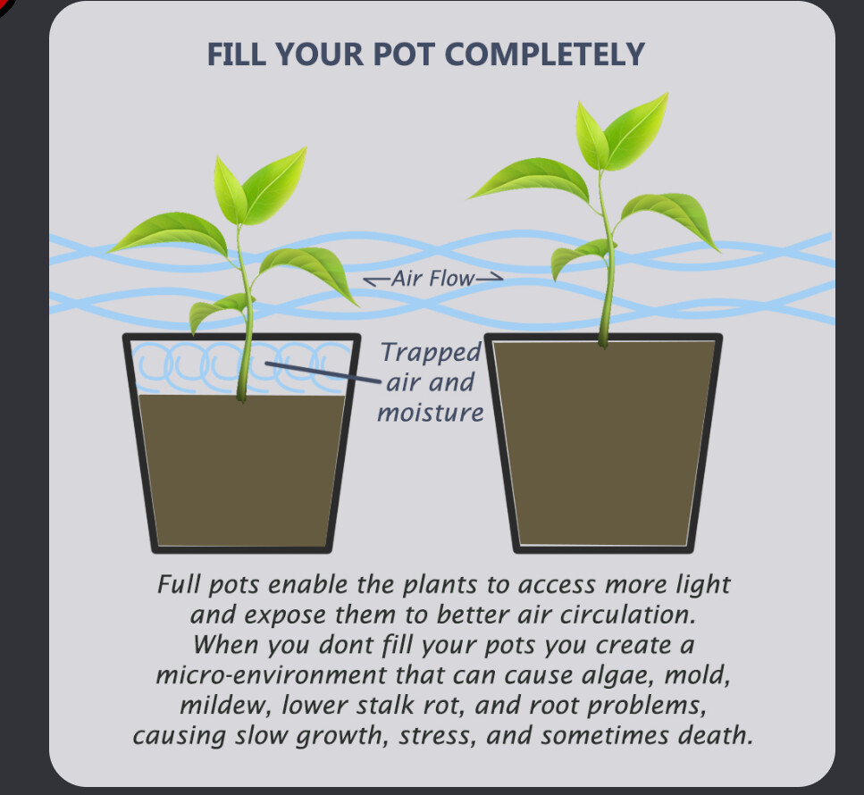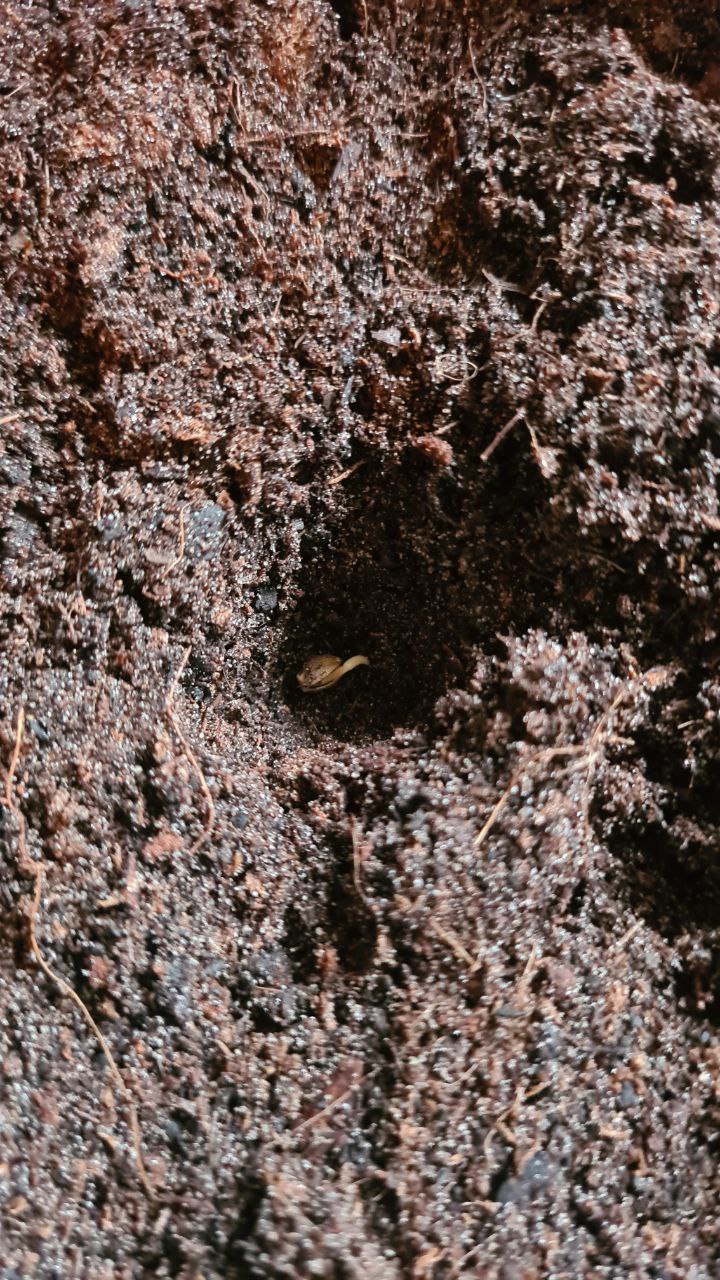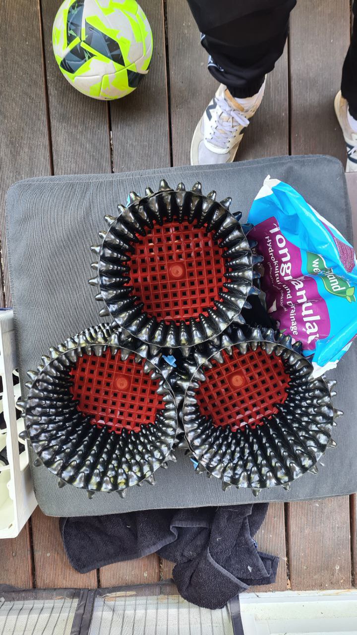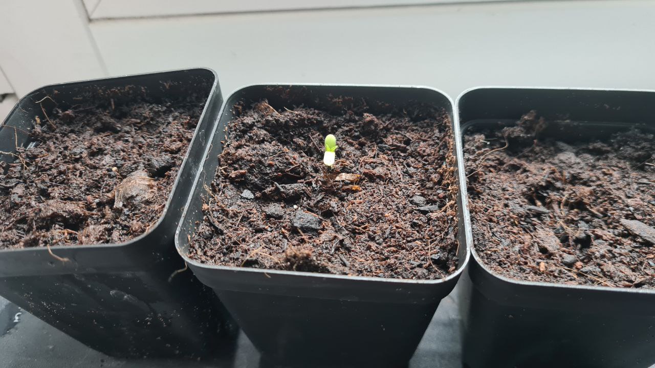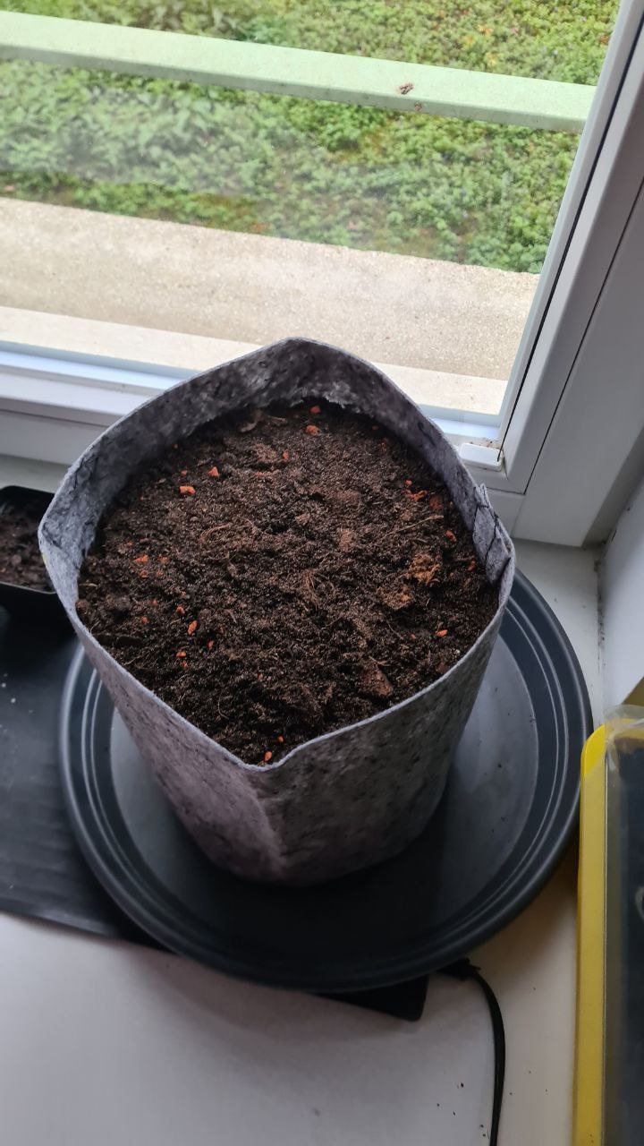 Also wieder nach Hause gedüst, die Töpfe zusammengeschraubt und unten ein wenig Tongranulat als Drainage gelegt und dann mit angefeuchteter Erde befüllt. Wie in den zahllosen Tutorials gelernt, den Topf samt Pflanze einmal auf den Kopf, während Zeigefinger und Mittelfinger den Stamm stabilisieren. Dann die Seiten des Topfes ein wenig „massiert“, dass der Setzling aus dem Topf gleitet und in das passend vorbereitete Loch im neuen Topf gesetzt, angedrückt und weitere Erde bis zum Rand des Topfes angehäuft.