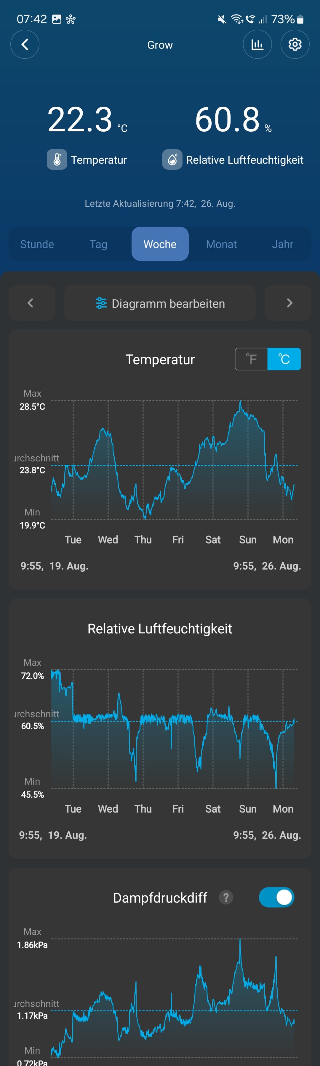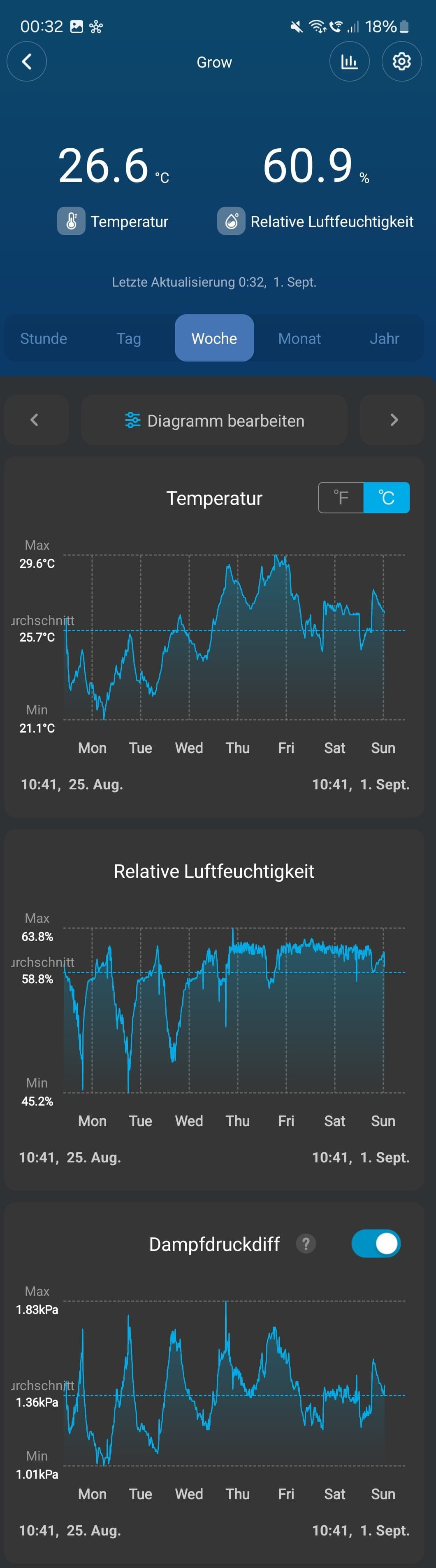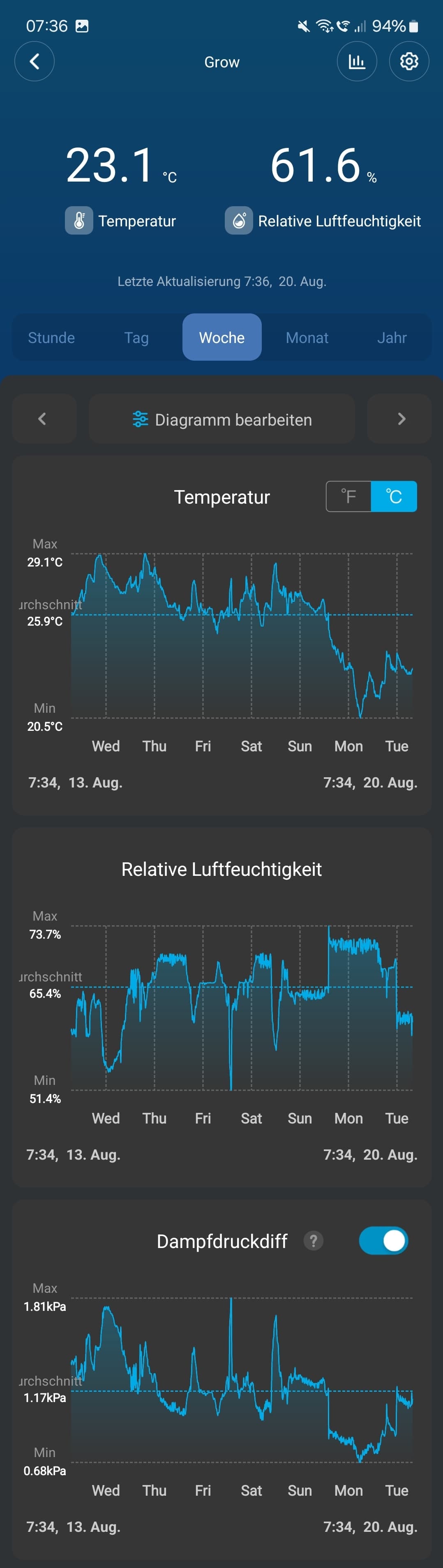 Aufgrund des momentanen Wetters brauchte ich jetzt auch den Luftbefeuchter schon lange nicht mehr nachfüllen. Der arbeitet zwar immer mal wieder zwischendurch aber eigentlich ist die LF RELATIV stabil im Moment. Seitdem ich den Luftschlauch abgezogen habe, sind die Temps auch wieder in 'nem besseren Bereich.