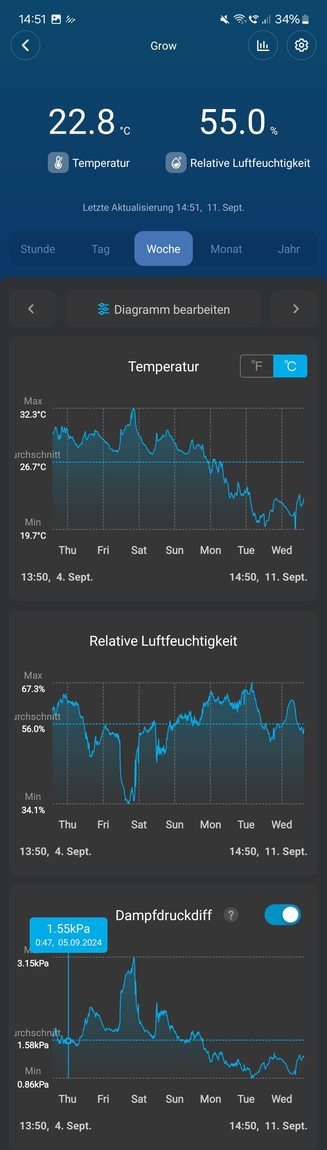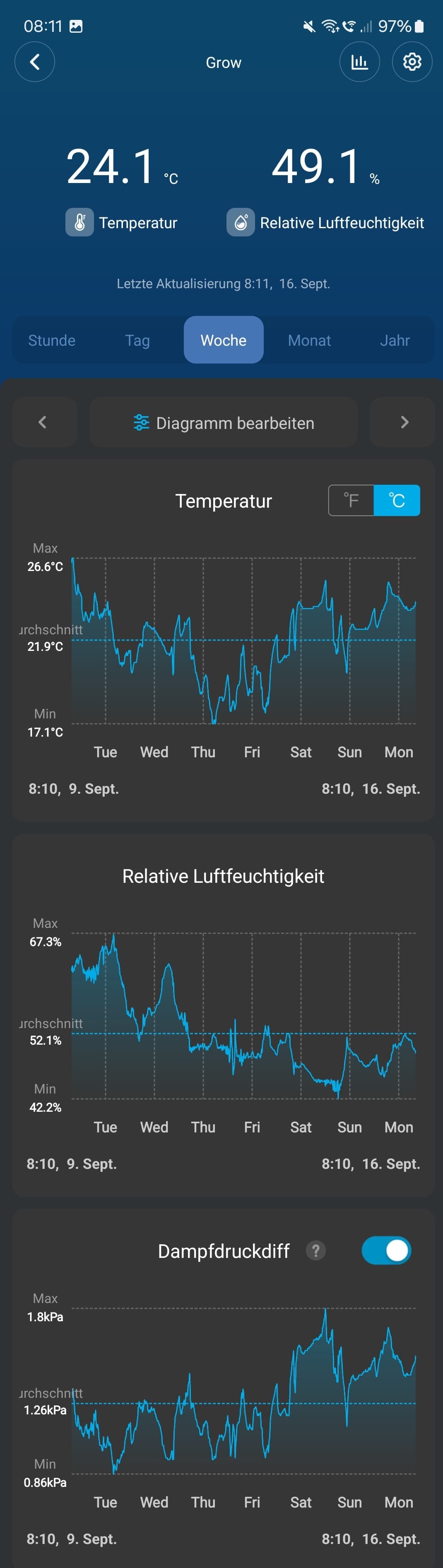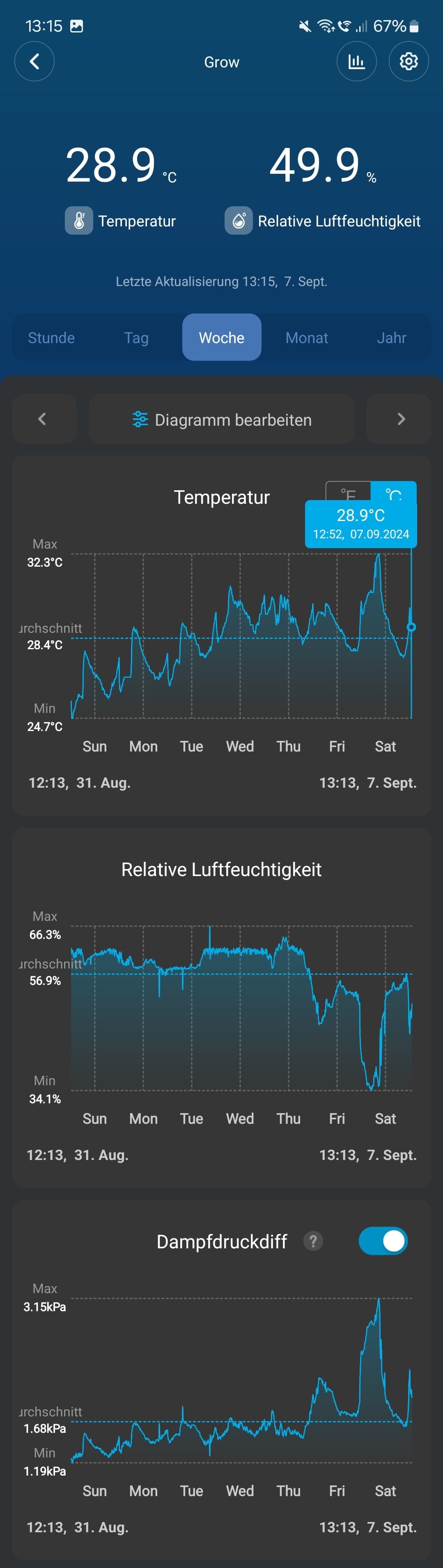 Aufgrund des momentanen Wetters brauchte ich jetzt auch den Luftbefeuchter schon lange nicht mehr nachfüllen. Der arbeitet zwar immer mal wieder zwischendurch aber eigentlich ist die LF RELATIV stabil im Moment. Seitdem ich den Luftschlauch abgezogen habe, sind die Temps auch wieder in 'nem besseren Bereich.