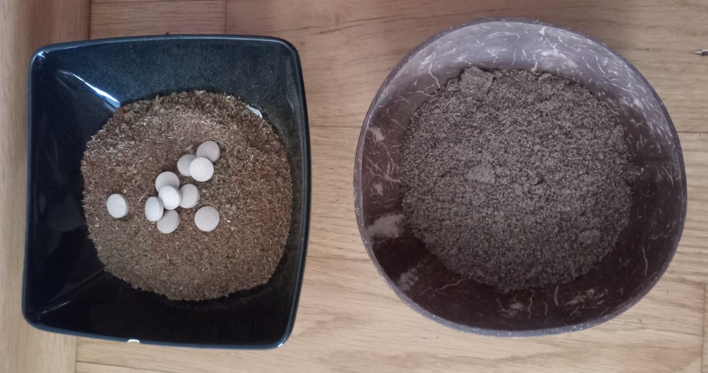 Ein Düngerschippchen Blütedünger und ein halbes Schippchen Booster drauf, 0,75l Wasser rüber und es geht ordentlich voran.