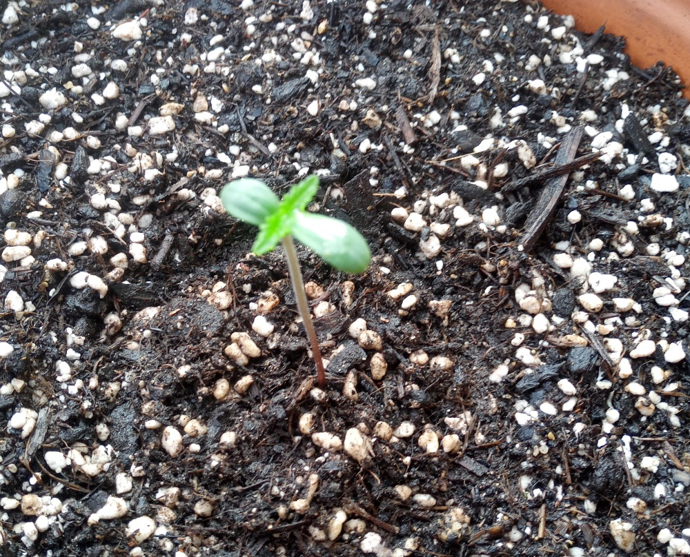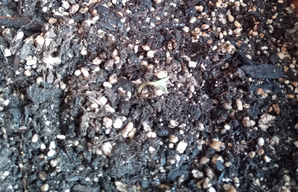 Tag 13 nach dem Schlupf… Die Kleine war mit ihrem Standort ein wenig unzufrieden, deswegen hat der Stiel wohl diese Form. Mal sehen, ob der „Mulch“ mit Perlit was gegen das Verdampfen von Wasser nutzt, wenn die Sonne nicht direkt auf die Erde braten kann.