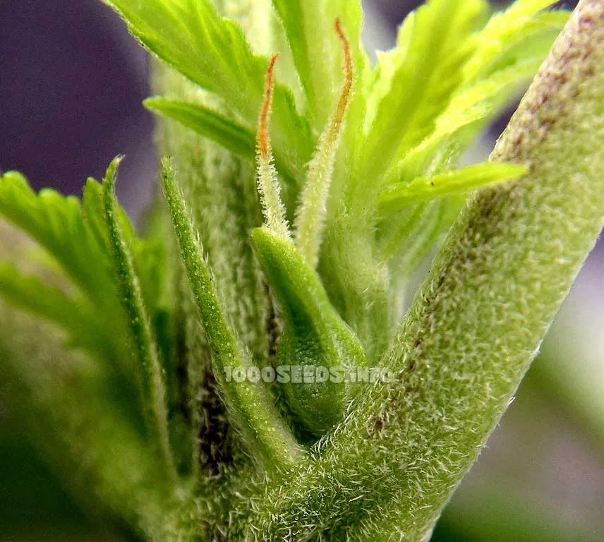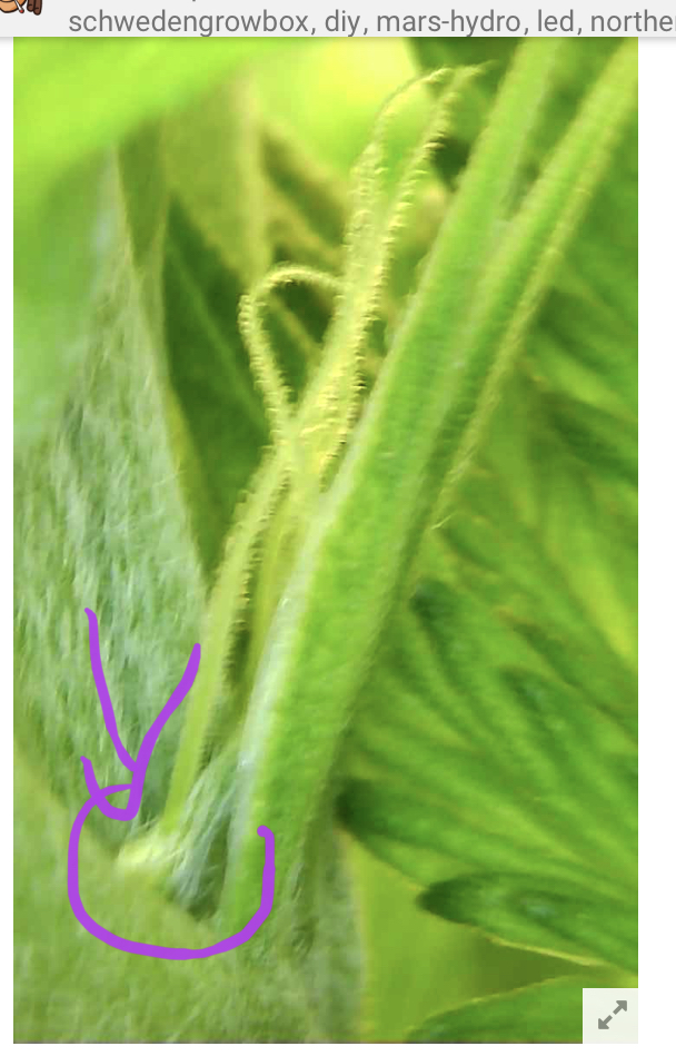 An den Triebachsen sehe ich (nach ca. 3-5 Wochen Wachstum) die Vorblüte. Entweder kleine Kugeln (männlich) oder etwas “längliches“ (weiblich). Aus dem “länglichen“ kommen dann irgendwann Stigmen (weiße Härchen).
