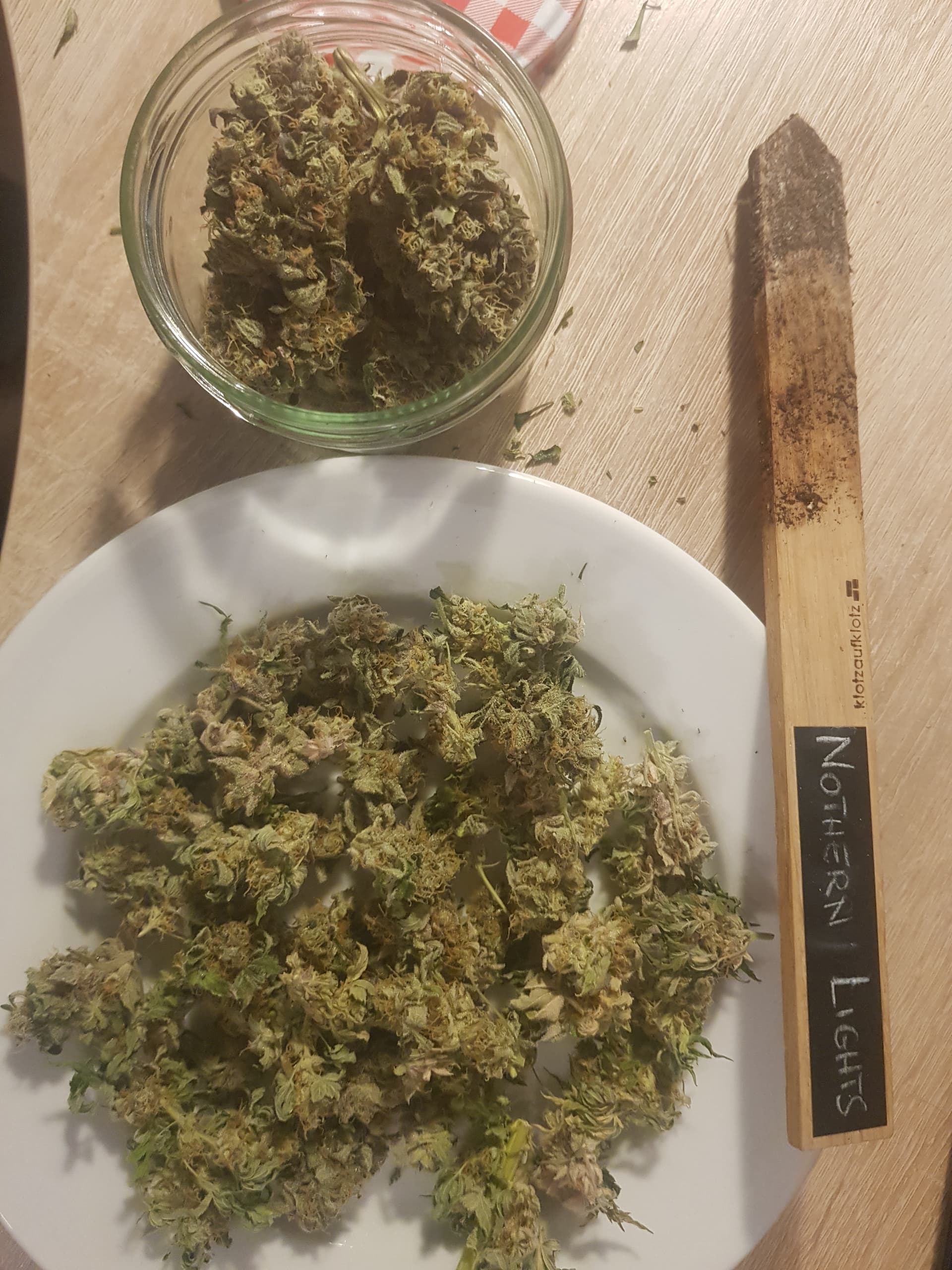 Ich habe die oberen, größerem Blüten separiert und in Gläser mit jeweils einem 62% Boveda gefüllt zum curen. Die ganzen kleinen Blüten sind in einen Gefrierbeutel und ins Tiefkühlfach gewandert zum Backen. ![]()