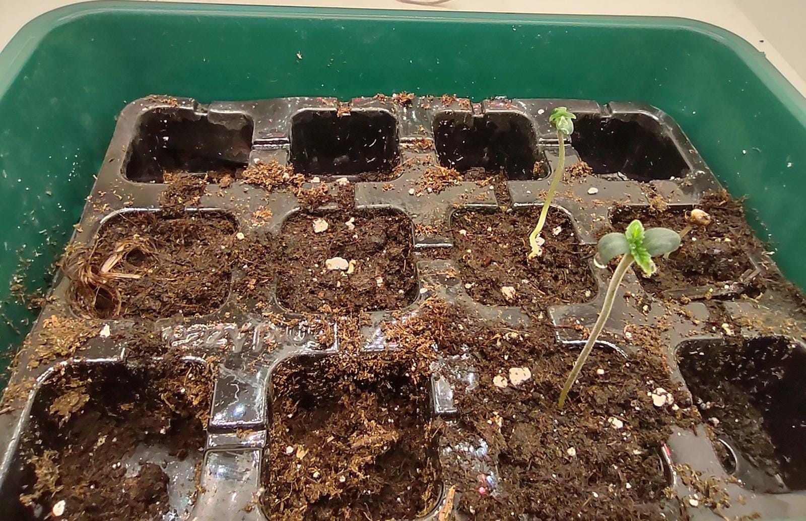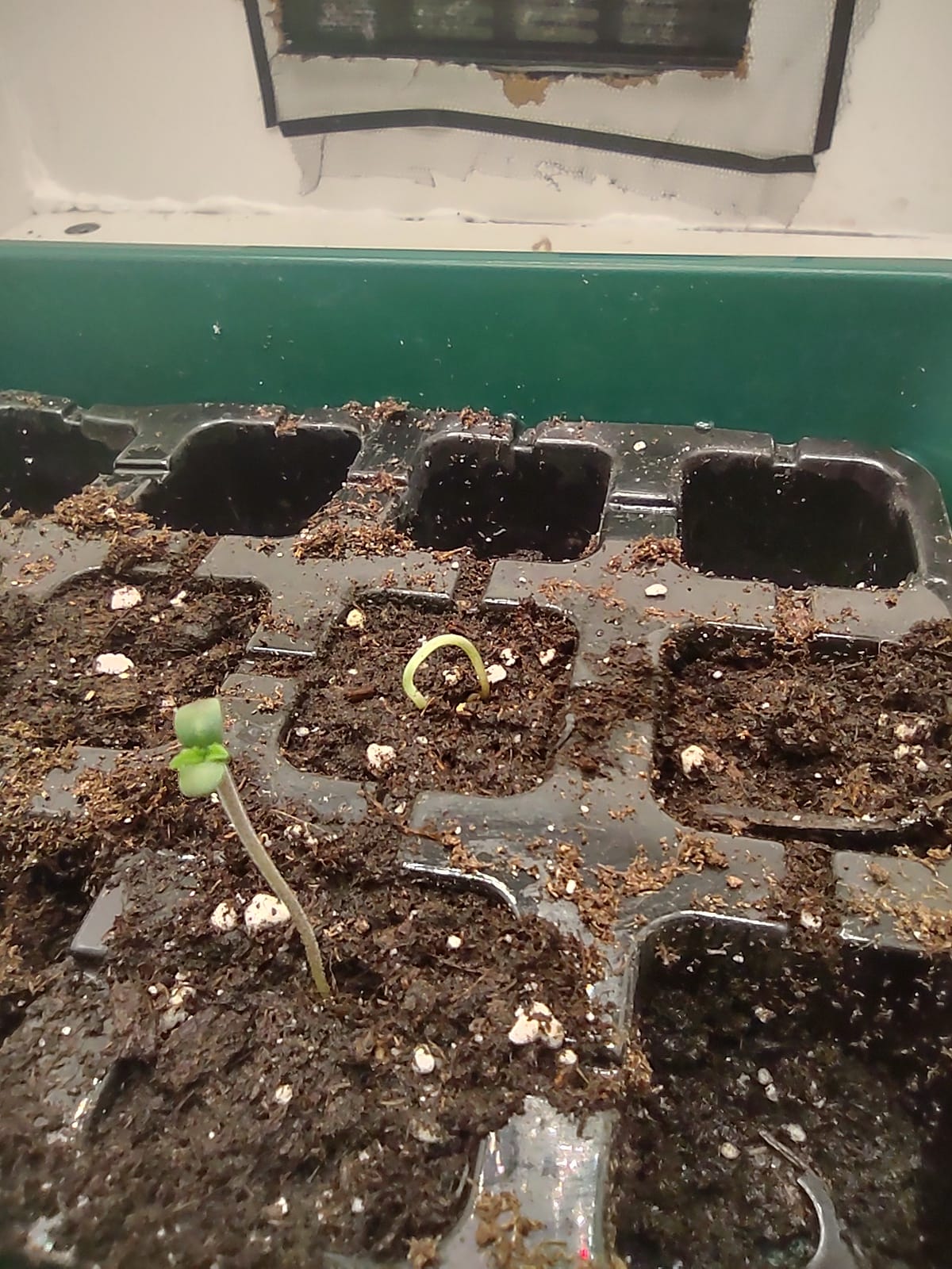 Ich bin mir nicht sicher was mit der hinteren Pflanze los ist bzw. ob der Samen nur falsch herum in der Erde war und sie jetzt wieder zurück möchte oder ob das noch was wird.