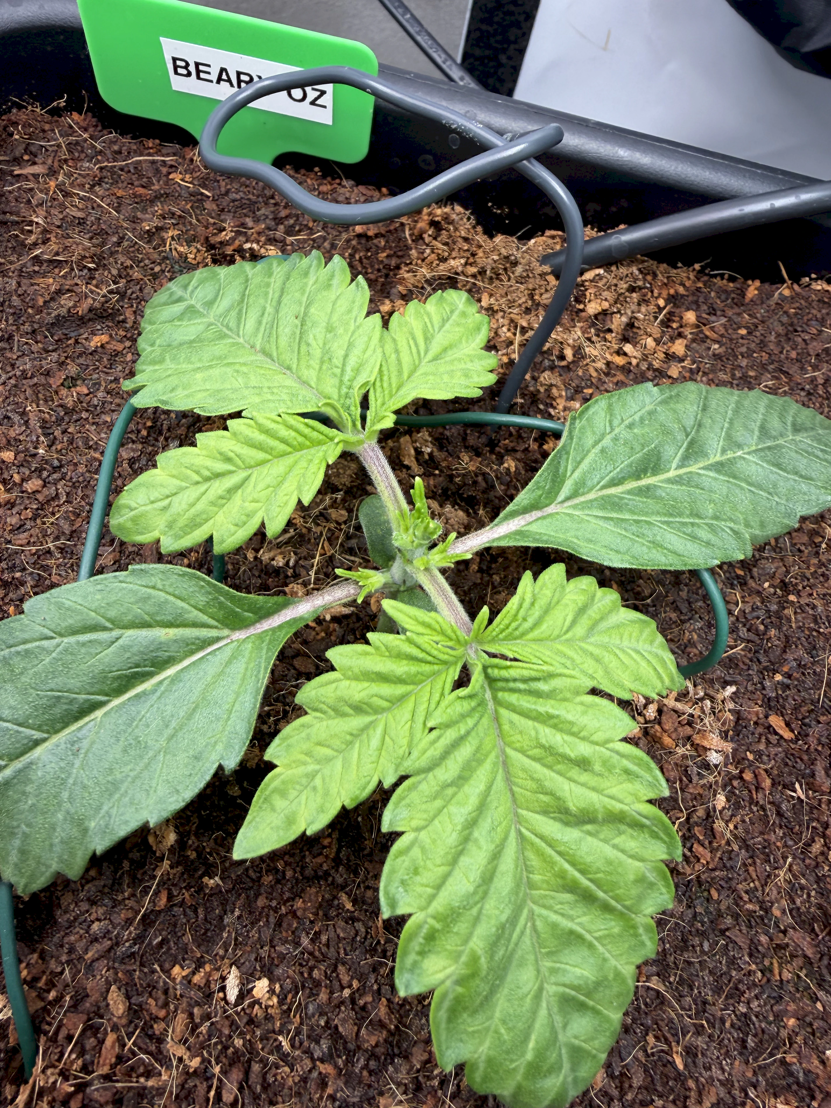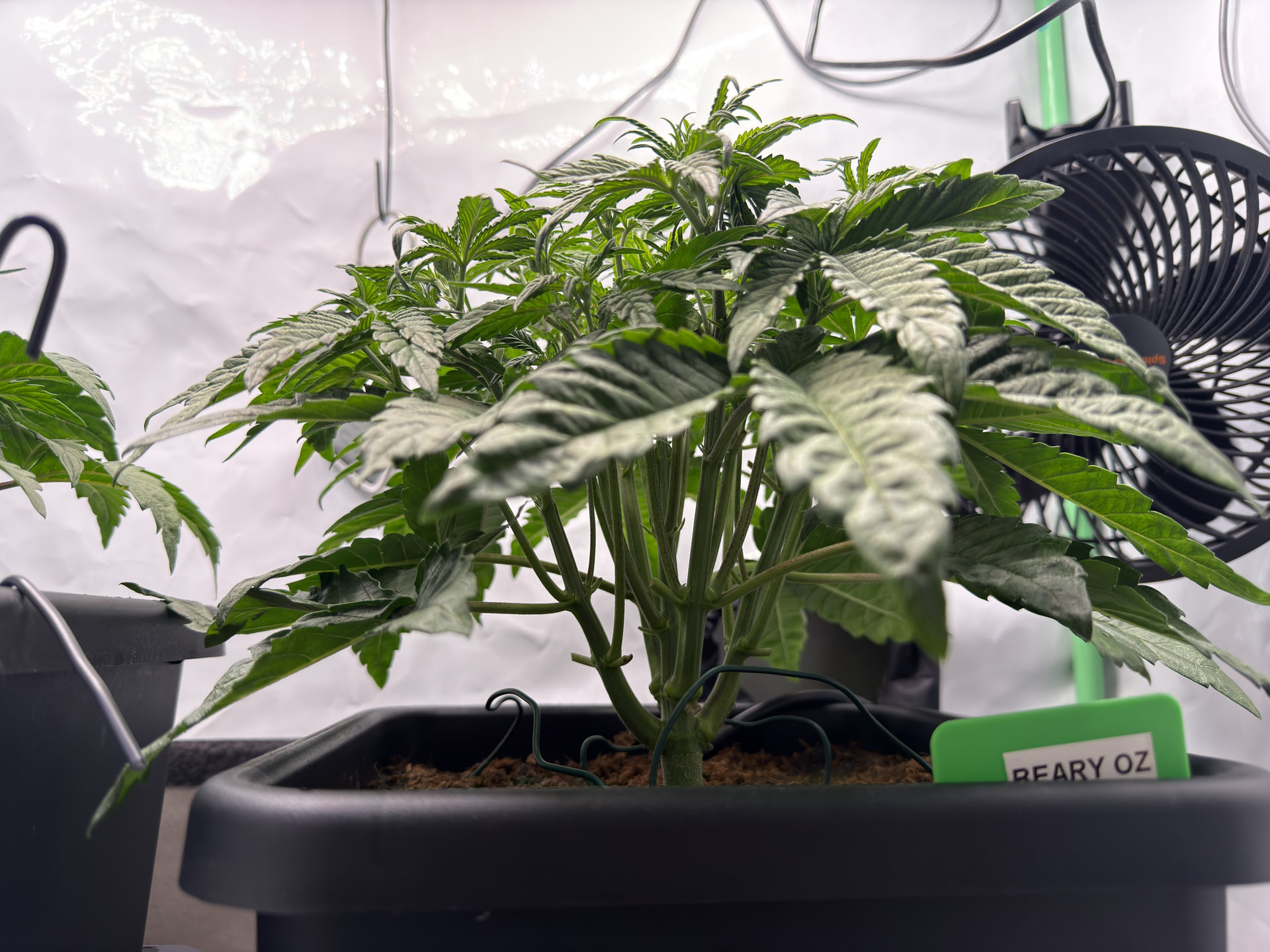 Die Beary Oz (hinten) hat nun angefangen zu stretchen und ist daher vermutlich in BlĂŒtewoche 1. Ihre Struktur gefĂ€llt mir richtig gut: Alle Triebe befinden sich auf annĂ€hernd gleicher Höhe mit gutem Abstand zueinander.