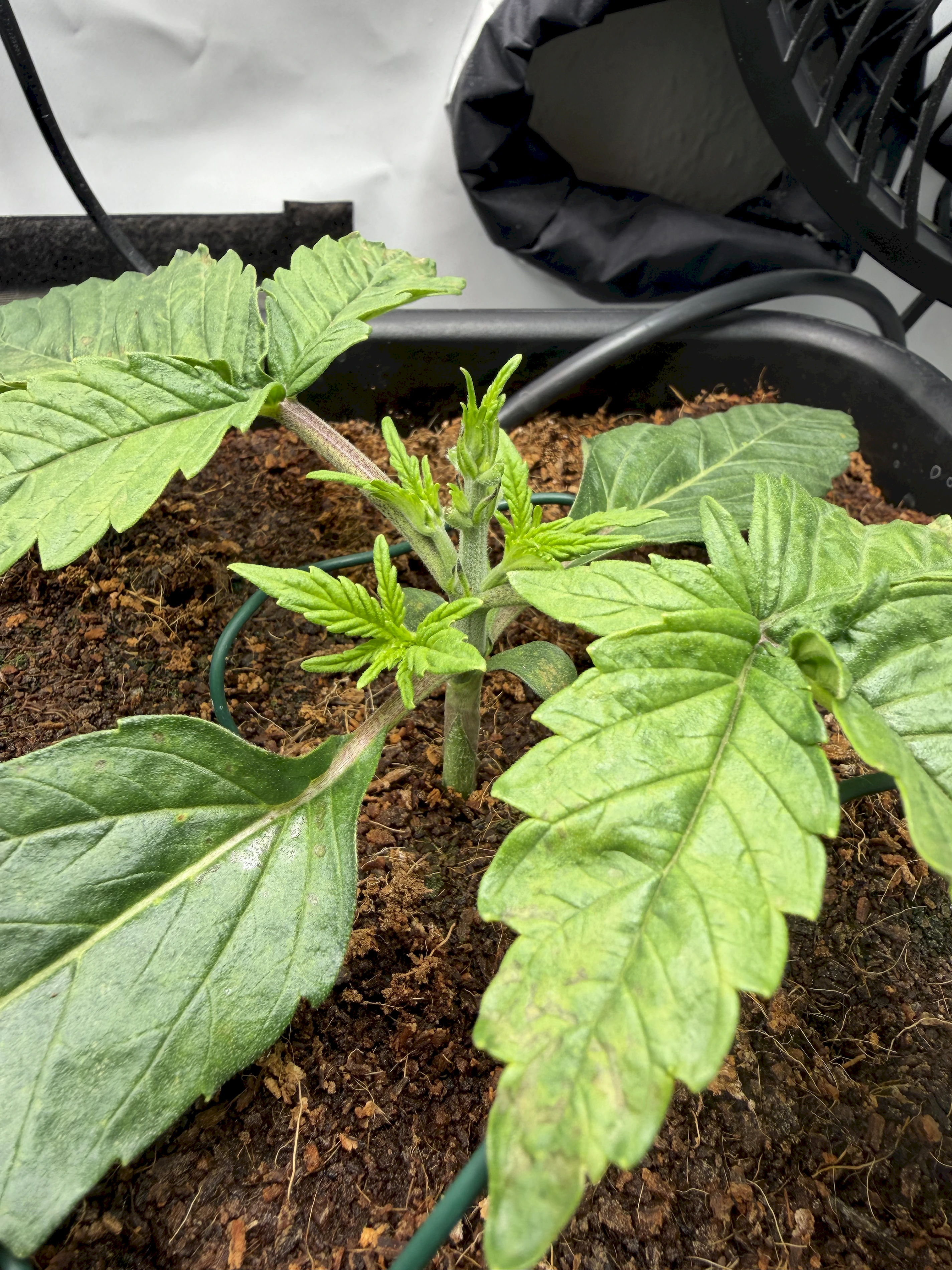 Die Wedding Doves ist 3 Tage spÀter gekeimt, und hinkt daher etwas hinterher. Sie ist noch nicht im Stretch. Derzeit gefÀllt mir ihre Grundstruktur noch nicht so gut. Sie wÀchst sehr gedrungen. Hier hoffe ich, dass der Stretch ihre Struktur noch etwas aufbrechen wird