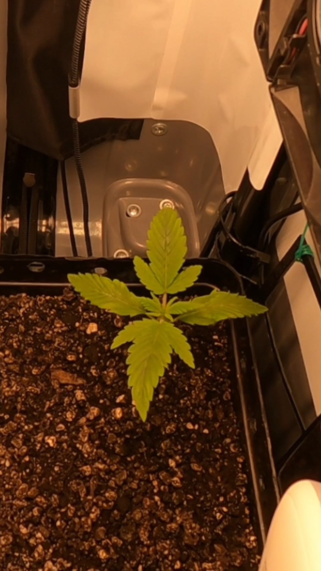 Tag 6 der Dance World . Mittlerweile stöĂt der Keimling fast an die Plastikhaube des Mini-GewĂ€chshauses, heute kommt sie in den Endtopf und zieht in den Koffer um.