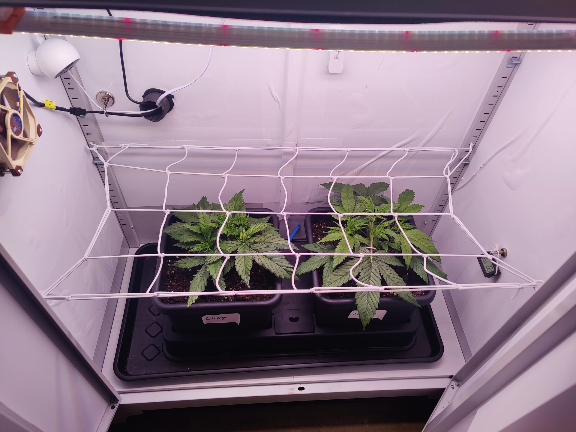 Die mittleren Triebe der beiden werden morgen nochmal getoppt und Scrog Netz eingezogen Mittwoch wahrscheinlich. Ende der Woche gehts dann in Blüte.