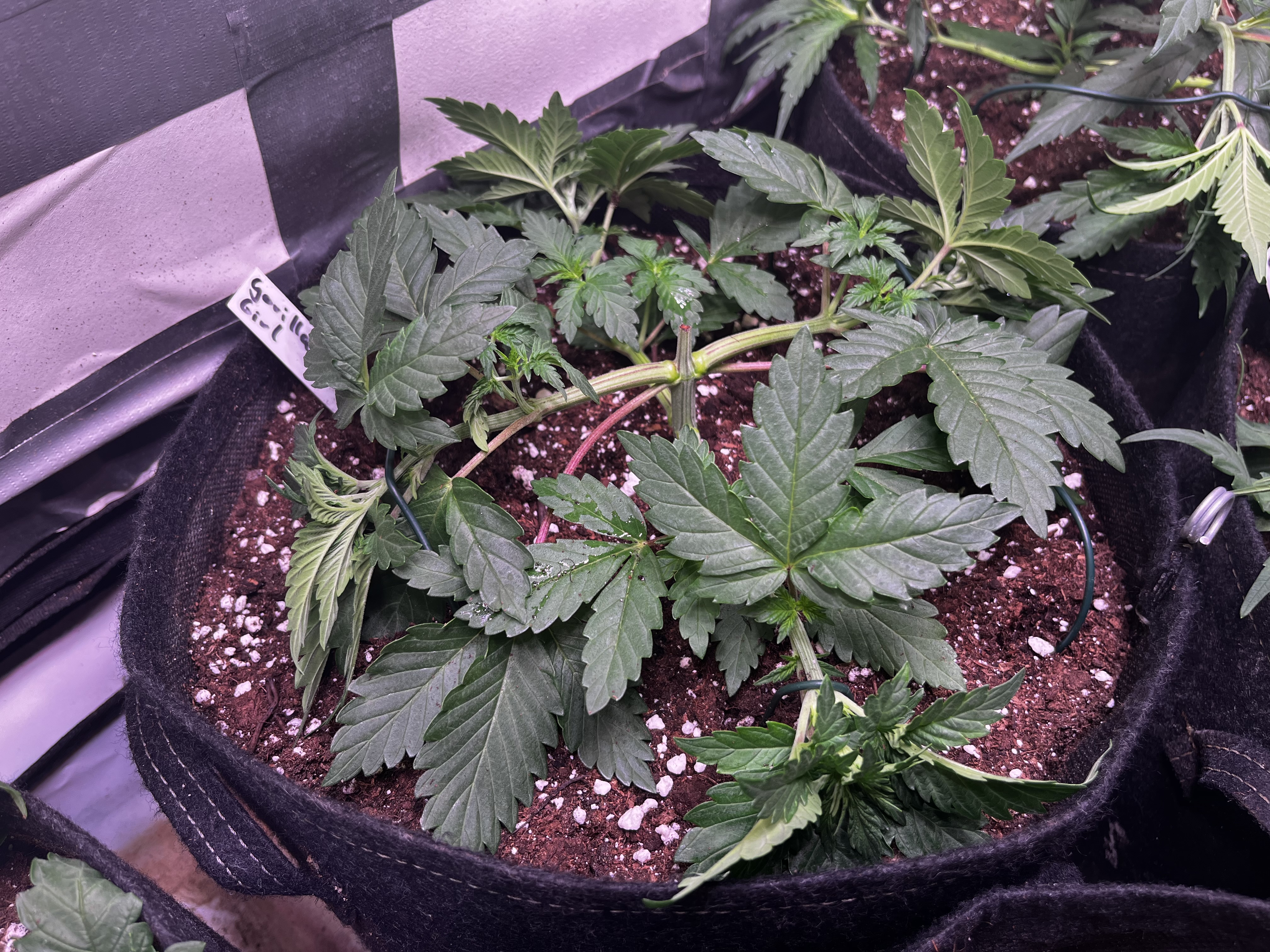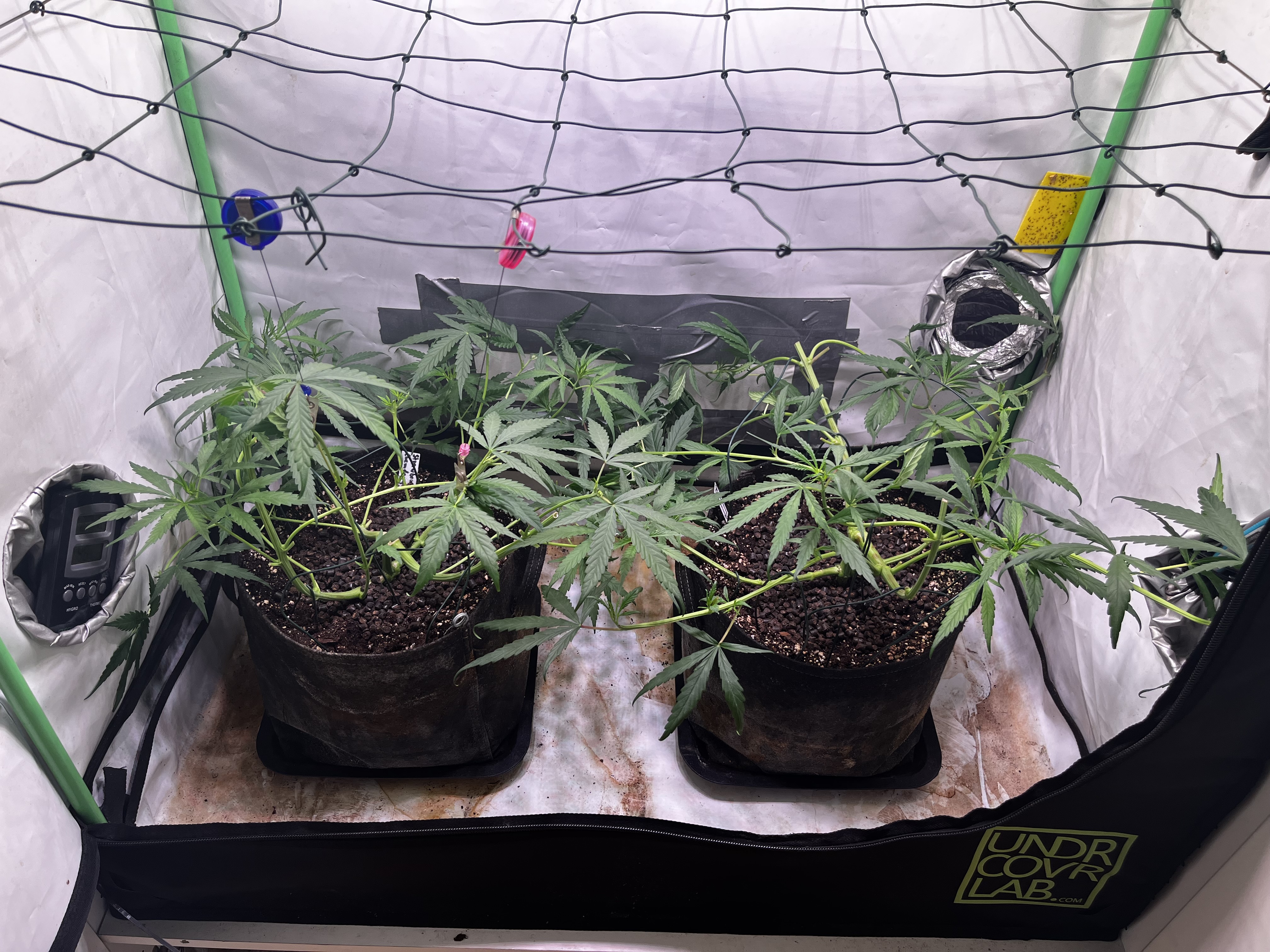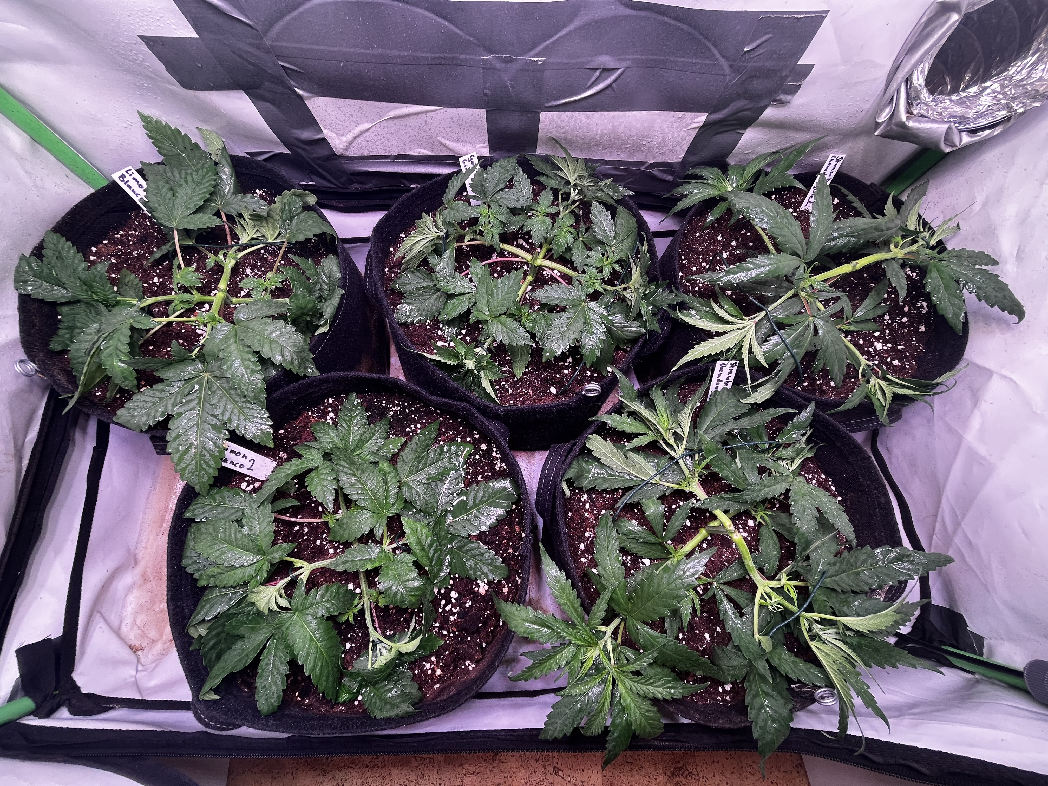 Die Pflanzen in den 11 Liter Töpfen wurden heute alle nochmal getoppt und beschnitten. Viele Segelblätter wurden rausgenommen und allen Trieben der Kopf abgenommen.