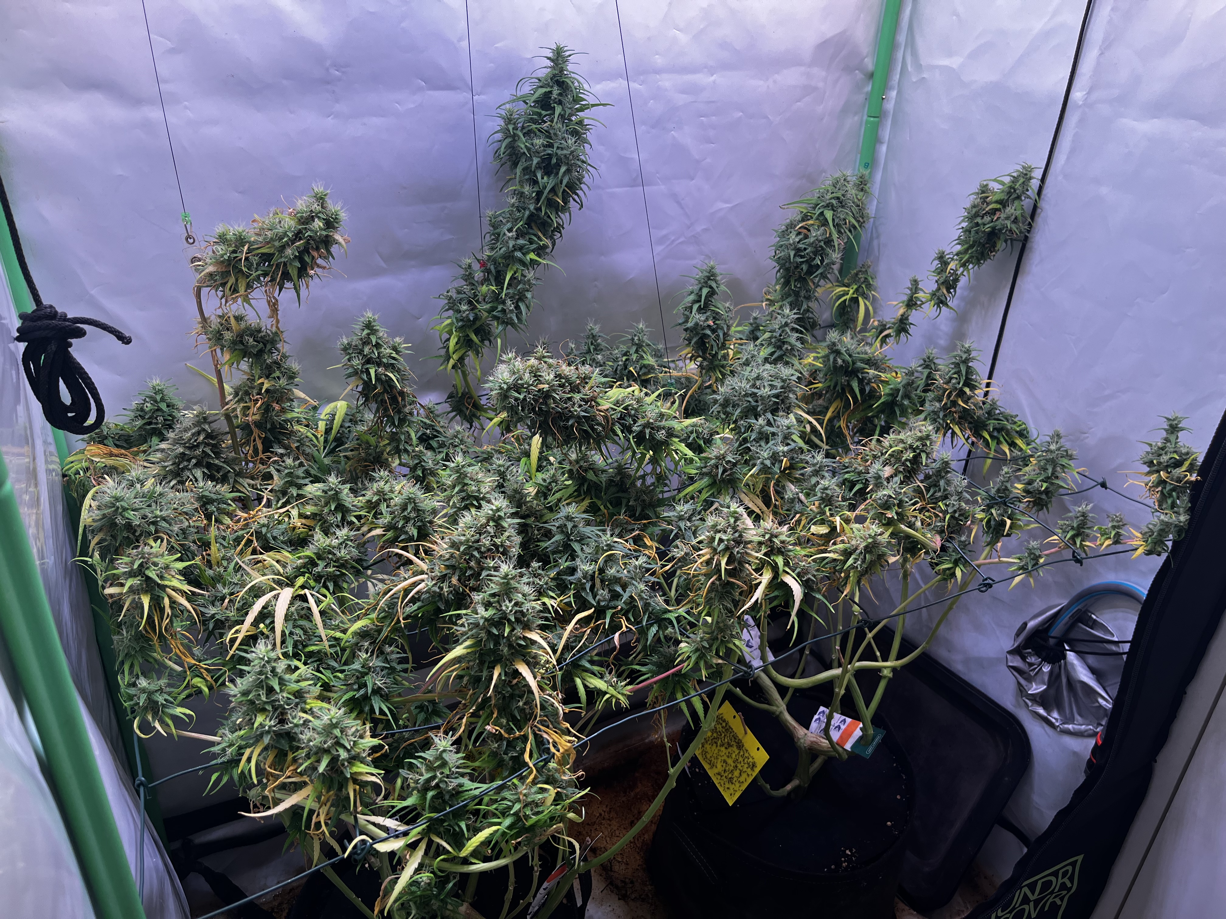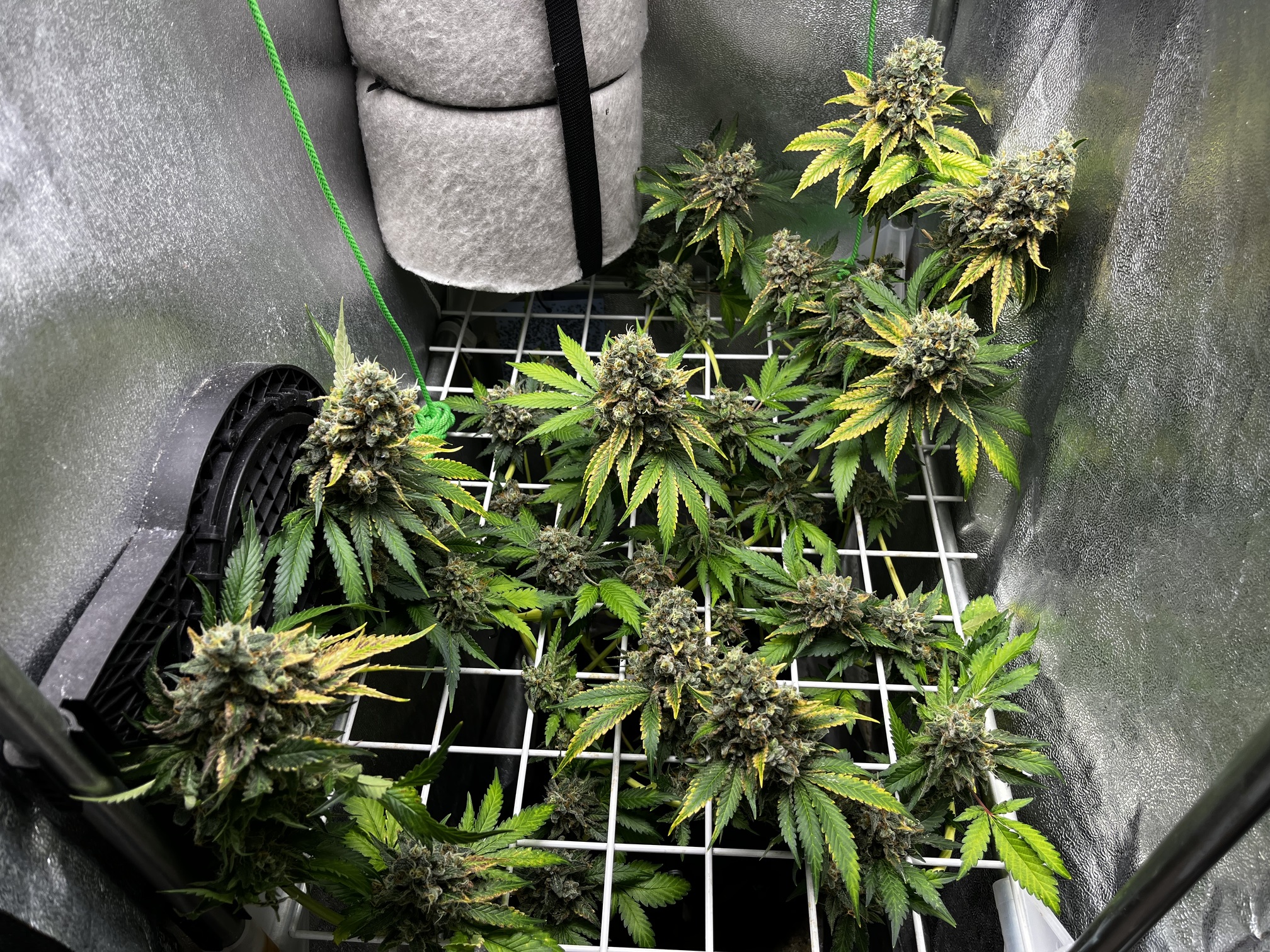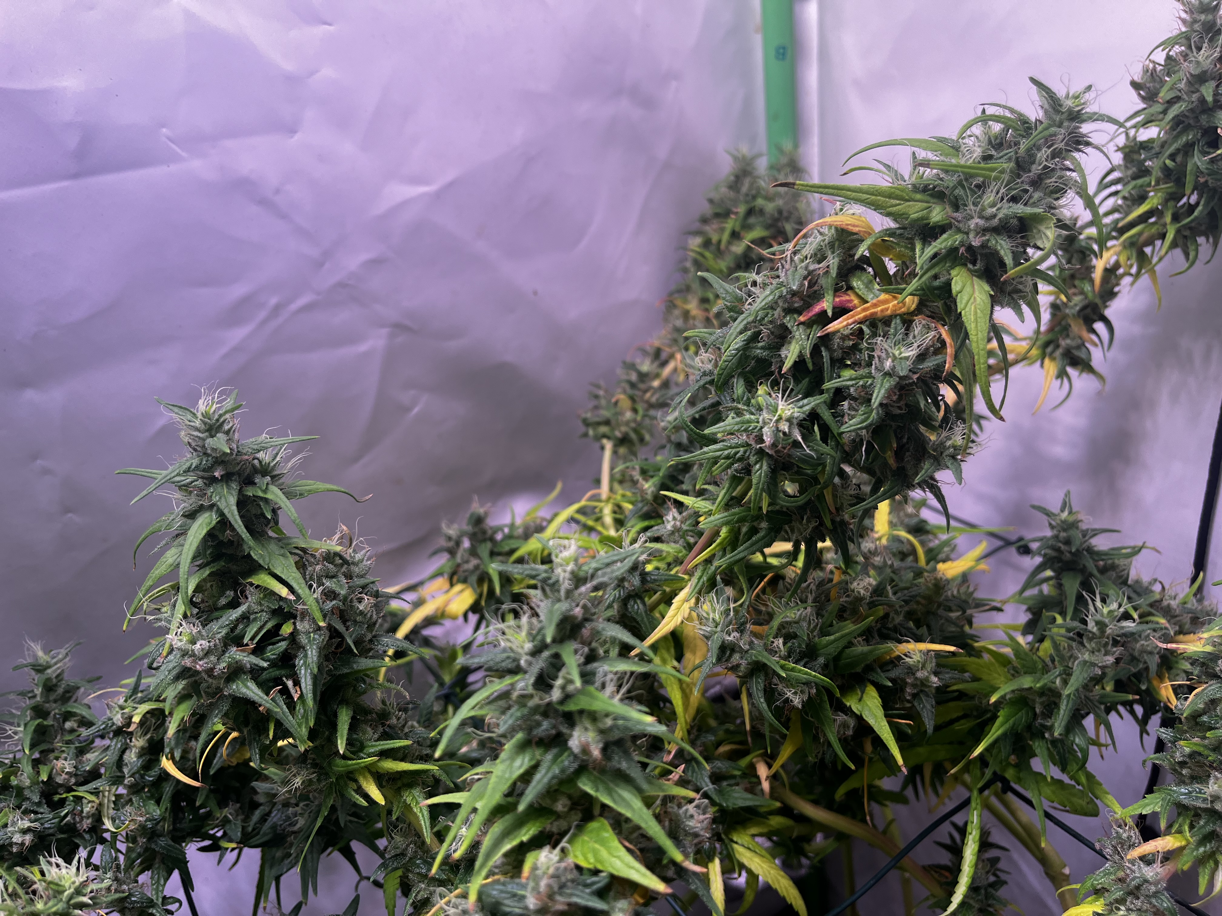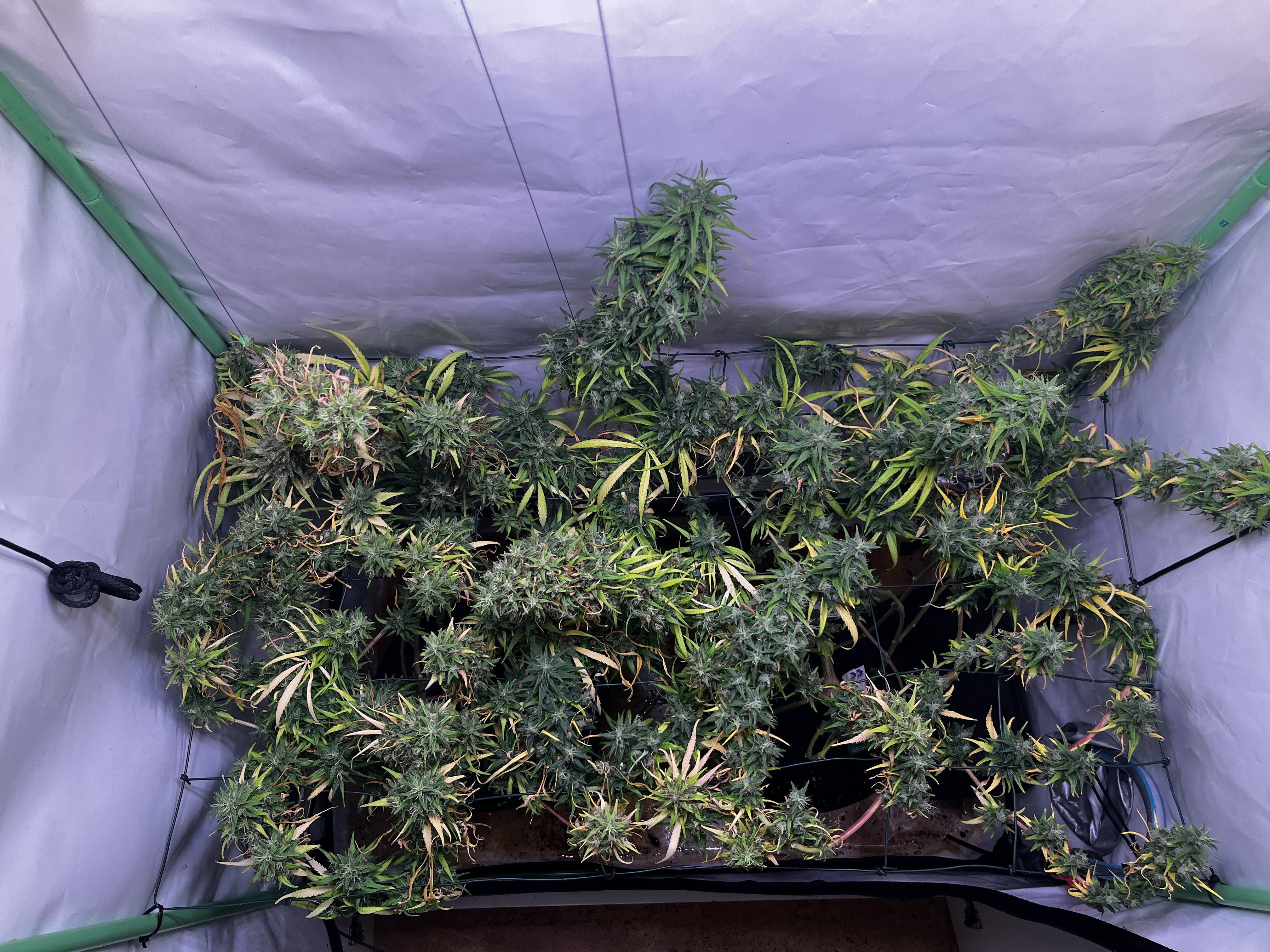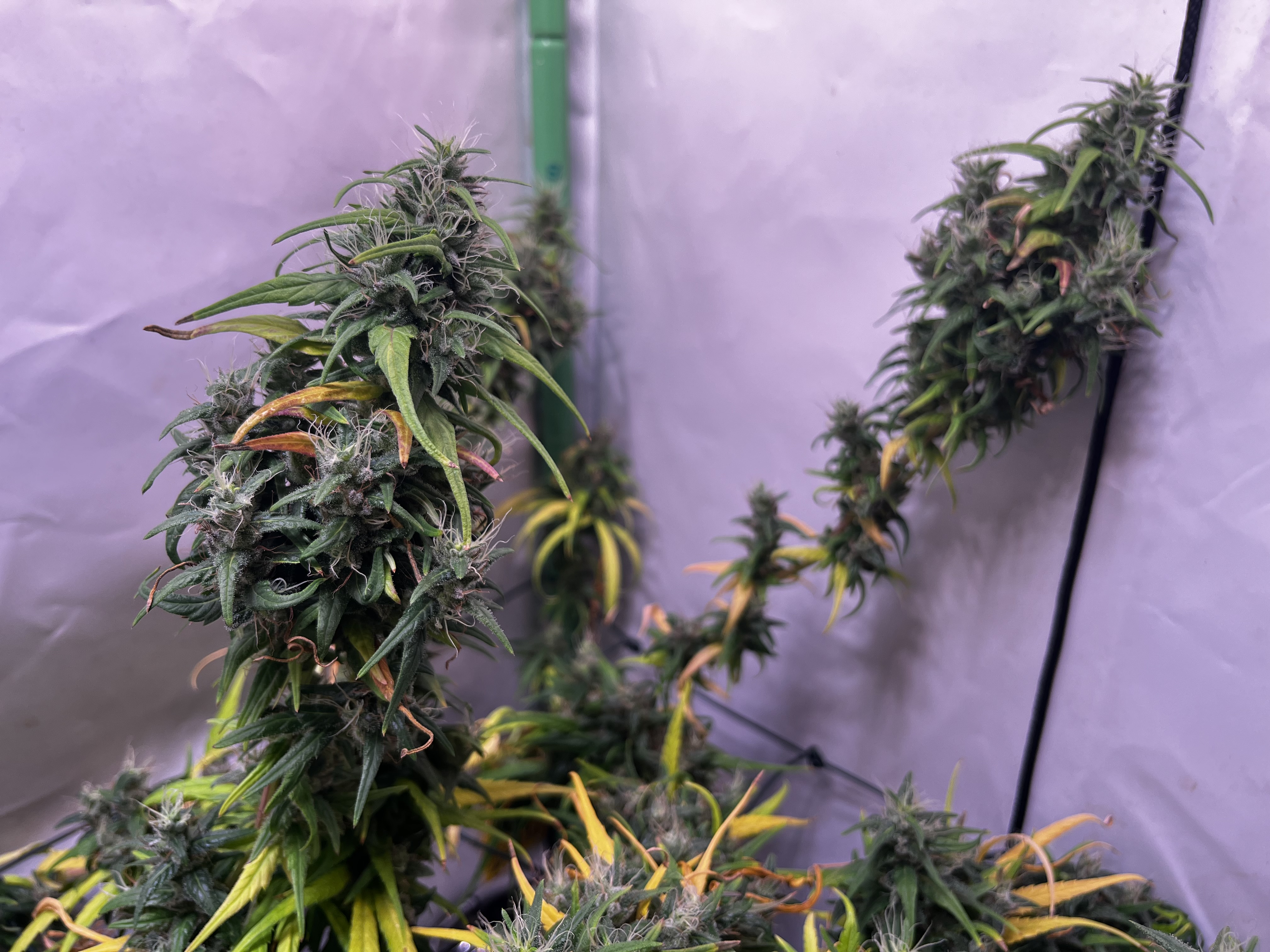 Das Nährstoffproblem hat sich noch weiter verschlimmert, aber mal kurz zur Herkunft. Nachdem ich vor ca 2 Wochen doch noch etwas Dünger gegeben habe, aufgrund von optischem Mangel hat sich das Fehlerbild weiter verschlimmert, also wurde etwas gespült. Der Anblick des Zelts ist eher semischön, viele Blätter sind gelb geworden und wurden entfernt. Zudem habe ich bemerkt, dass sich im Eck links hinten Spinnmilben angesiedelt haben und direkt gut zugeschlagen haben. Einzig der leichte Duft von Erdbeer relativiert etwas, bin gespannt wie’s in der Tüte schmeckt. Also alles in allem ein eher mieser Grow, notgeschlachtet wird demnächst wenn Zeit ist.