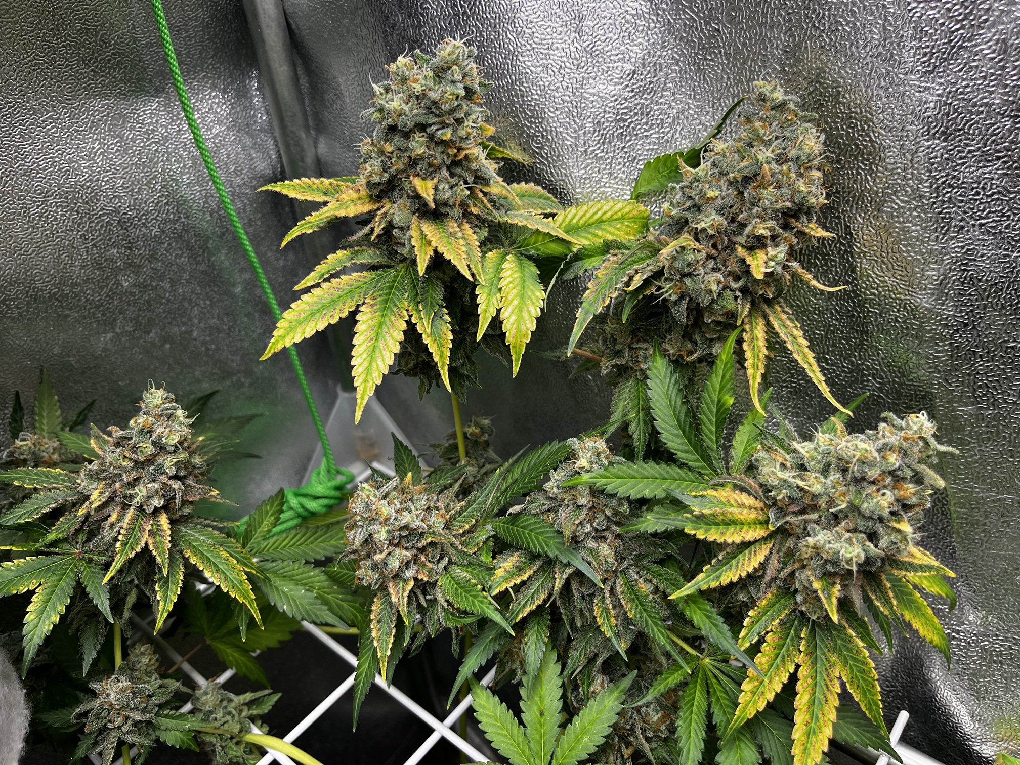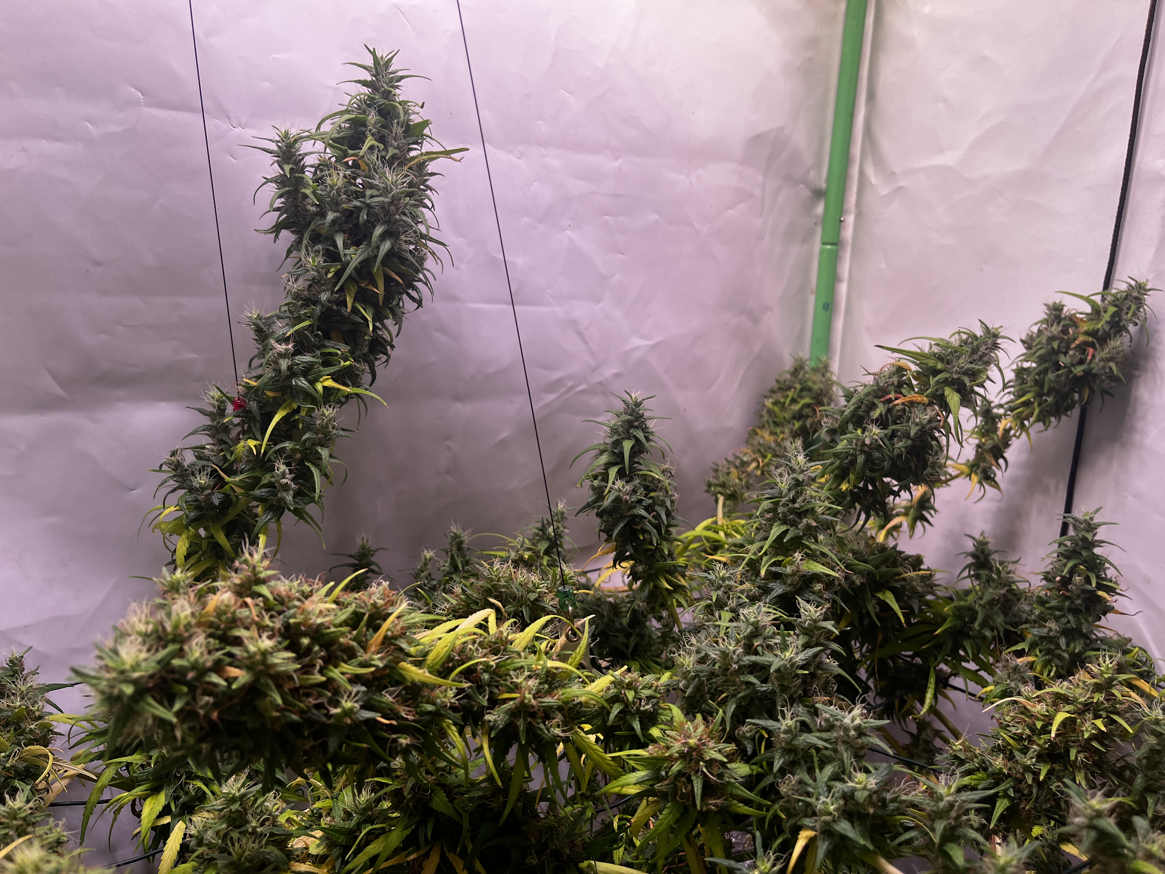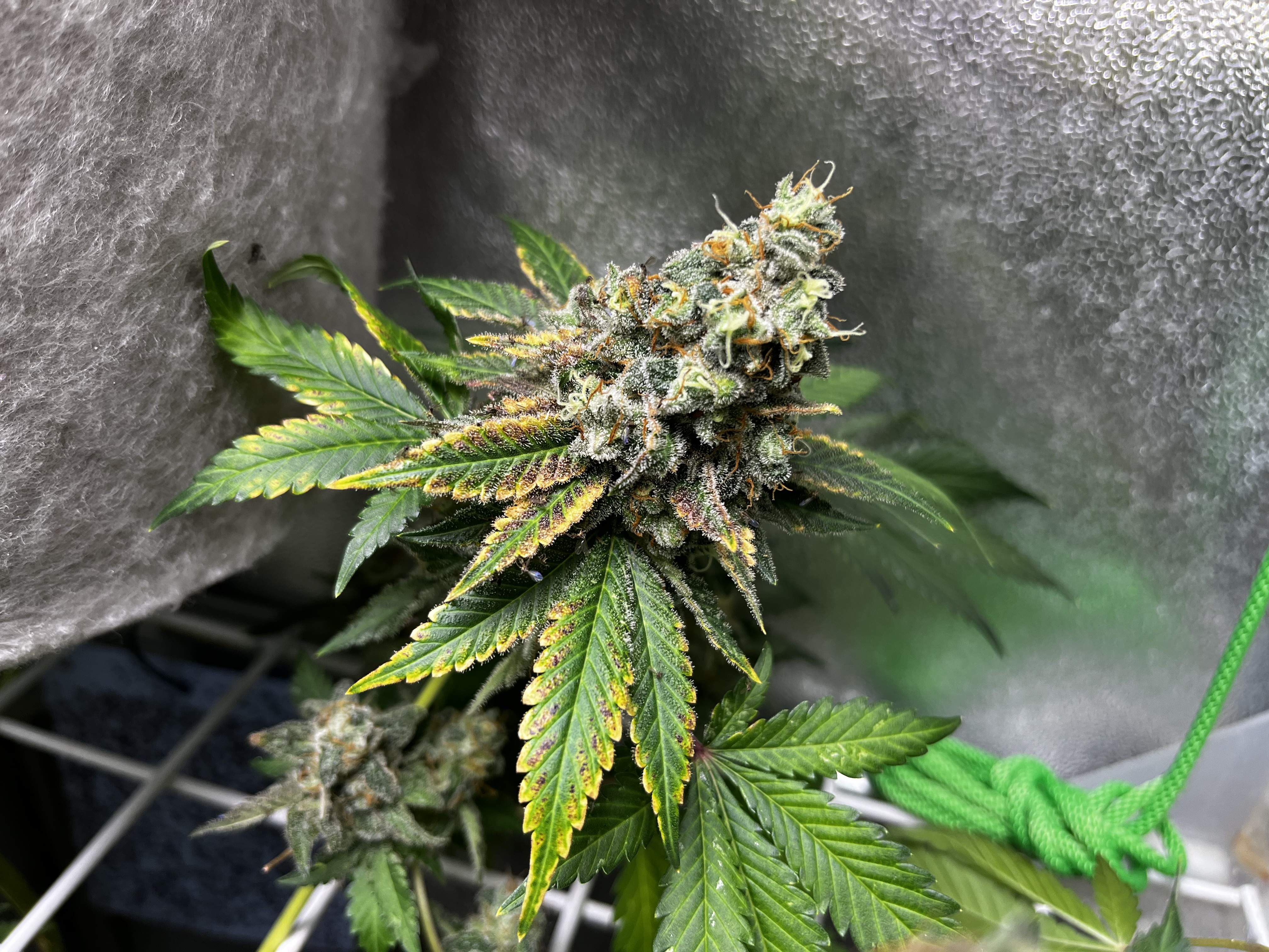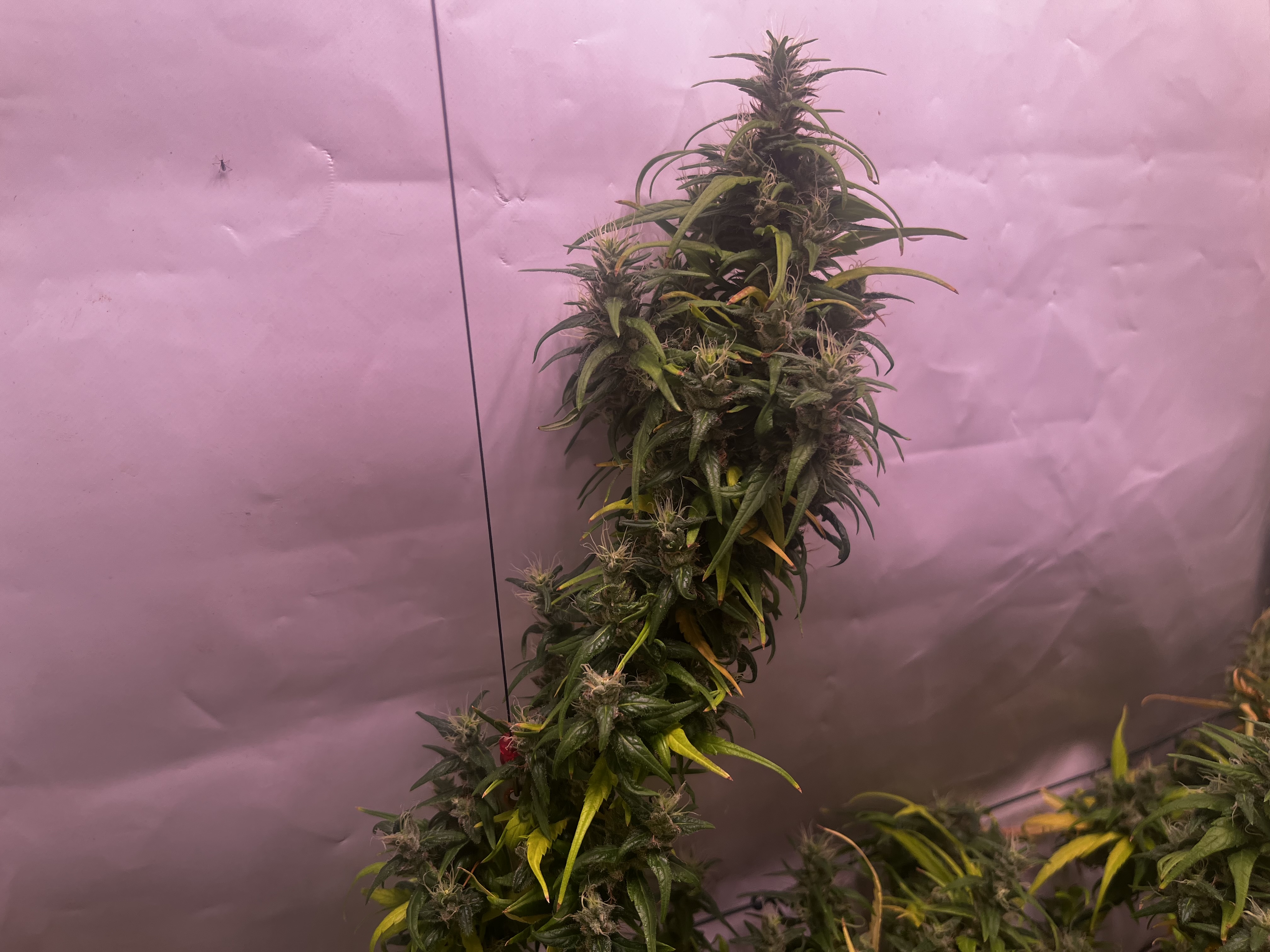 Das Nährstoffproblem hat sich noch weiter verschlimmert, aber mal kurz zur Herkunft. Nachdem ich vor ca 2 Wochen doch noch etwas Dünger gegeben habe, aufgrund von optischem Mangel hat sich das Fehlerbild weiter verschlimmert, also wurde etwas gespült. Der Anblick des Zelts ist eher semischön, viele Blätter sind gelb geworden und wurden entfernt. Zudem habe ich bemerkt, dass sich im Eck links hinten Spinnmilben angesiedelt haben und direkt gut zugeschlagen haben. Einzig der leichte Duft von Erdbeer relativiert etwas, bin gespannt wie’s in der Tüte schmeckt. Also alles in allem ein eher mieser Grow, notgeschlachtet wird demnächst wenn Zeit ist.