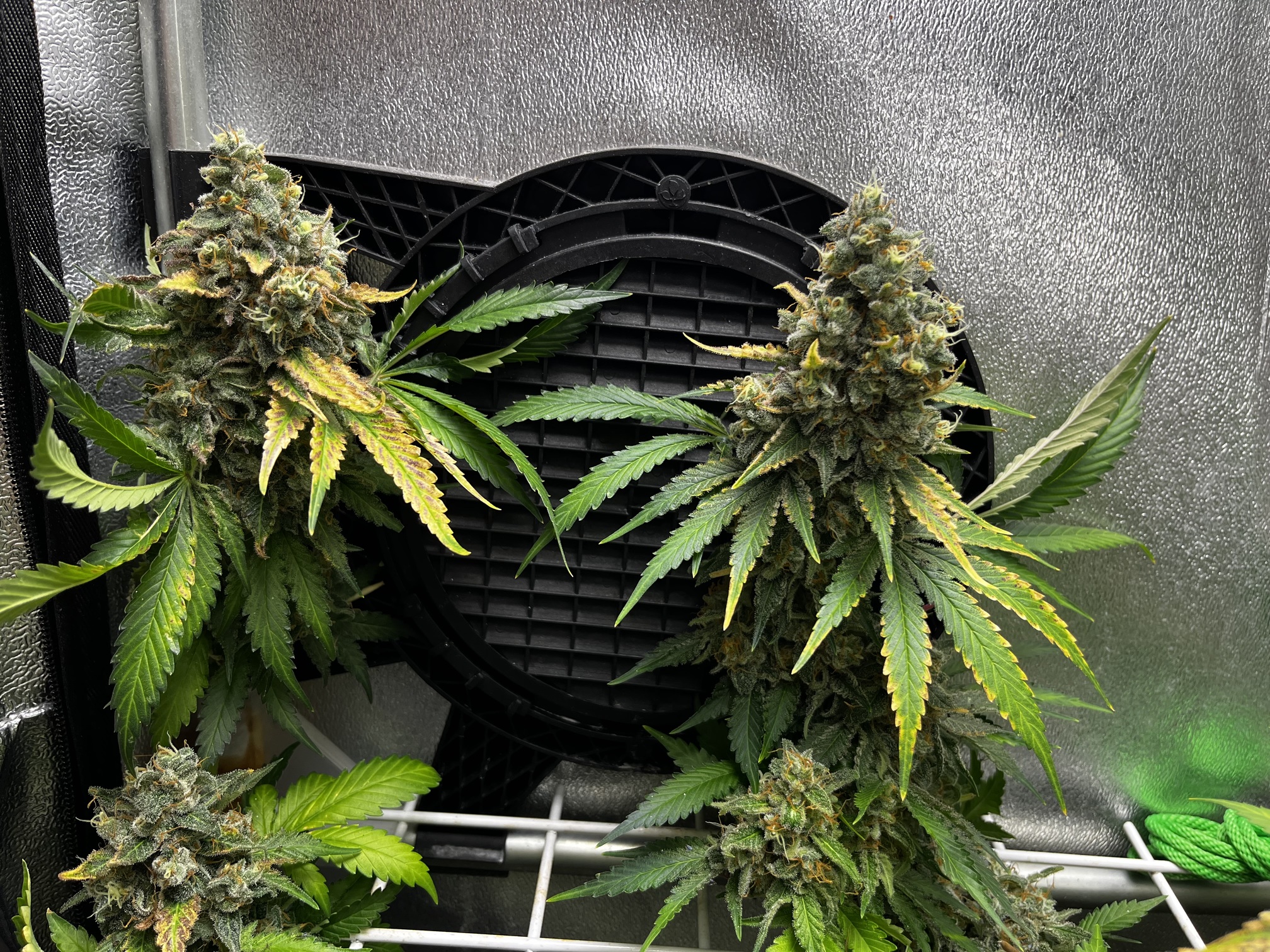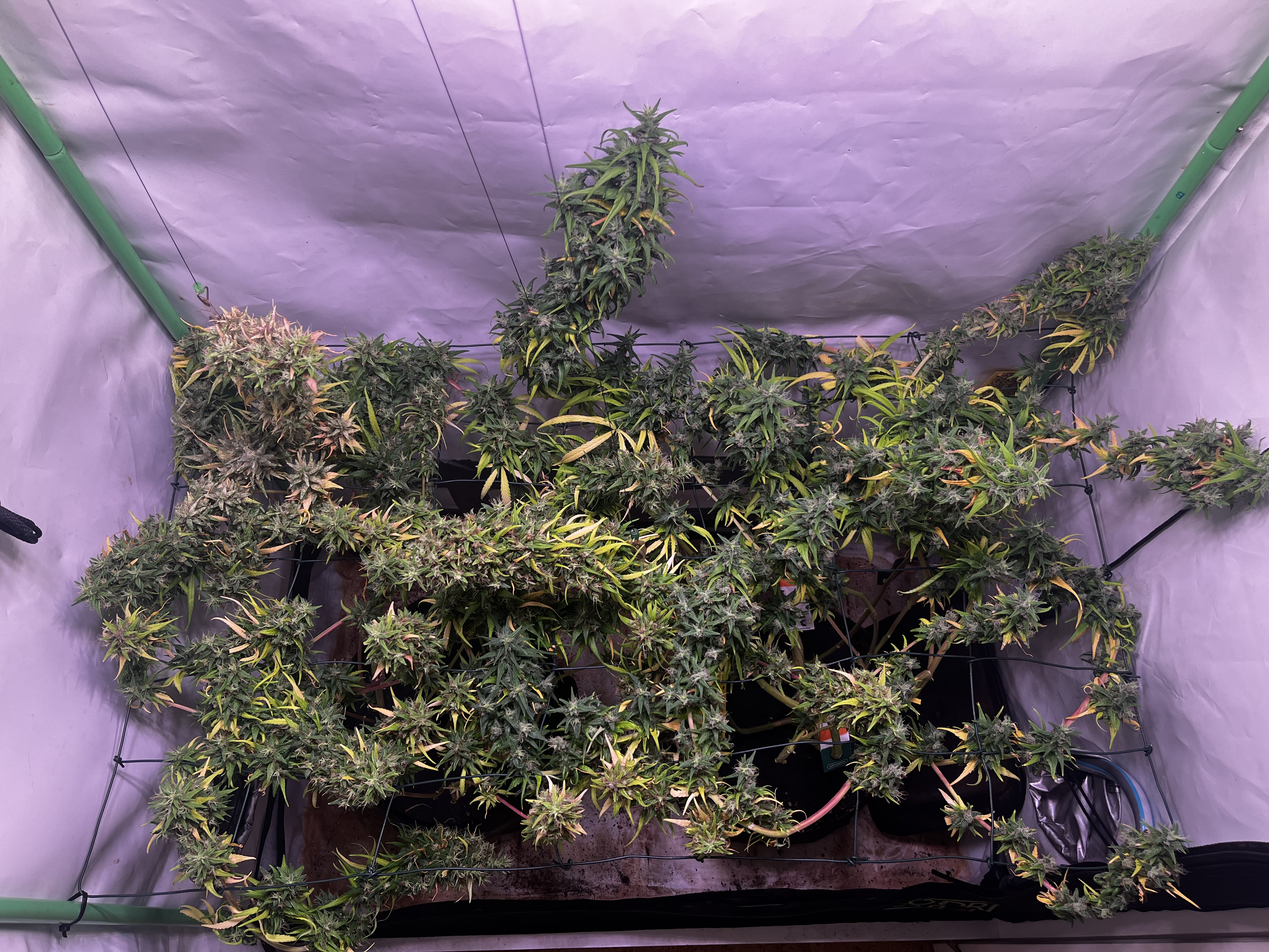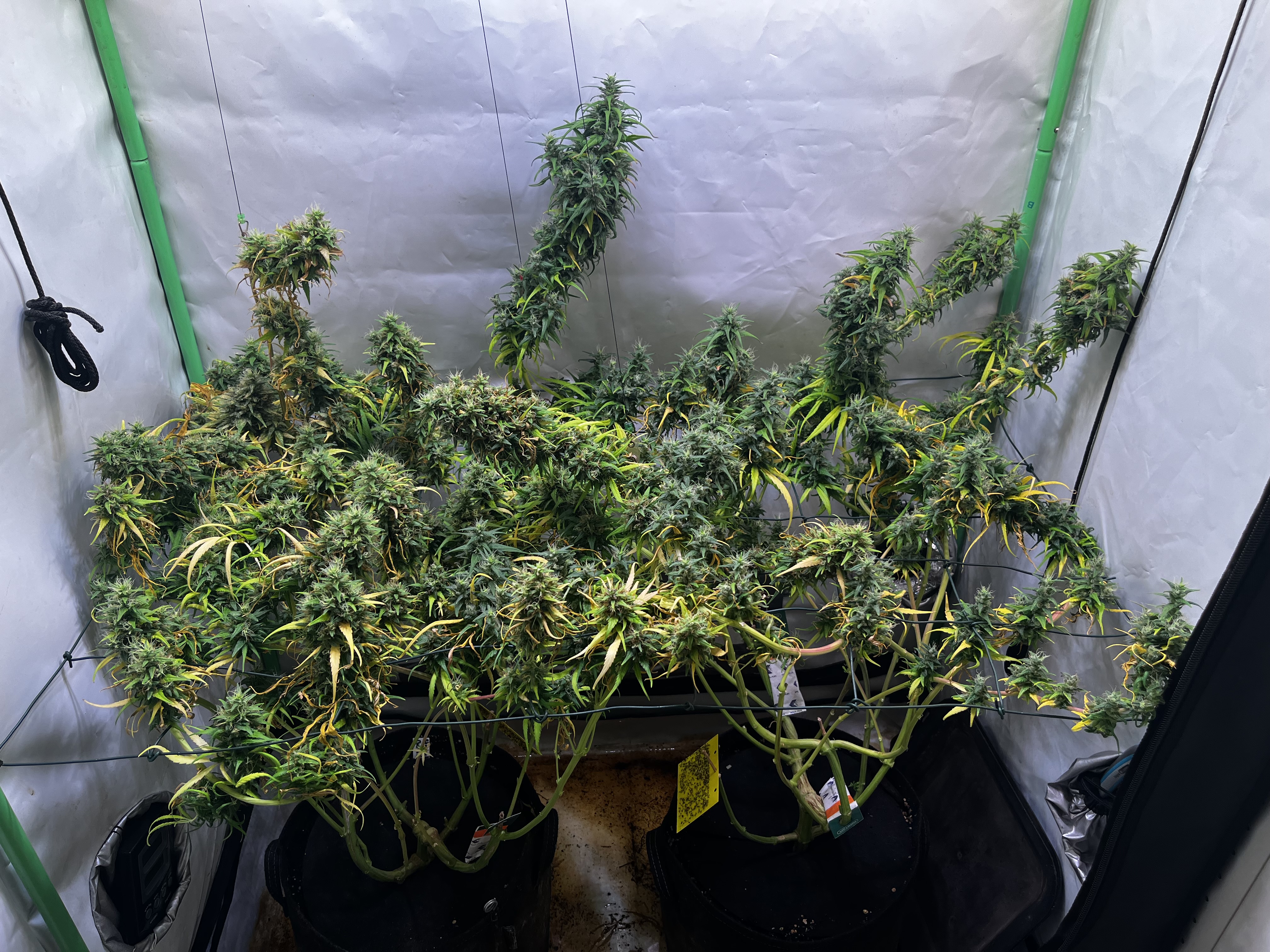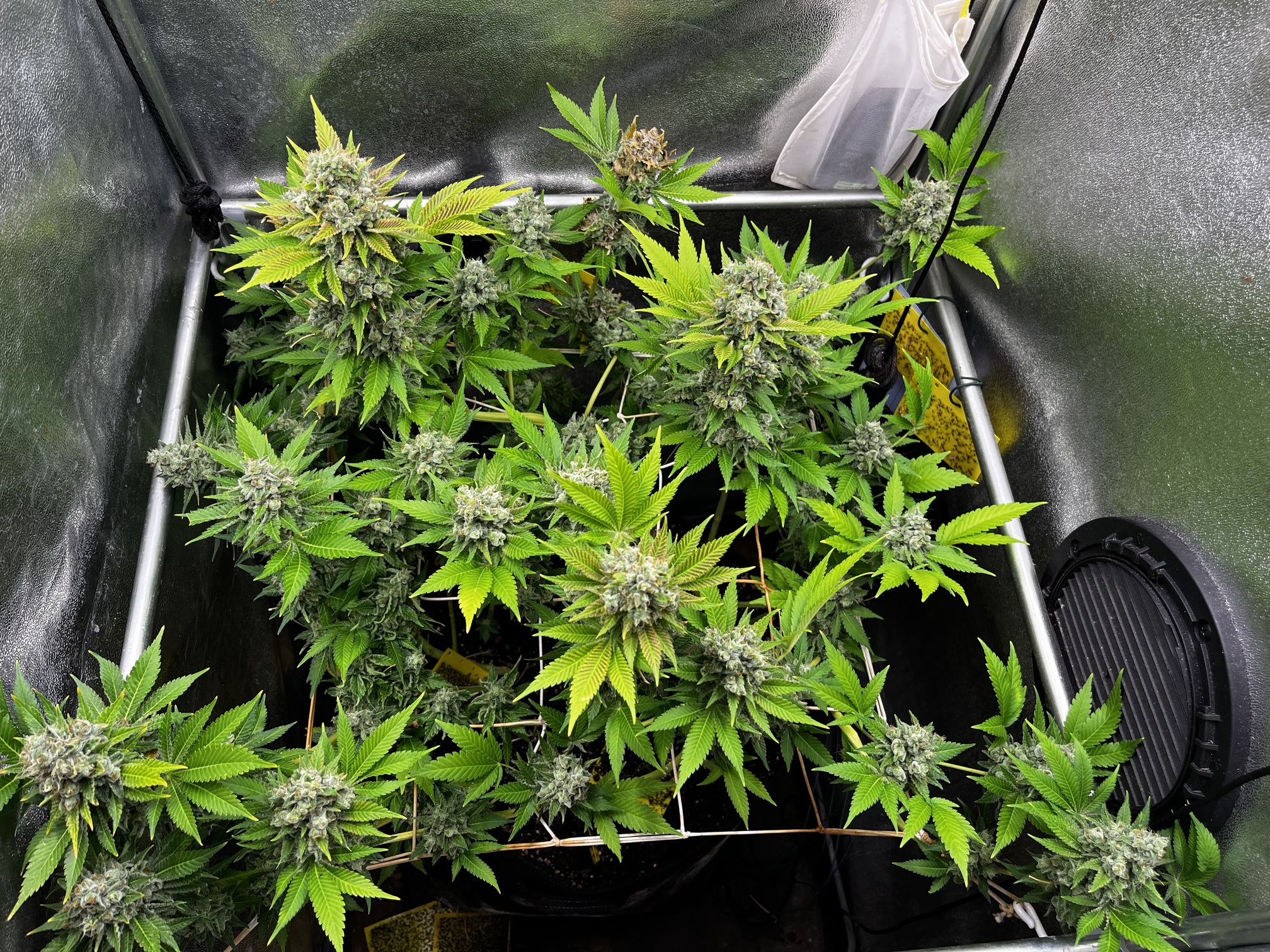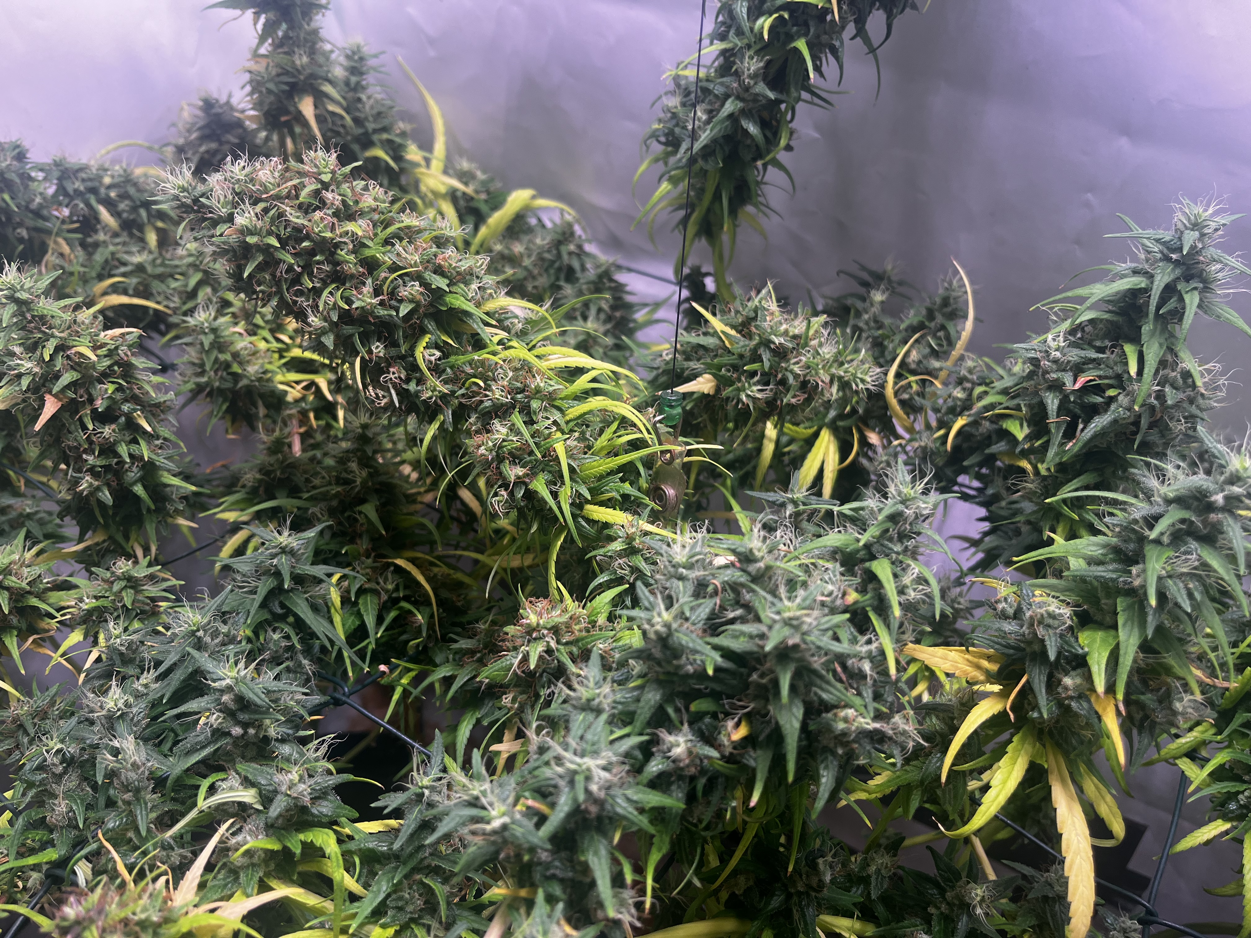 Das Nährstoffproblem hat sich noch weiter verschlimmert, aber mal kurz zur Herkunft. Nachdem ich vor ca 2 Wochen doch noch etwas Dünger gegeben habe, aufgrund von optischem Mangel hat sich das Fehlerbild weiter verschlimmert, also wurde etwas gespült. Der Anblick des Zelts ist eher semischön, viele Blätter sind gelb geworden und wurden entfernt. Zudem habe ich bemerkt, dass sich im Eck links hinten Spinnmilben angesiedelt haben und direkt gut zugeschlagen haben. Einzig der leichte Duft von Erdbeer relativiert etwas, bin gespannt wie’s in der Tüte schmeckt. Also alles in allem ein eher mieser Grow, notgeschlachtet wird demnächst wenn Zeit ist.