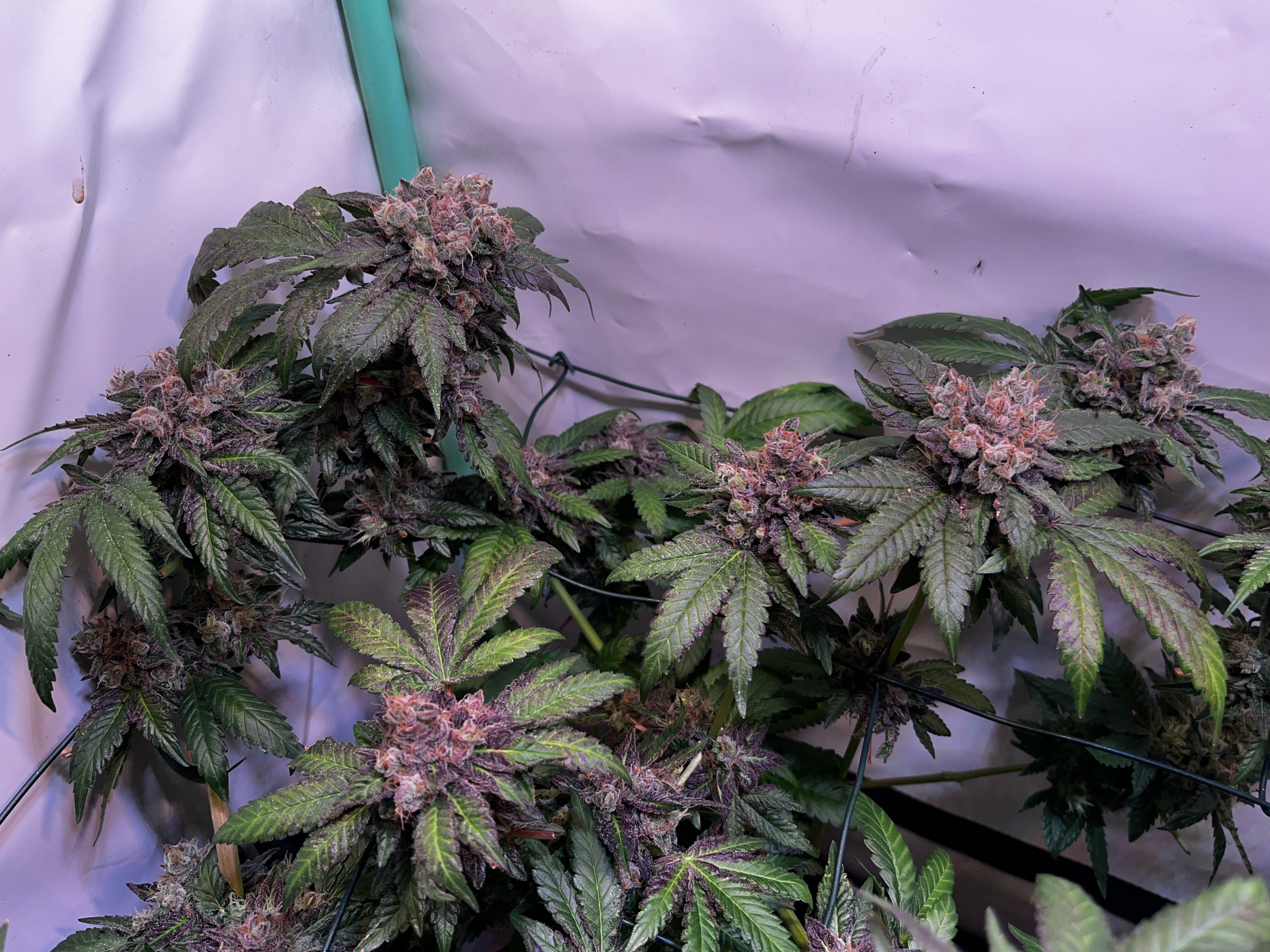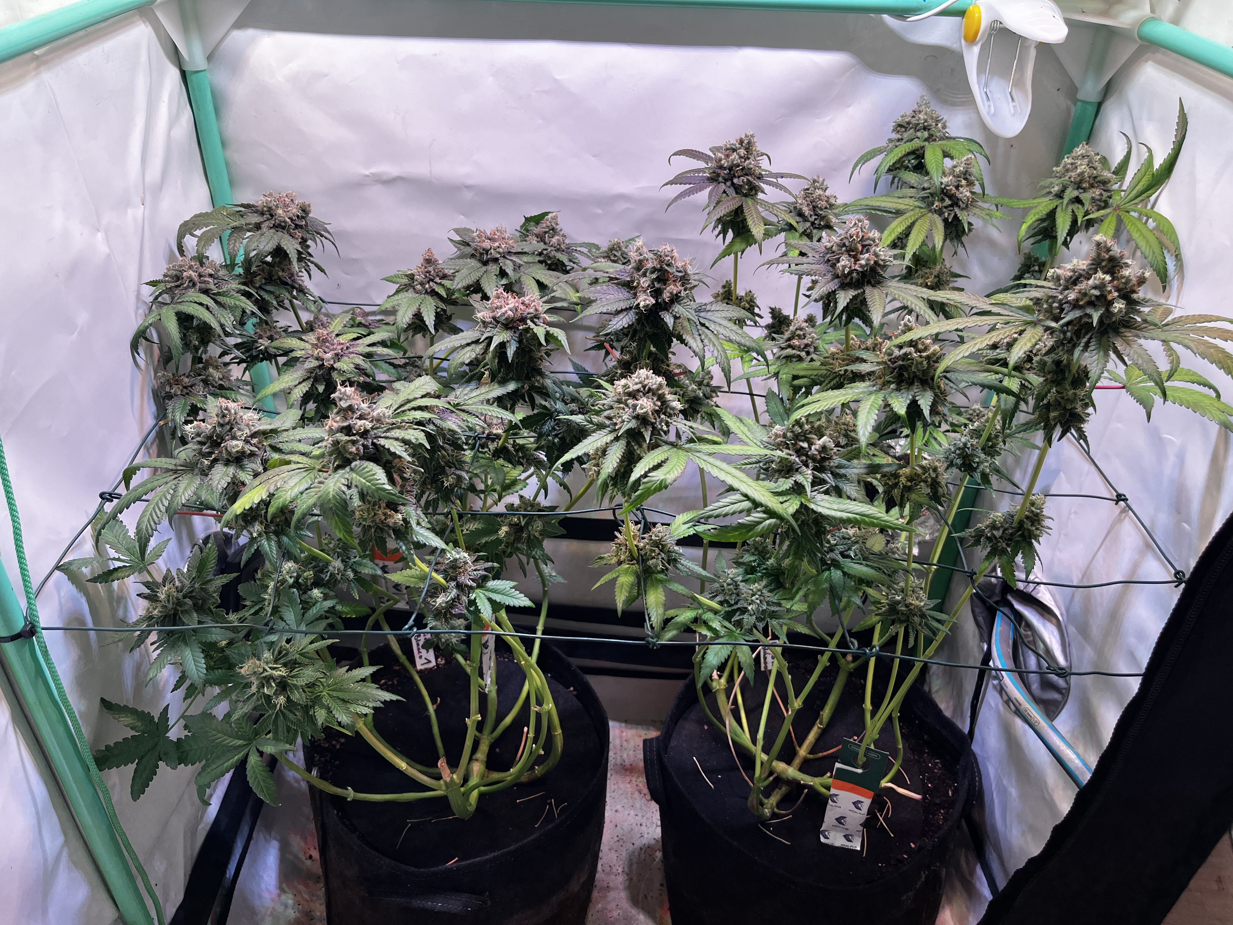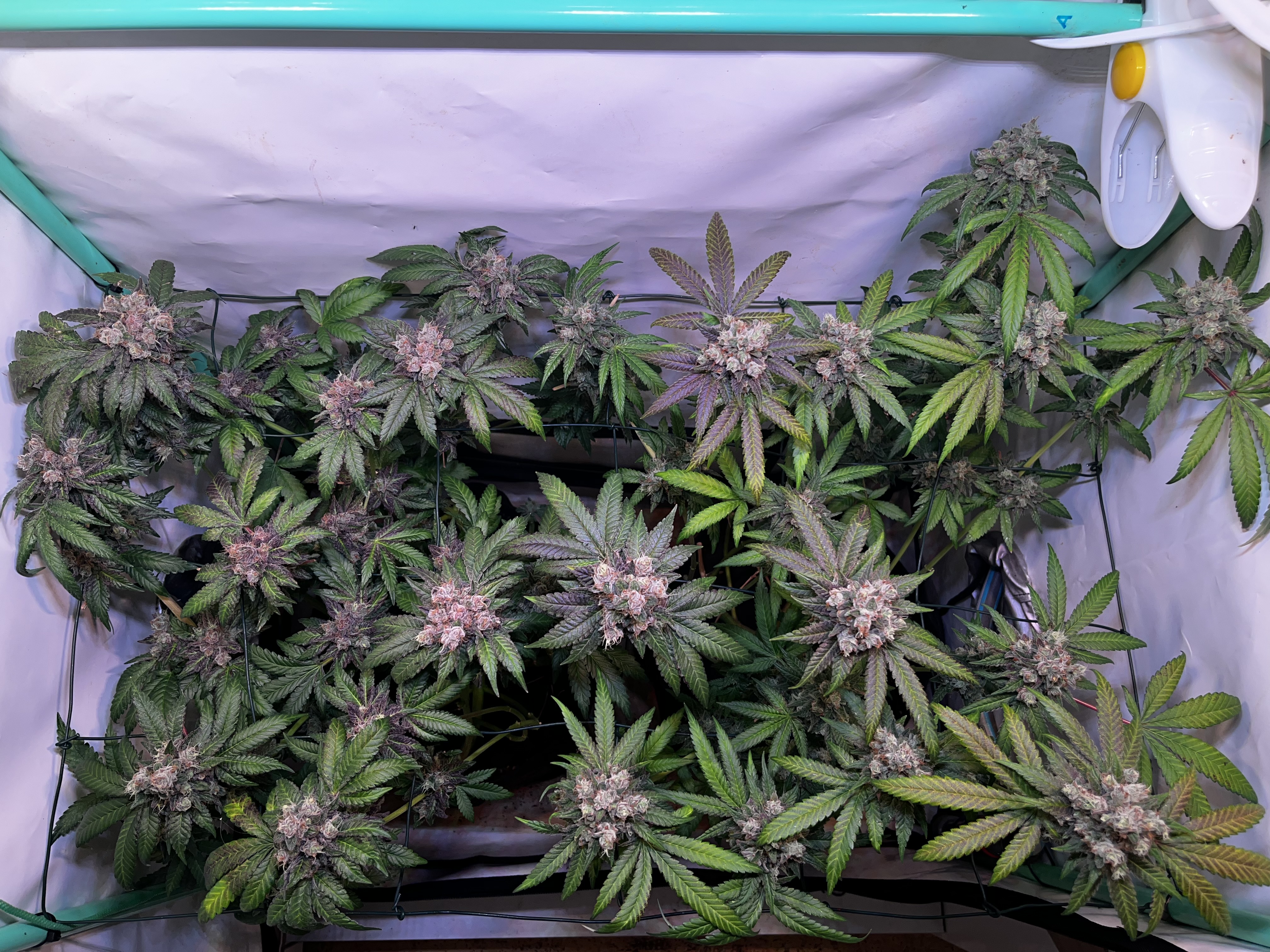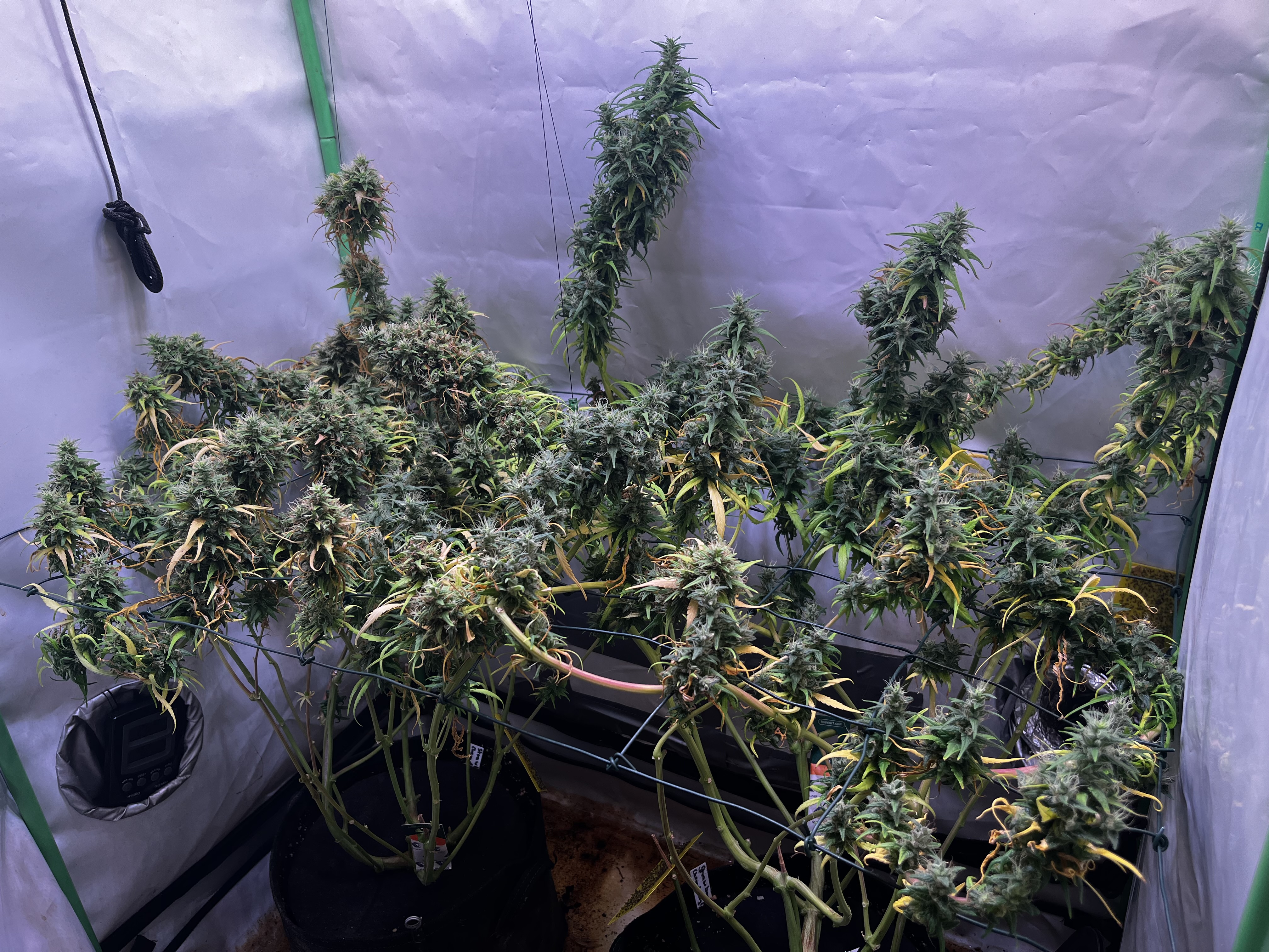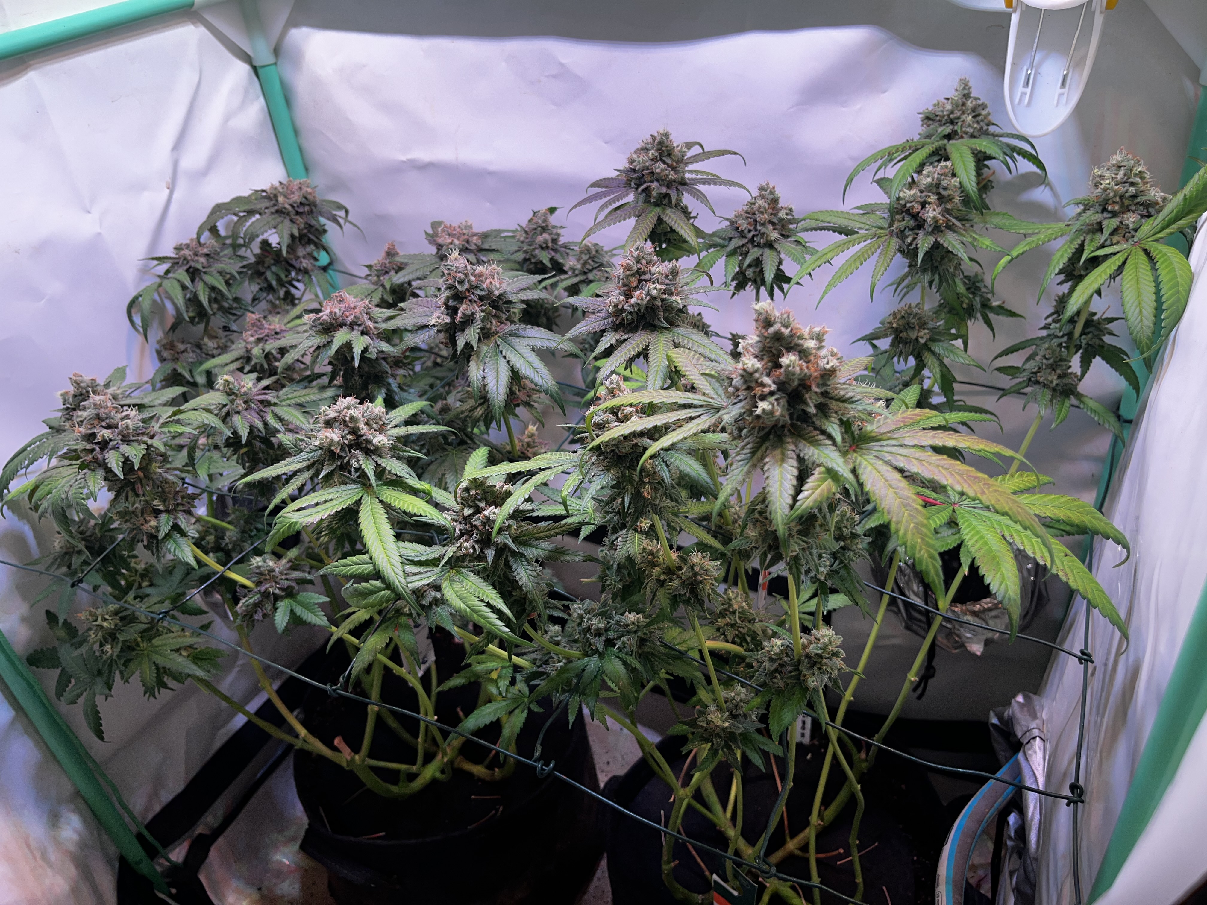Das Nährstoffproblem hat sich noch weiter verschlimmert, aber mal kurz zur Herkunft. Nachdem ich vor ca 2 Wochen doch noch etwas Dünger gegeben habe, aufgrund von optischem Mangel hat sich das Fehlerbild weiter verschlimmert, also wurde etwas gespült. Der Anblick des Zelts ist eher semischön, viele Blätter sind gelb geworden und wurden entfernt. Zudem habe ich bemerkt, dass sich im Eck links hinten Spinnmilben angesiedelt haben und direkt gut zugeschlagen haben. Einzig der leichte Duft von Erdbeer relativiert etwas, bin gespannt wie’s in der Tüte schmeckt. Also alles in allem ein eher mieser Grow, notgeschlachtet wird demnächst wenn Zeit ist.