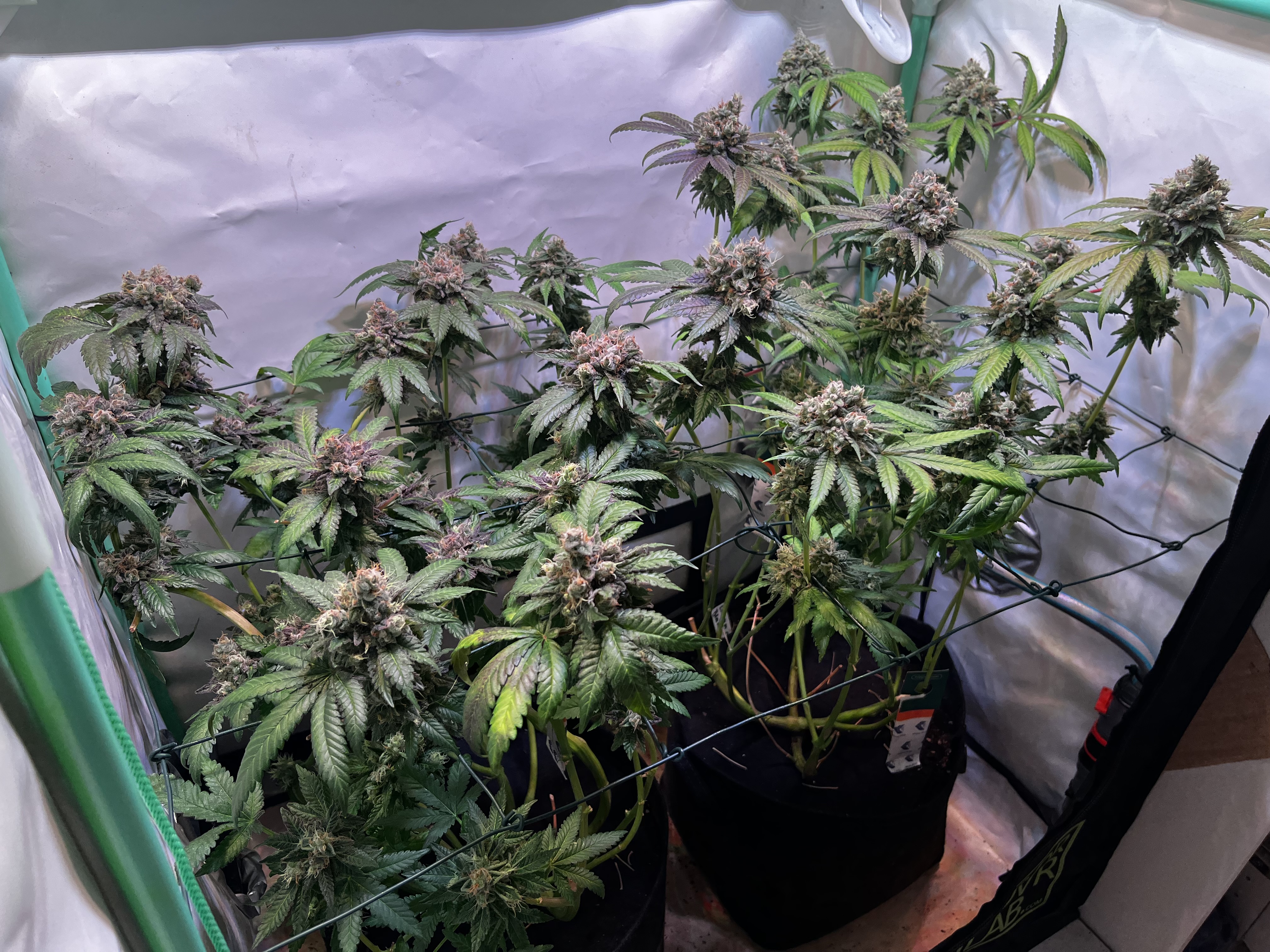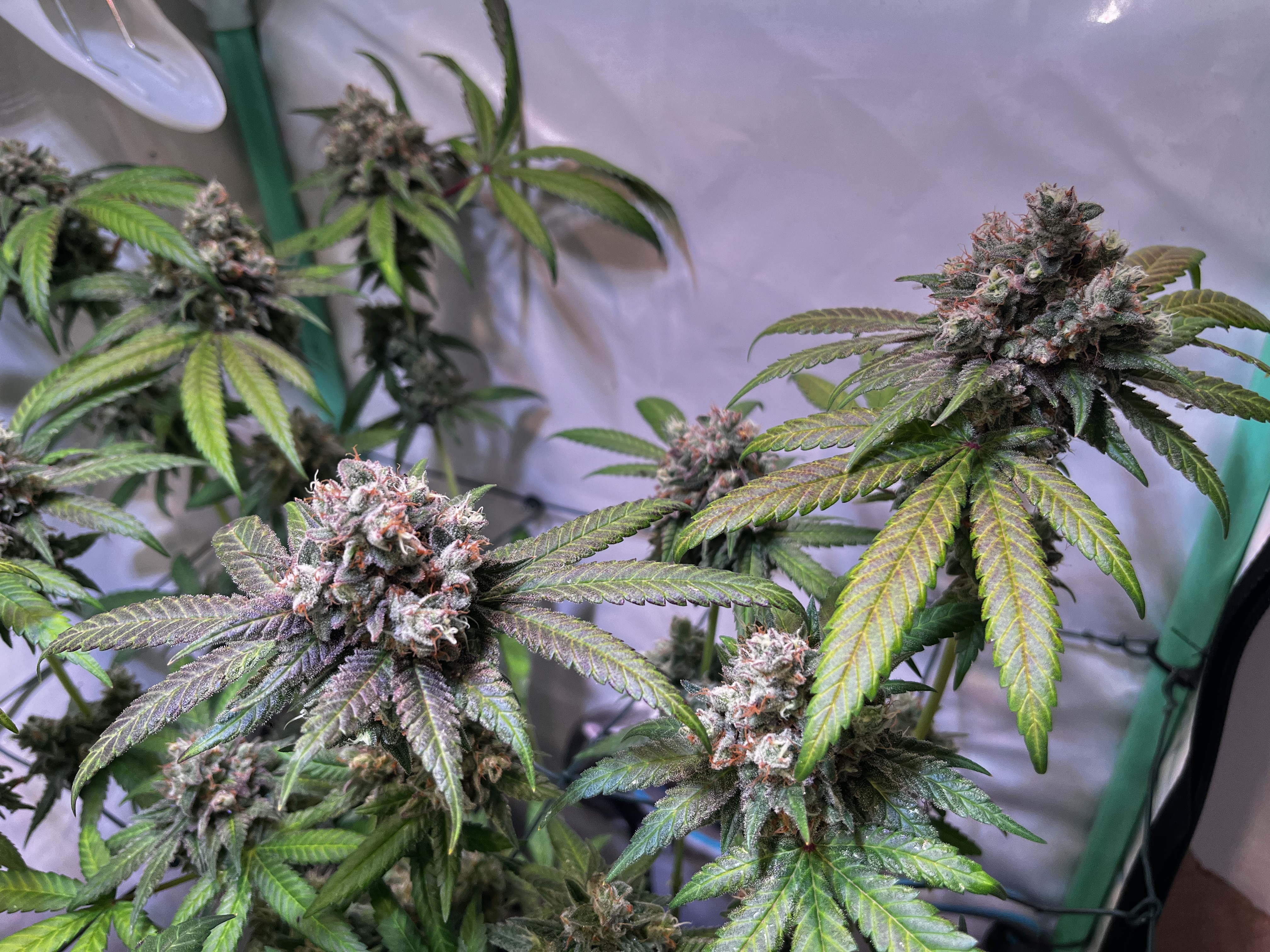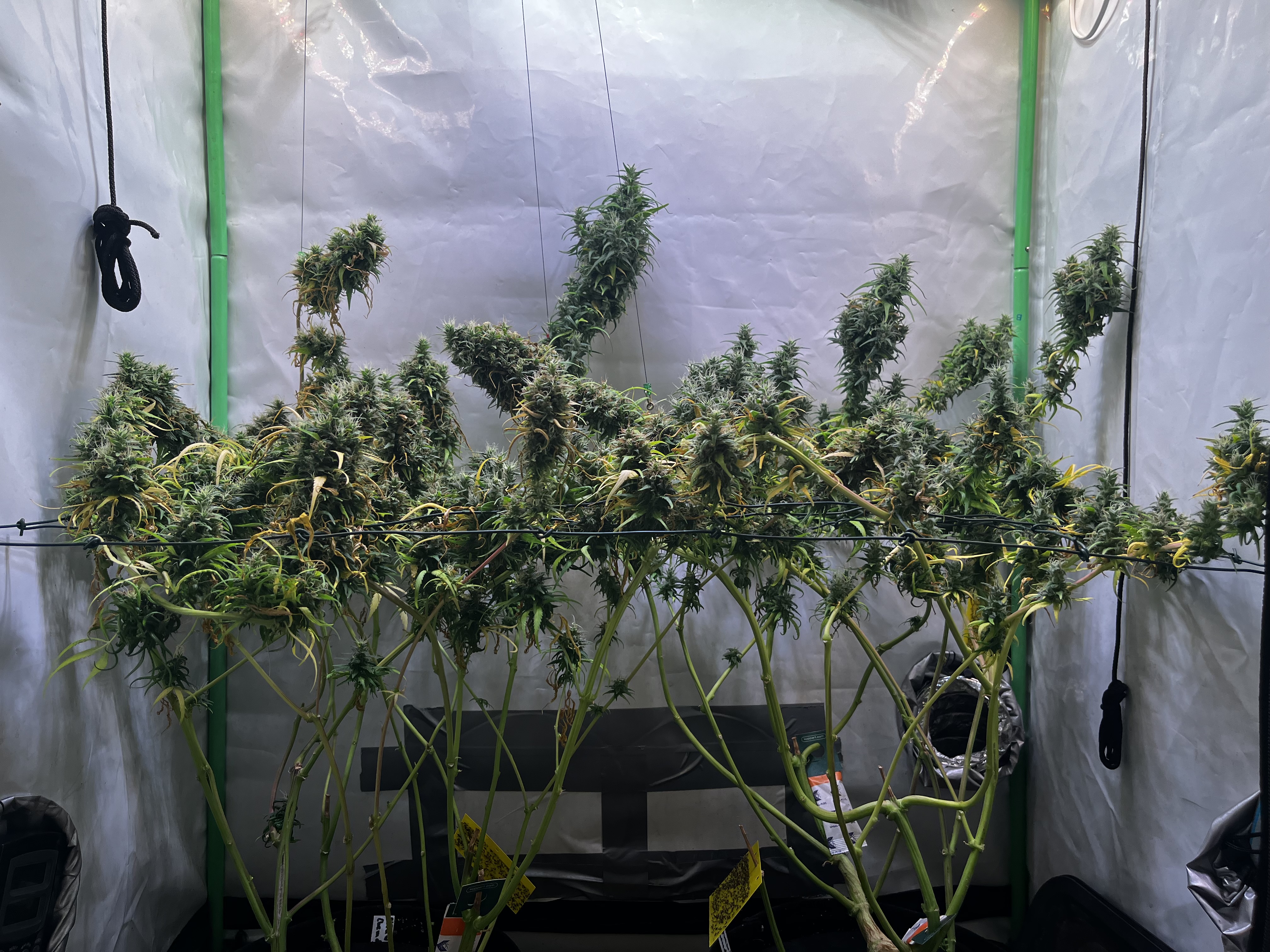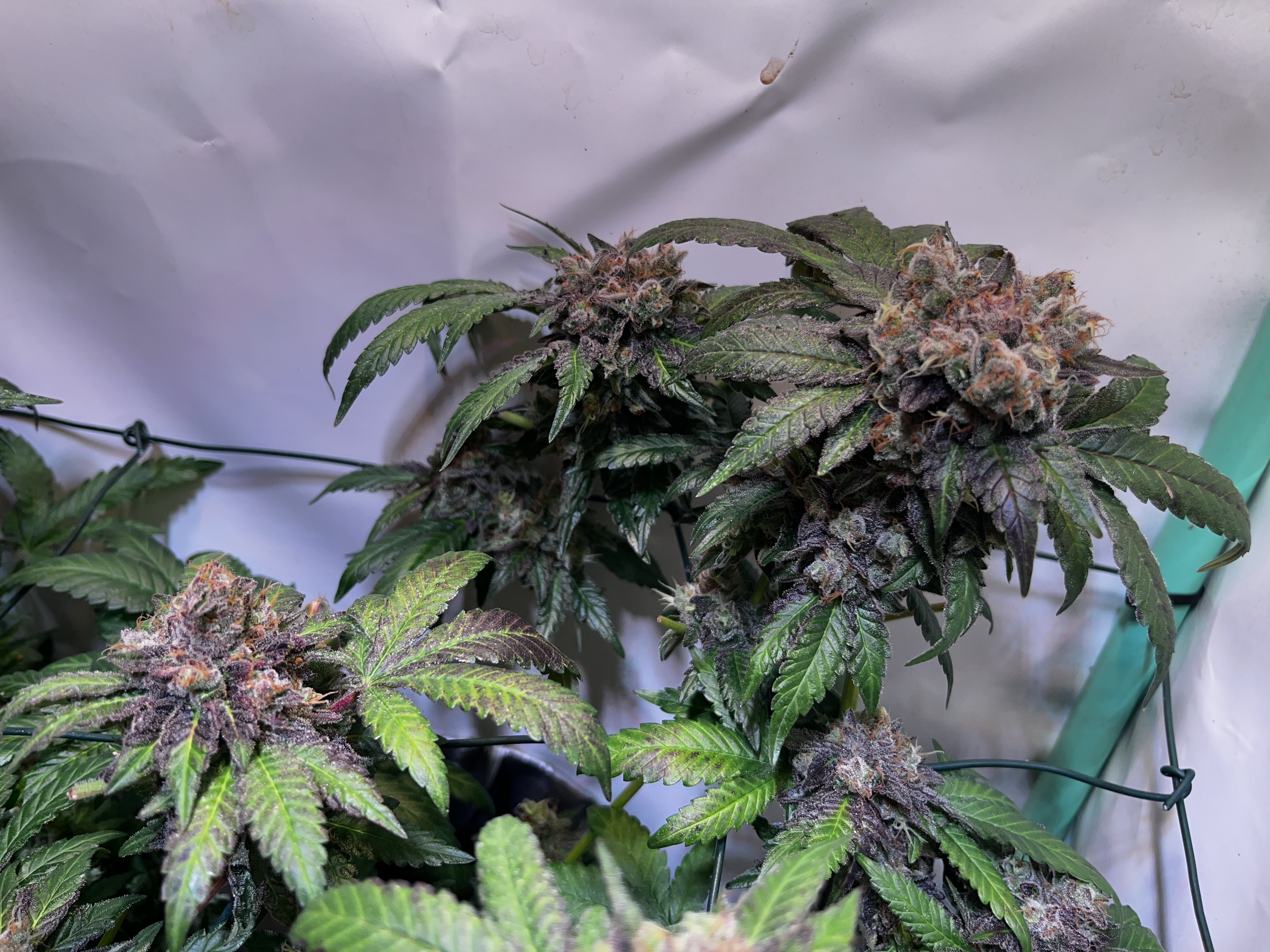 Das Nährstoffproblem hat sich noch weiter verschlimmert, aber mal kurz zur Herkunft. Nachdem ich vor ca 2 Wochen doch noch etwas Dünger gegeben habe, aufgrund von optischem Mangel hat sich das Fehlerbild weiter verschlimmert, also wurde etwas gespült. Der Anblick des Zelts ist eher semischön, viele Blätter sind gelb geworden und wurden entfernt. Zudem habe ich bemerkt, dass sich im Eck links hinten Spinnmilben angesiedelt haben und direkt gut zugeschlagen haben. Einzig der leichte Duft von Erdbeer relativiert etwas, bin gespannt wie’s in der Tüte schmeckt. Also alles in allem ein eher mieser Grow, notgeschlachtet wird demnächst wenn Zeit ist.