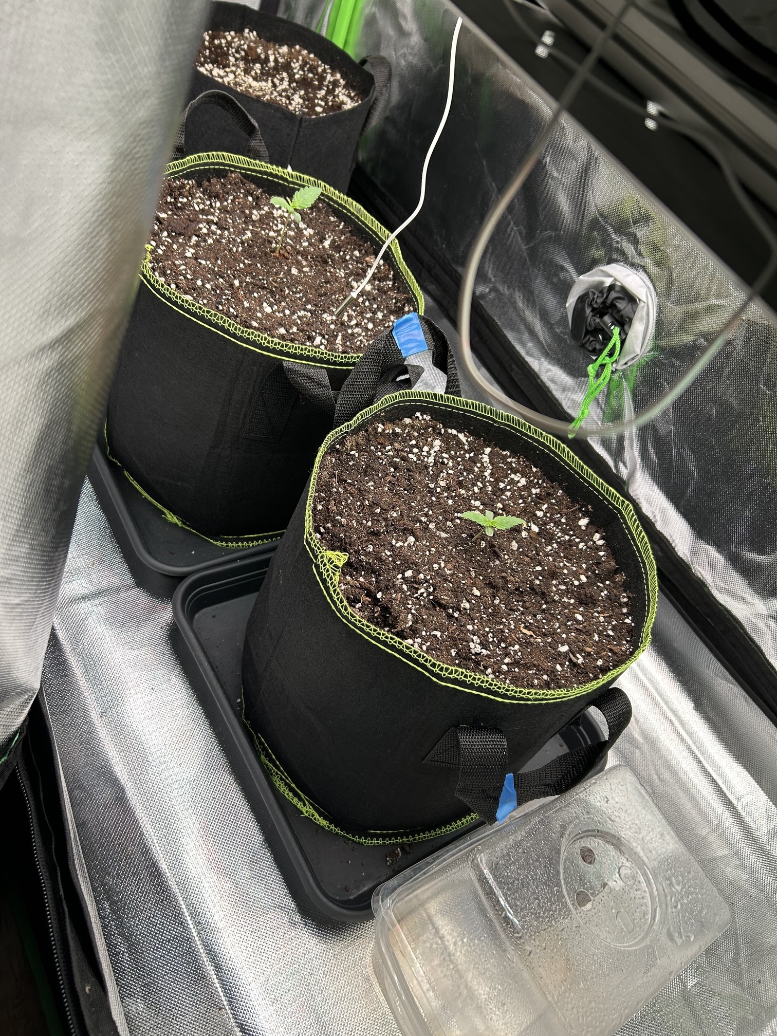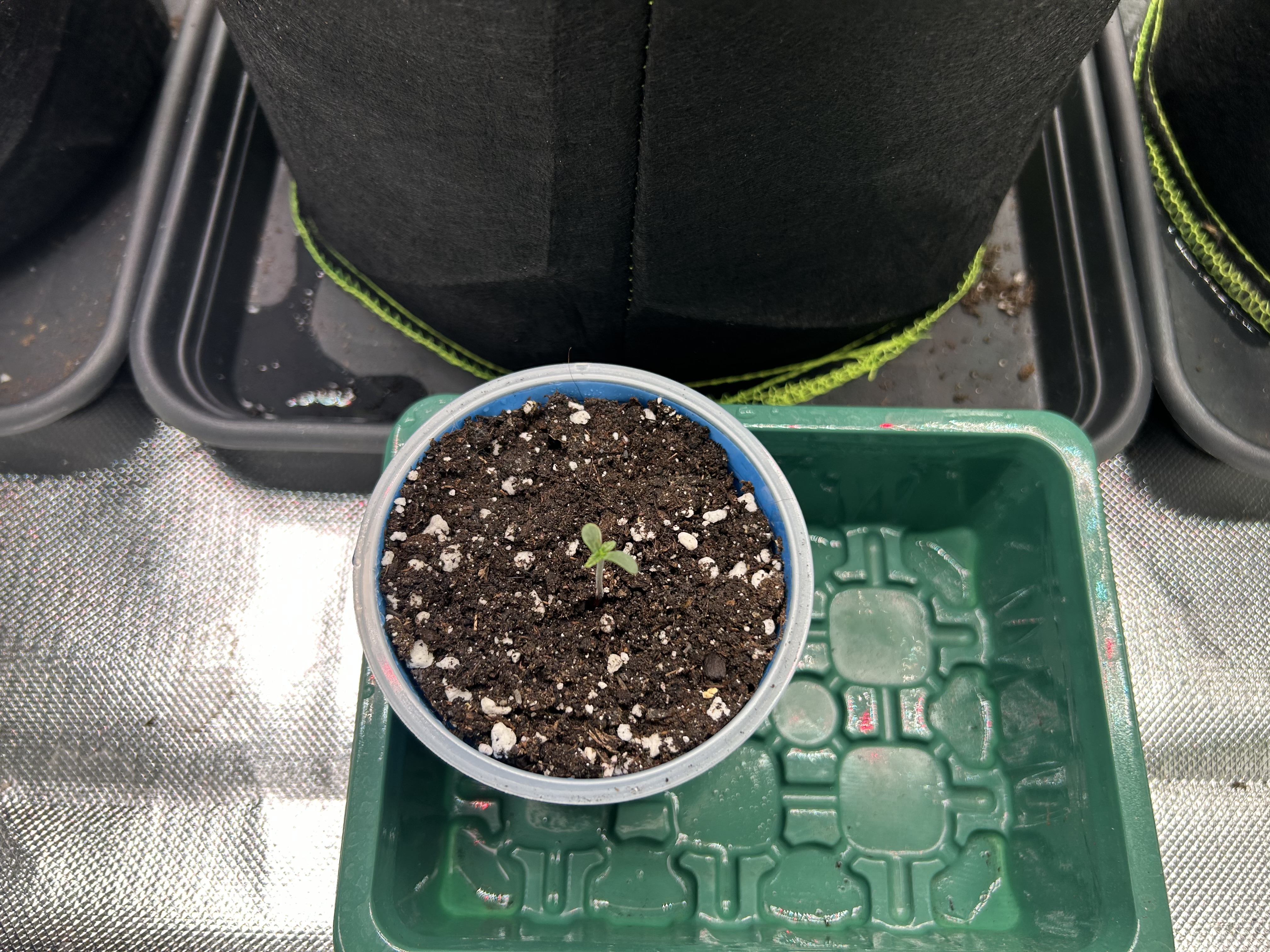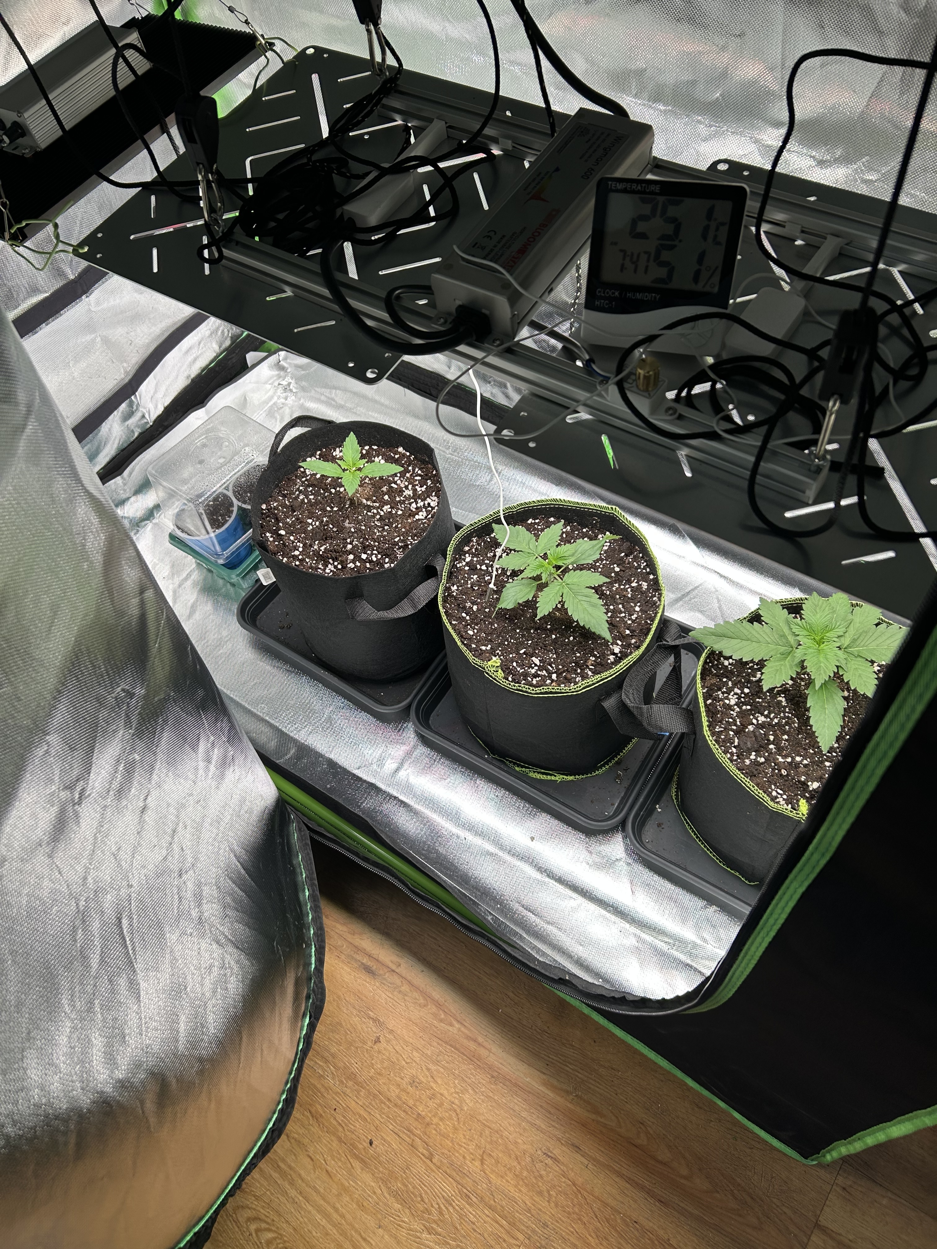 Hatte mal Langeweile und kam auf die glorreiche Idee 2 weitere Samen zu Keimen und die in 2 Plastikbecher mit durchbohrten Boden und 1:1 der gleiche Substrat wie die 11l Töpfe…(natürlich 20x weniger im Verhältnis ) zu züchten. Also ein Cupgrow