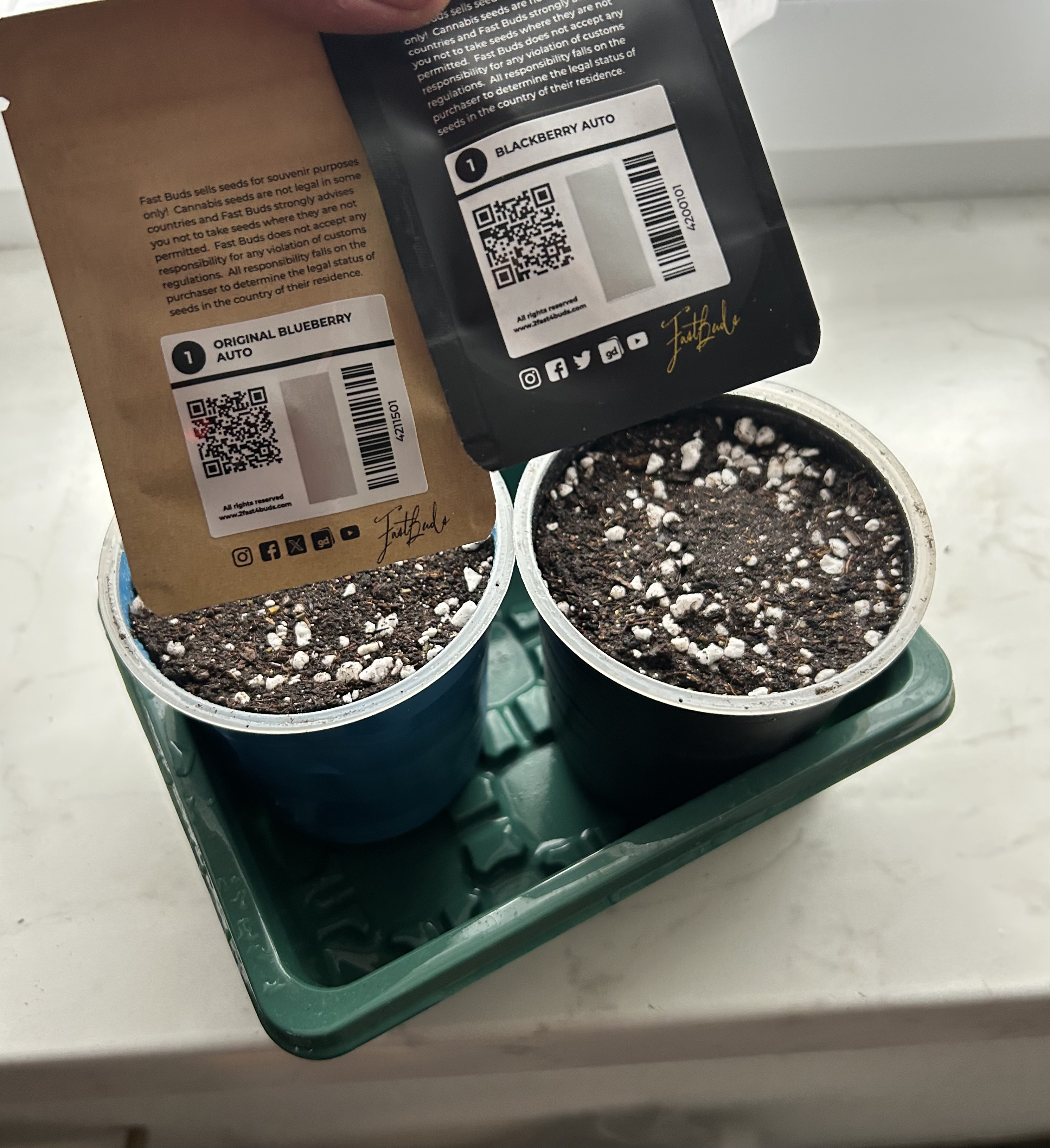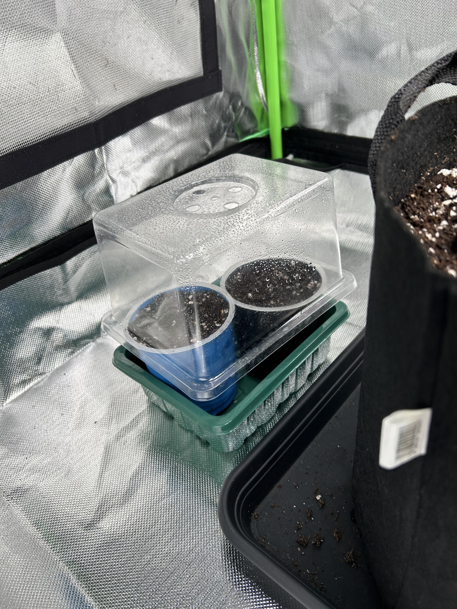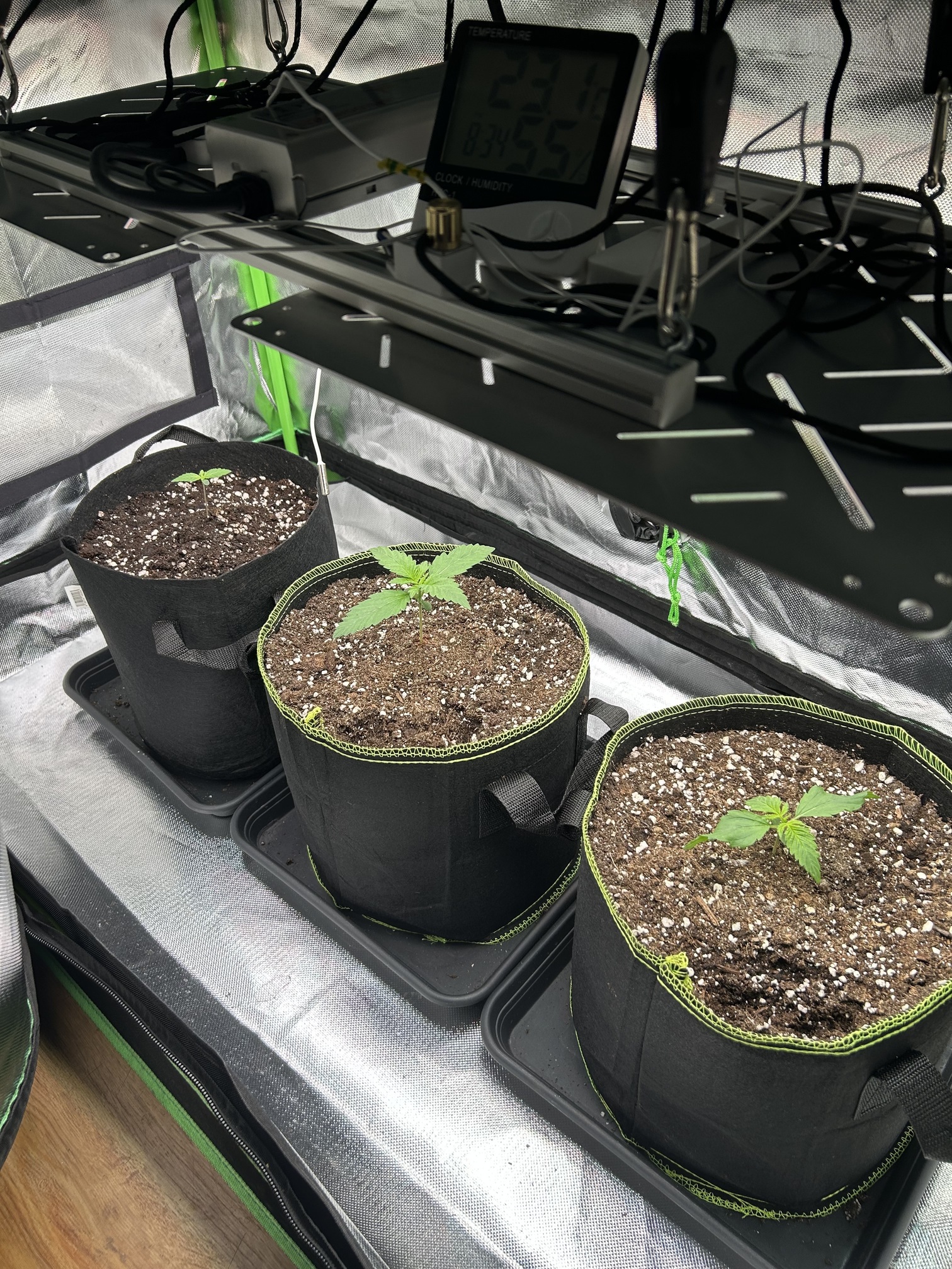 Hatte mal Langeweile und kam auf die glorreiche Idee 2 weitere Samen zu Keimen und die in 2 Plastikbecher mit durchbohrten Boden und 1:1 der gleiche Substrat wie die 11l Töpfe…(natürlich 20x weniger im Verhältnis ) zu züchten. Also ein Cupgrow