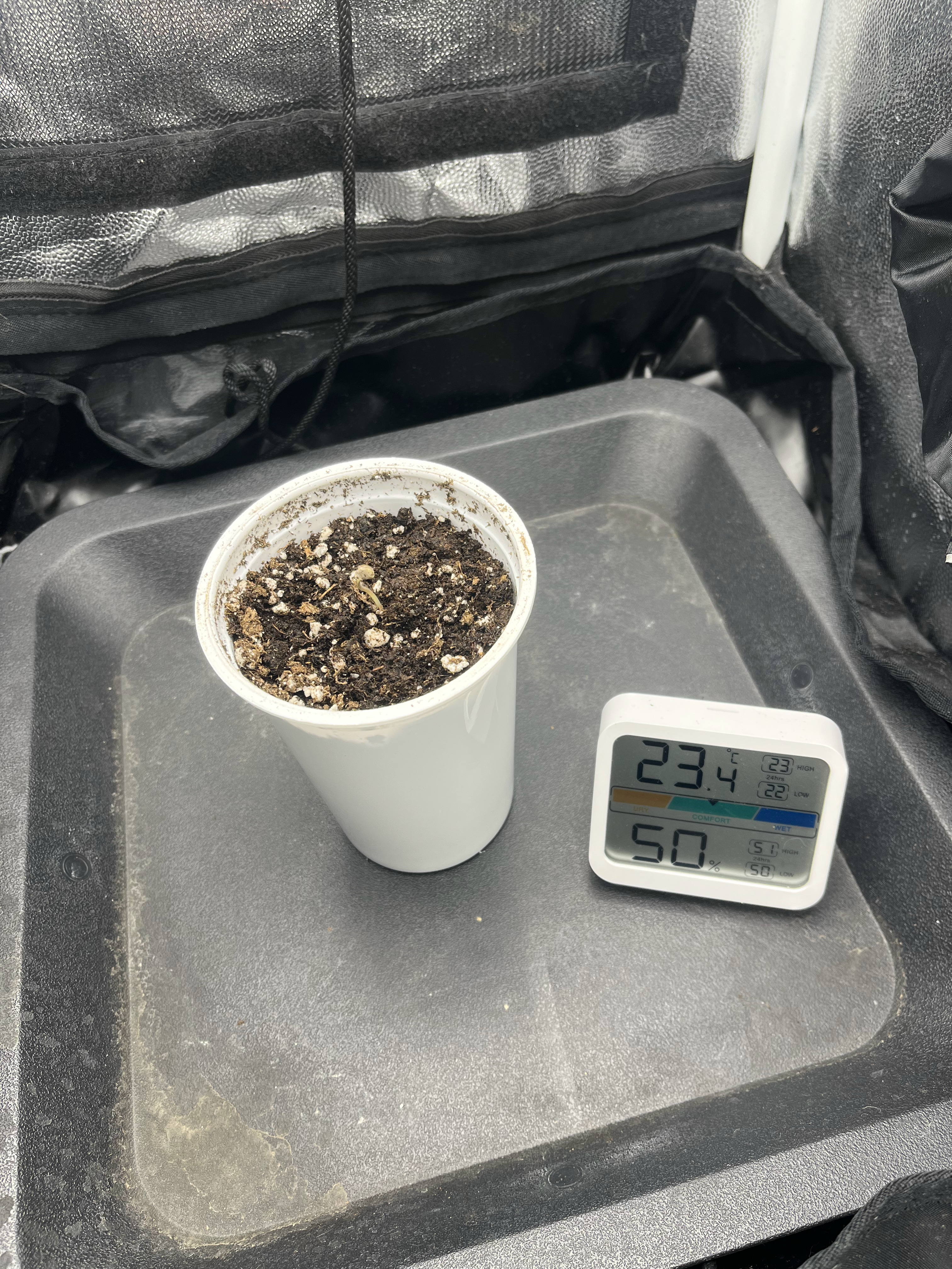 Die Luftwerte fand ich für diese Phase jetzt nicht so besonders, ich habe die Pflanze deswegen wieder abgedeckt. Ich denke das sollte jetzt so erstmal passen, sobald sich die Folgeblätter zeigen werde ich die Haube dann wieder abnehmen - natürlich werde ich 1-2 mal täglich frische Luft dran lassen .