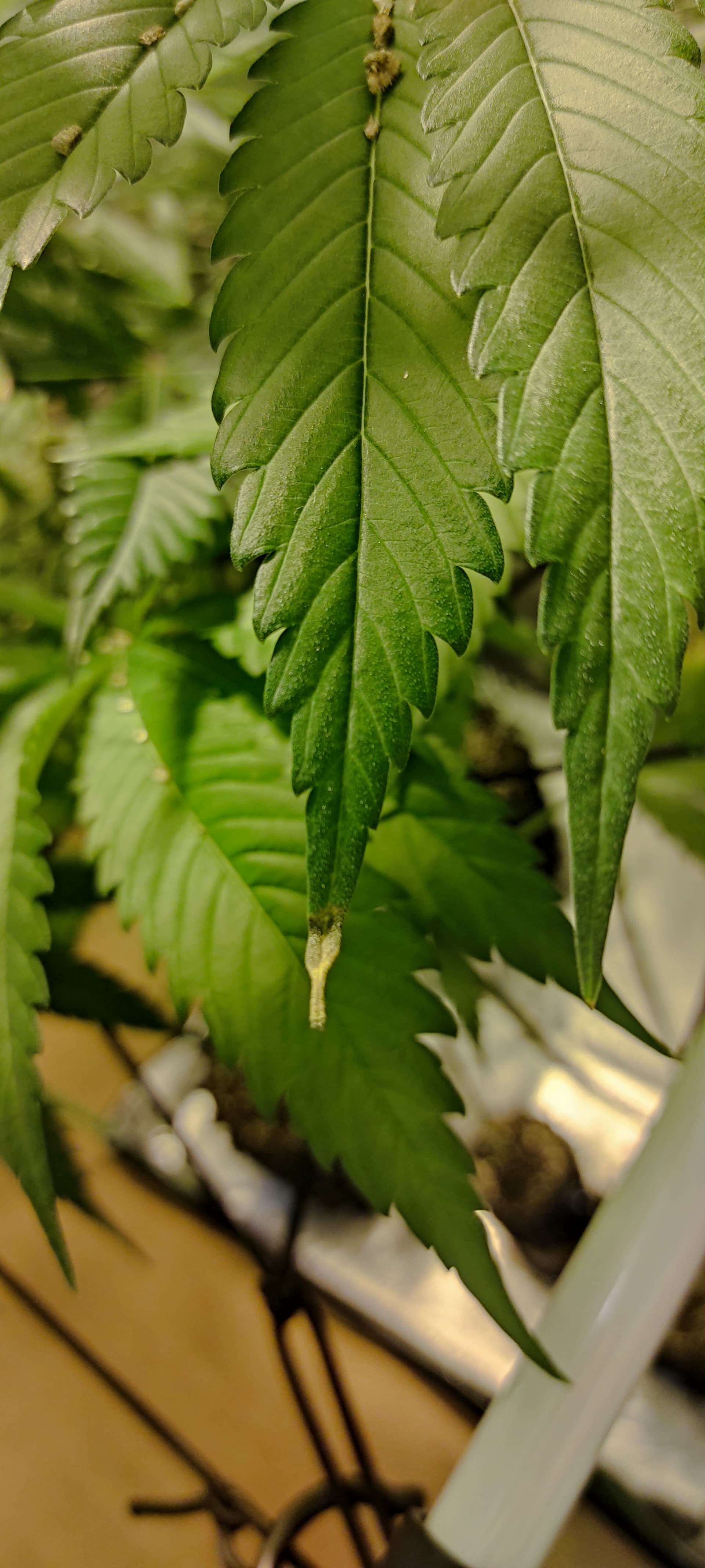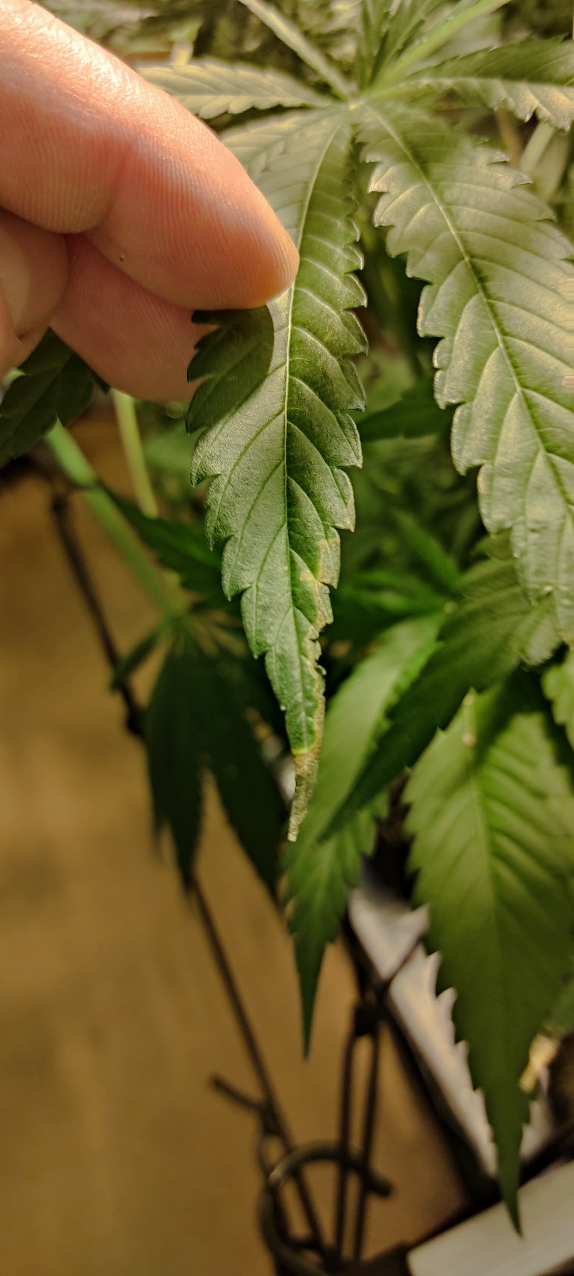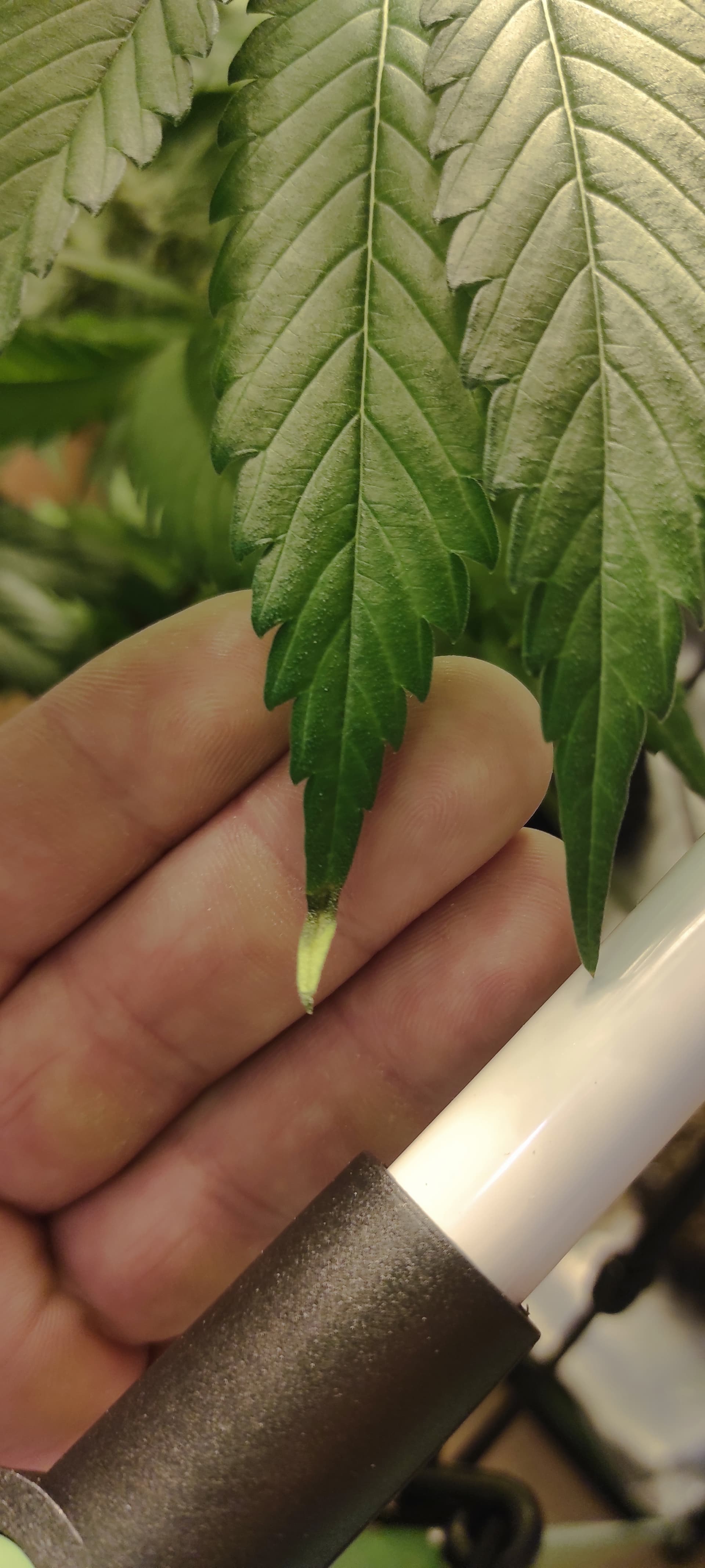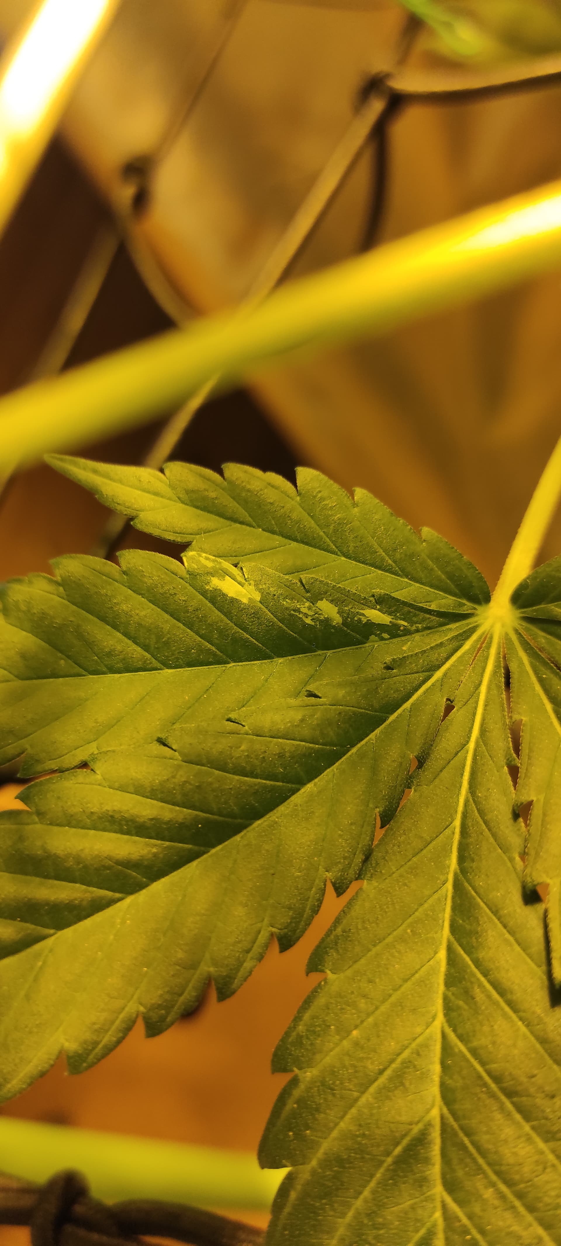 - Die Temperatur ist teilweise sehr hoch(>26°C), die Pflanzen haben zu wenig Abstand zur Lampe. Die Symptome sind aber alle an den mittleren Blättern.