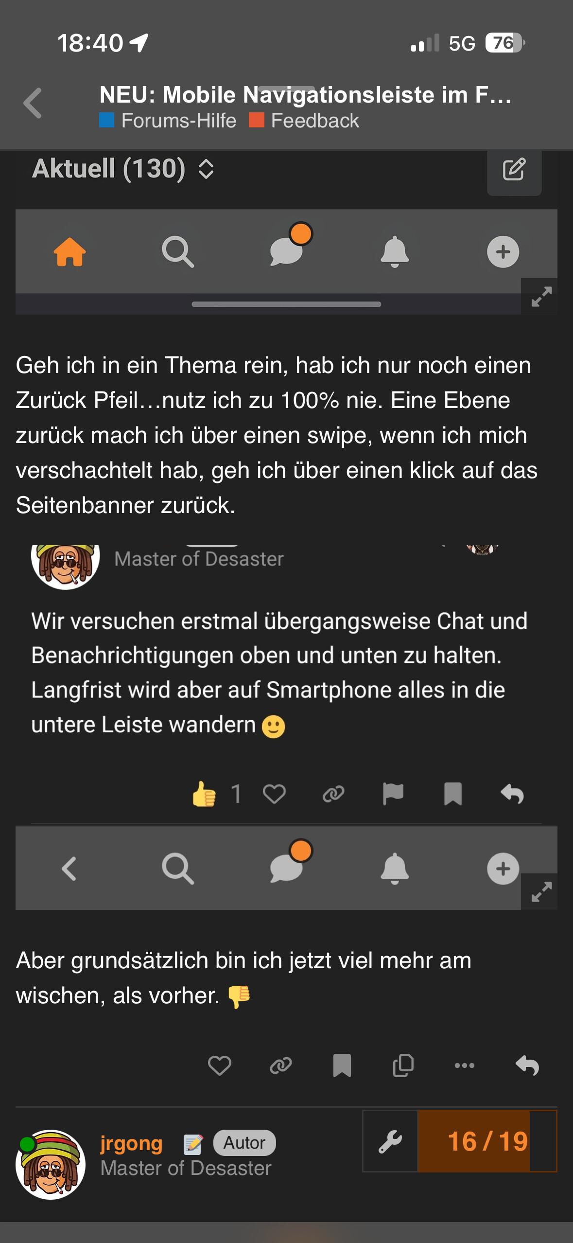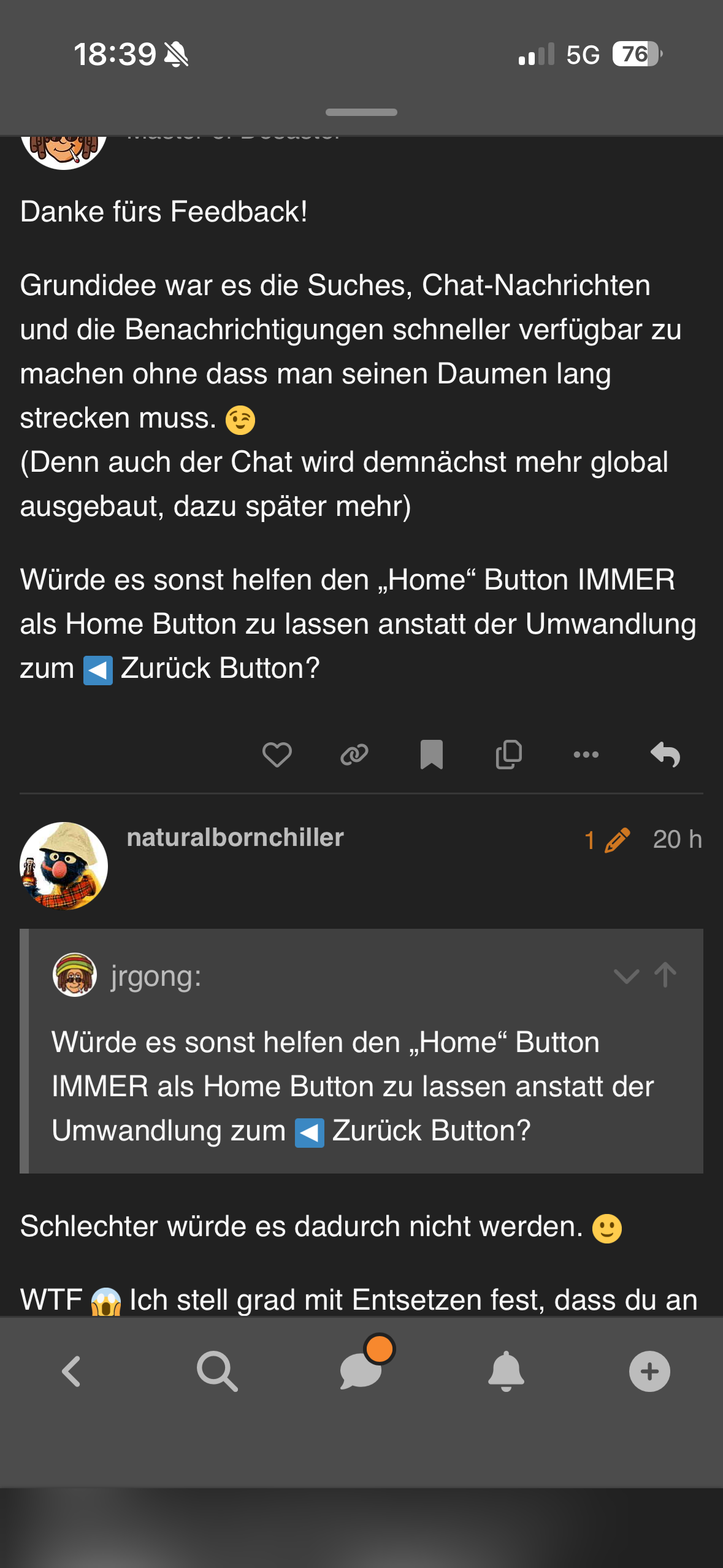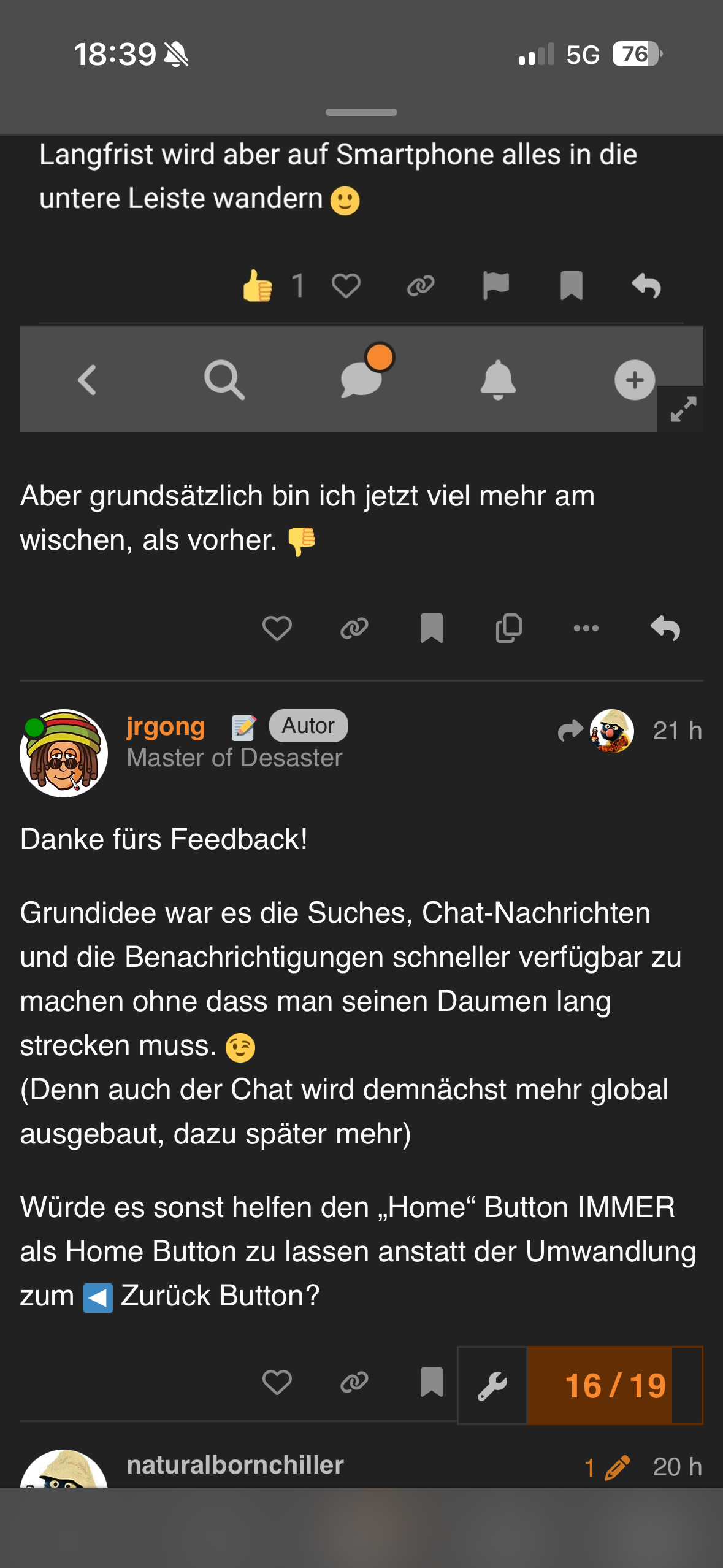 Oben fand ich besser, optisch, abgesehen vom Chat Punkt der die gleiche Orange Farbe hat wie eine Benachrichtigung in der Glocke. Auf den ersten Blick verwirrend. Erst bei Benachrichtigung im Chat wird der orange Punkt grün, evtl Mal eine andere Grundfarbe Farbe..chat- Glocke.