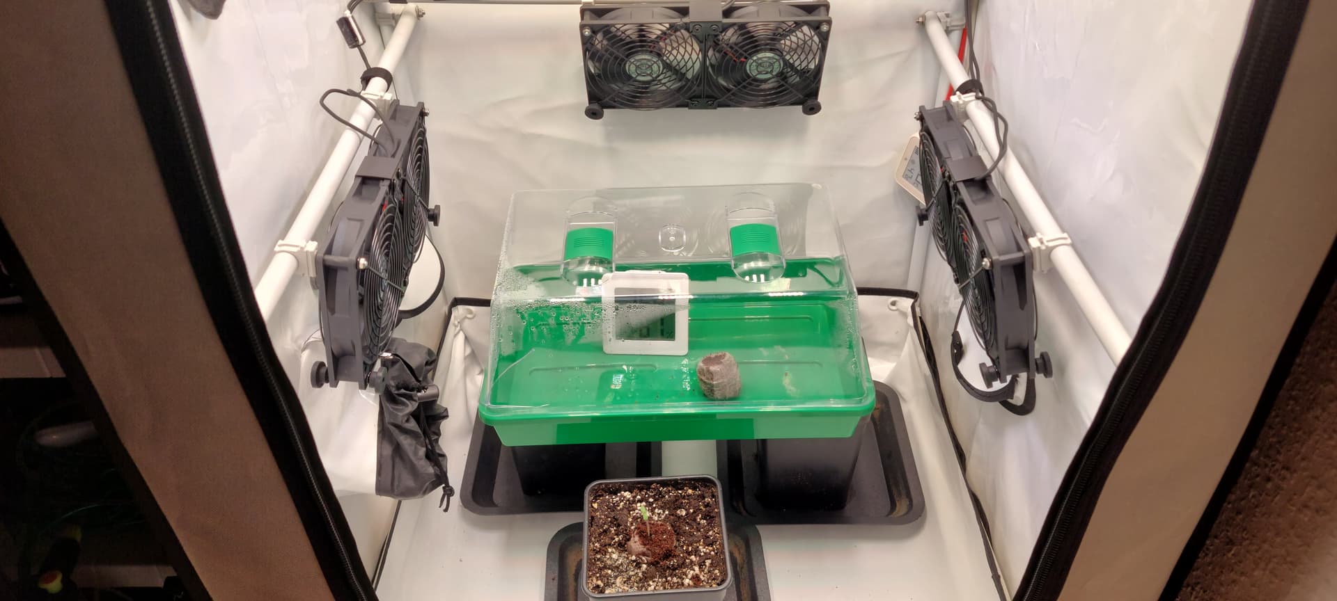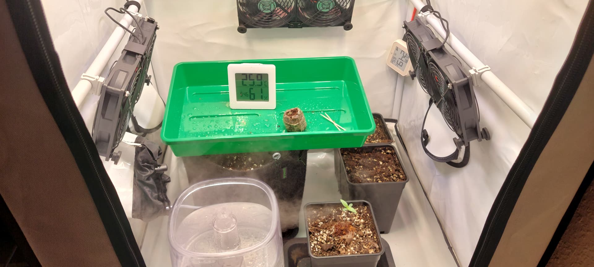 Immerhin gehts mit dem Thema VPD etwas aufwärts, konnte den jetzt echt gut im Ziellevel halten indem der Vernebler bei unter 65% LF einschaltet und über 80% ausgeht. Wenn Licht aus ist >> Kein Nebel..